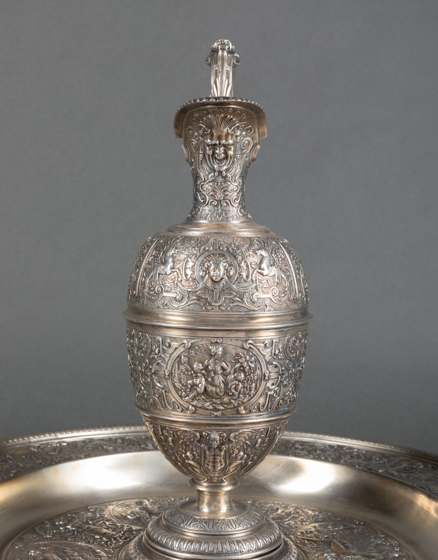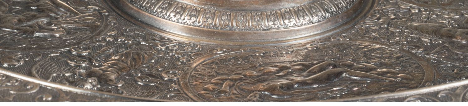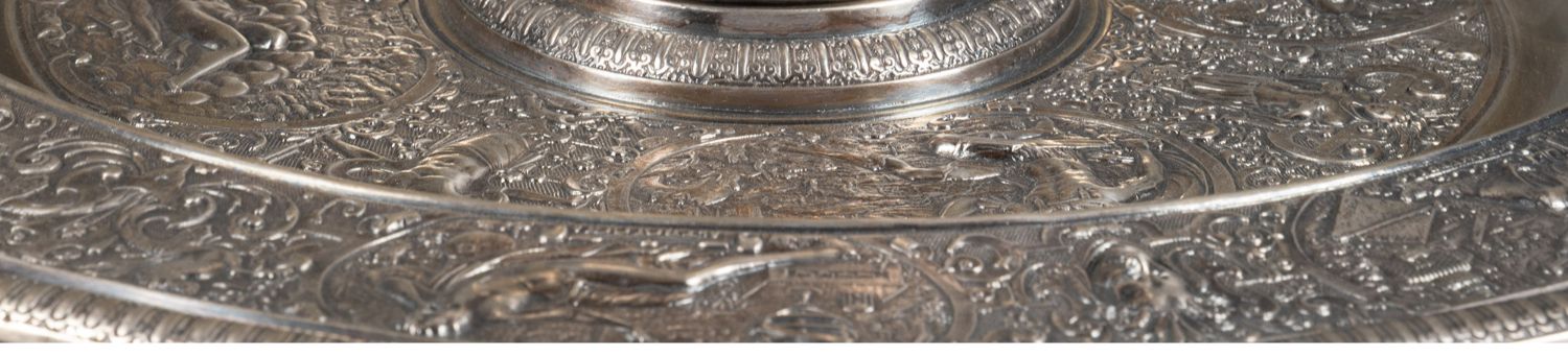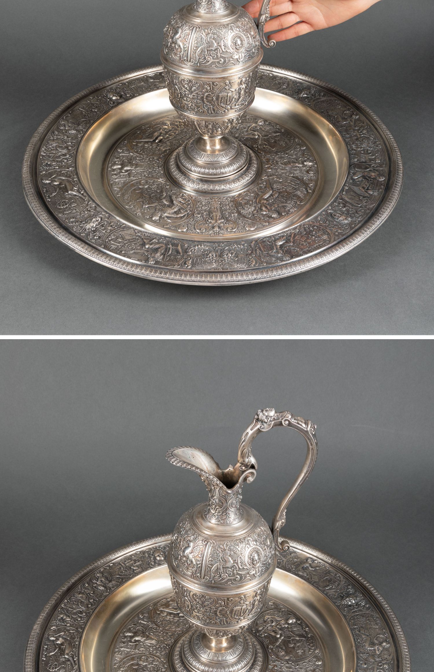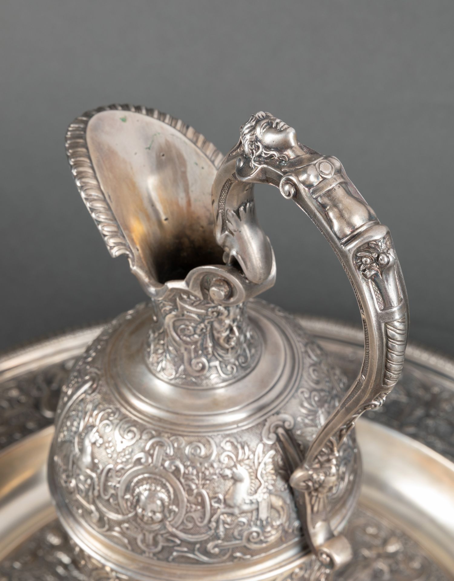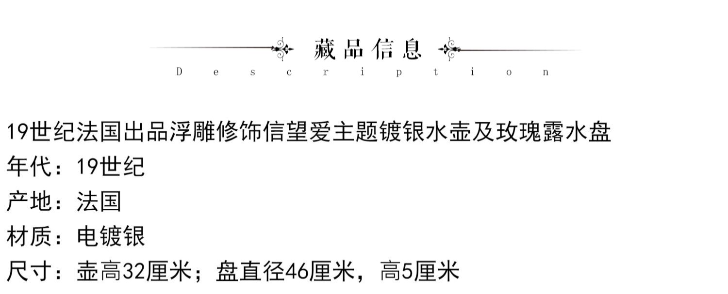 独角鹿西洋古董银器法国浮雕信望爱主题镀银水壶玫瑰露水盘