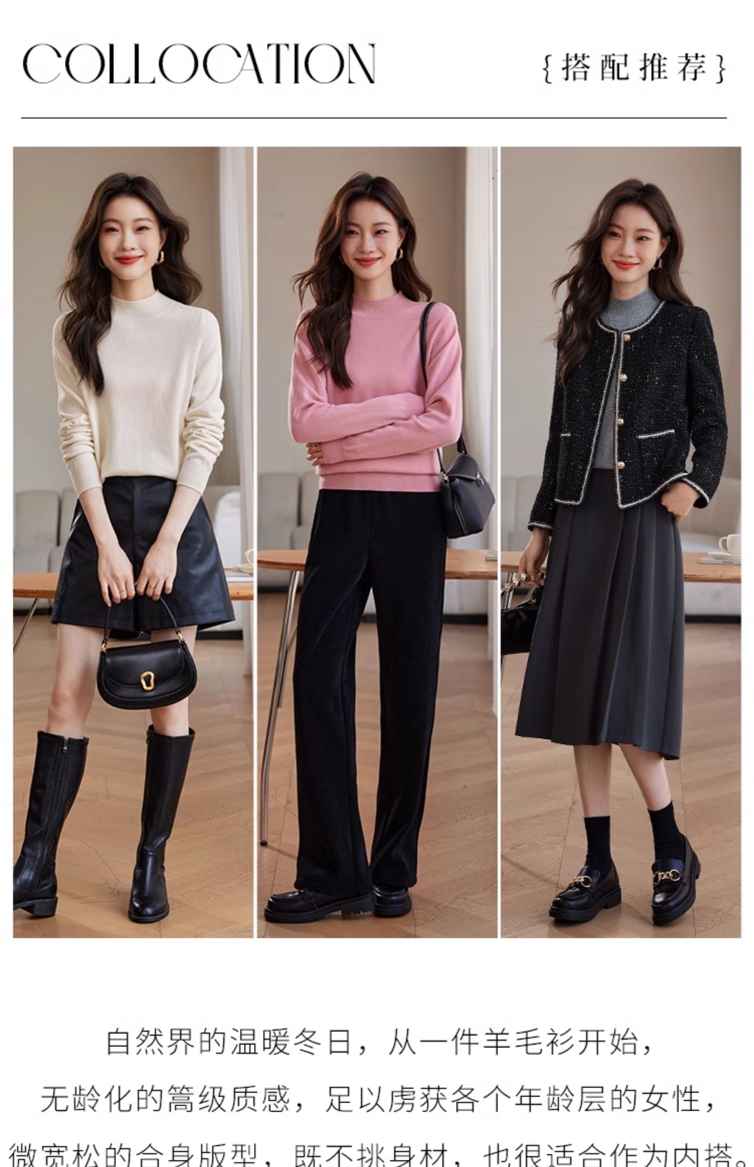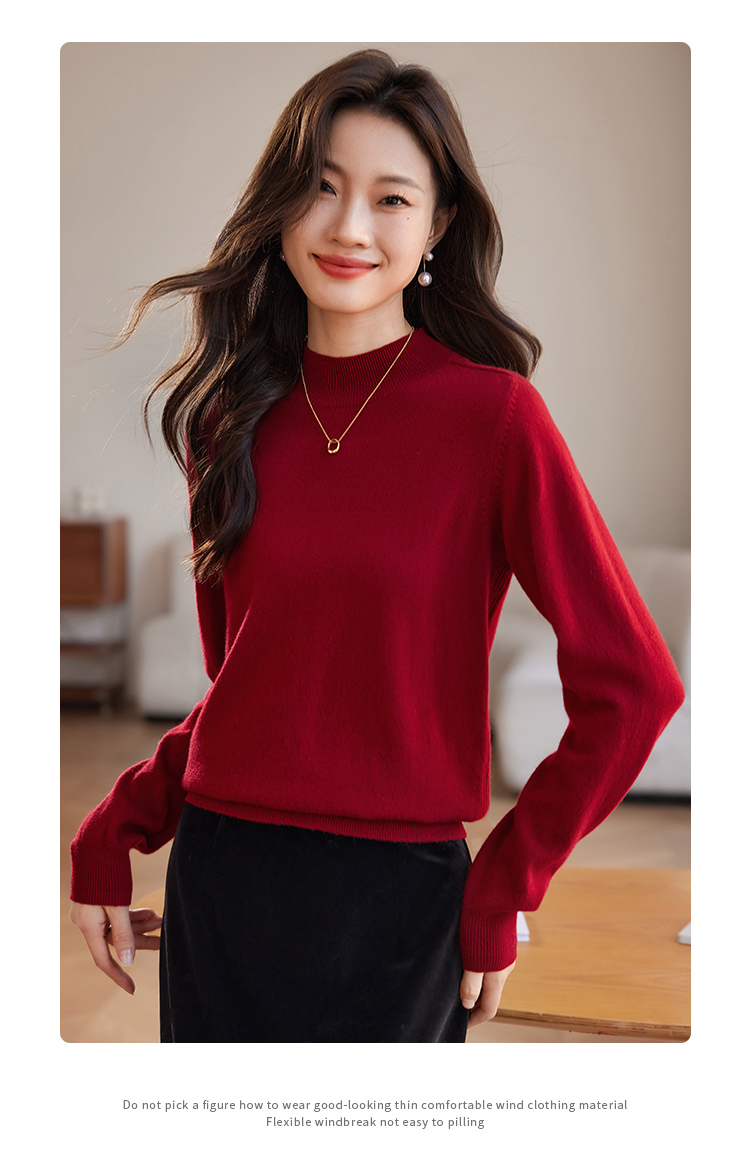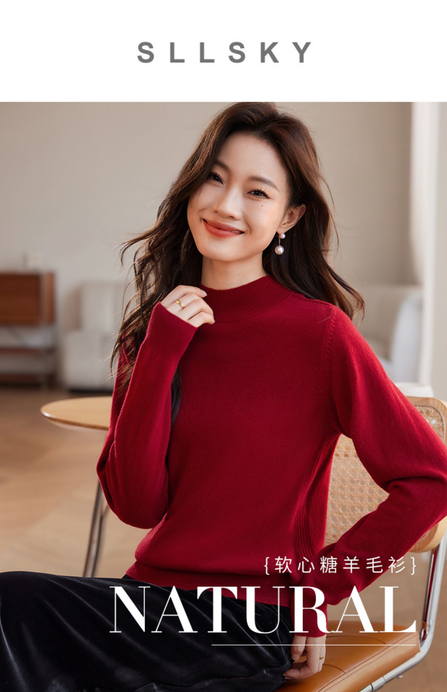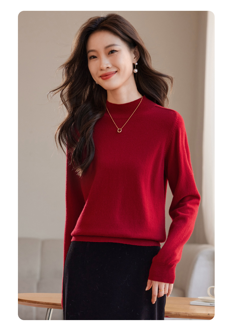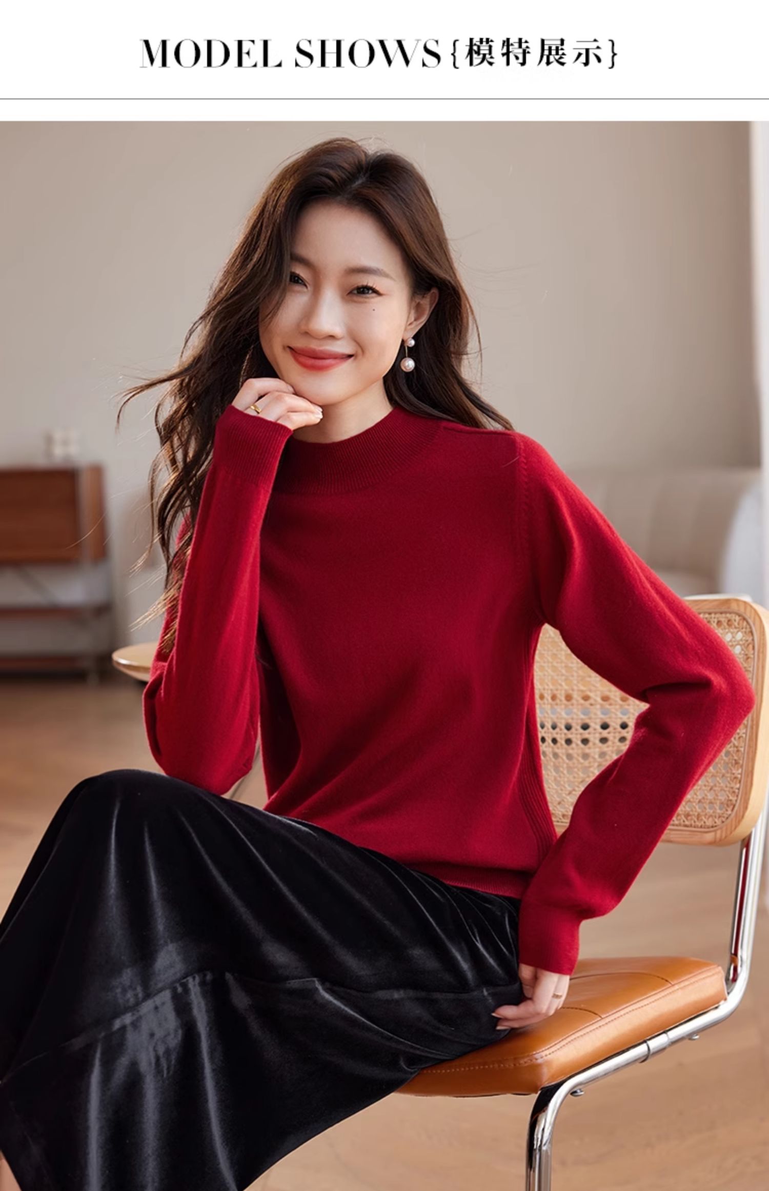 【年货节】熙世界红色100%纯羊毛衫女秋冬款半高领毛衣宽松羊绒针织打底衫
