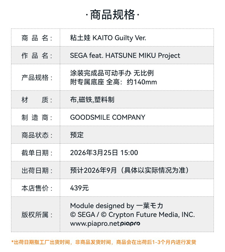 【GSC预售定金】粘土娃 KAITO Guilty Ver. 手办模玩 SEGA feat. HATSUNE MIKU Project