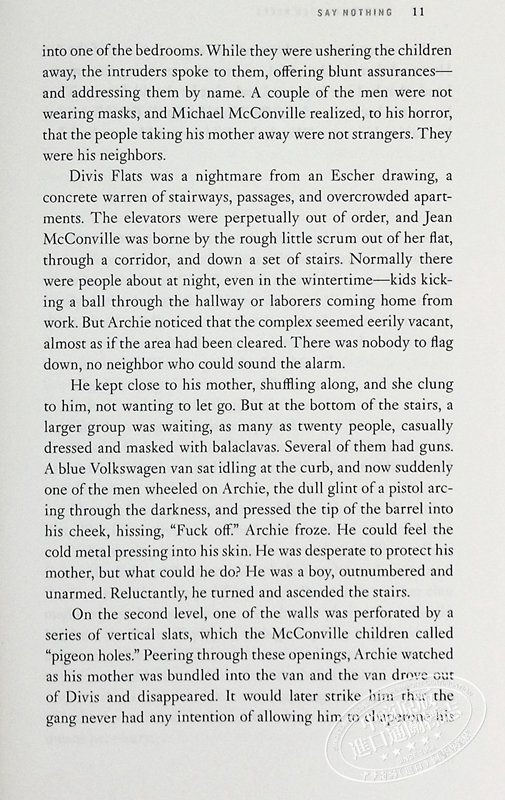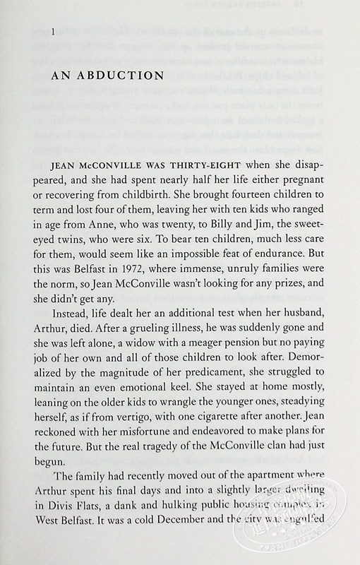 “1972 年,蒙面入侵者将 38 岁的寡妇、10 个孩子的母亲 Jean McConville 从她位于贝尔法斯特的家中拖走。在这本报道细致的书中 - 节奏与小说一样精细 - Keefe 以 McConville 的谋杀案为棱镜,讲述了北爱尔兰动乱的历史。通过采访冲突双方的人士,他将那个时代的悲剧性破坏和浪费变成了一部令人震惊、扣人心弦的传奇故事。” --《纽约时报书评》