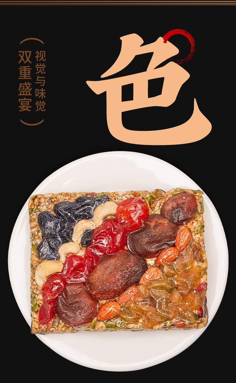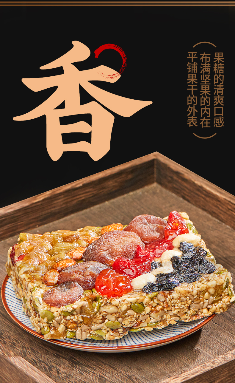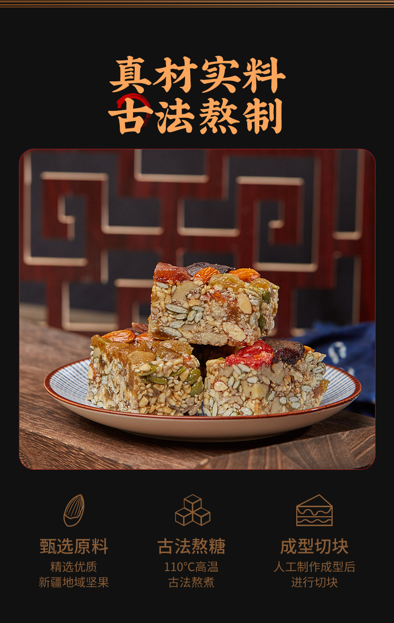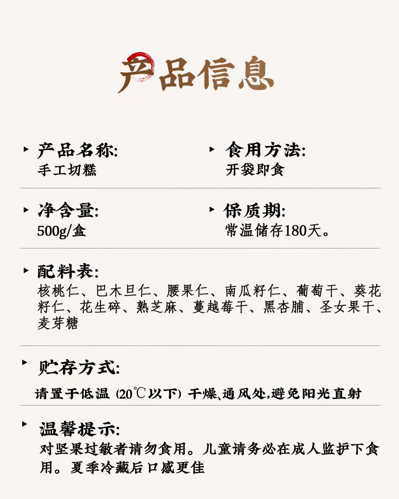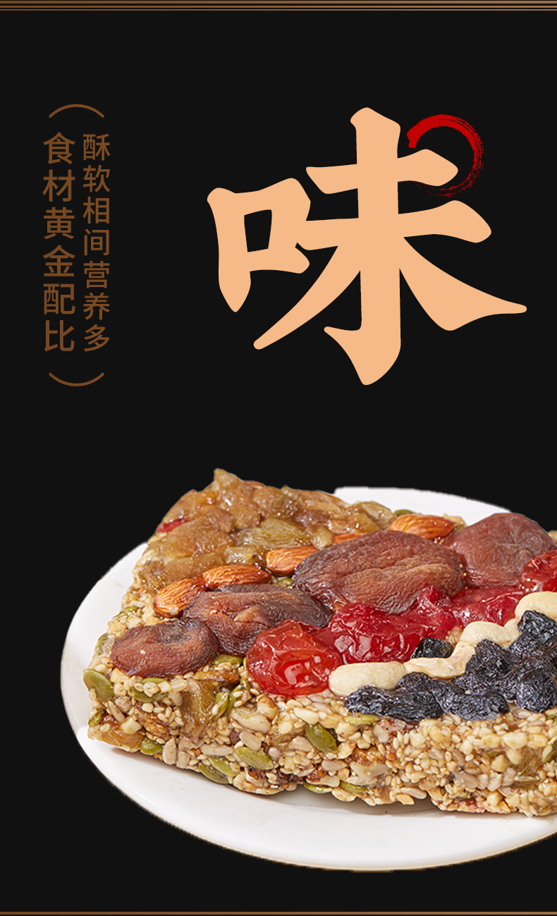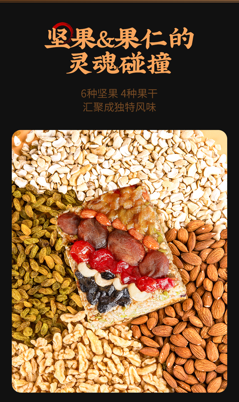 【配料】核桃仁,巴木旦仁,腰果仁,南瓜籽仁,葵花籽仁,花生碎,圣女果干,熟芝麻,葡萄干,草越梅干,黑杏脯