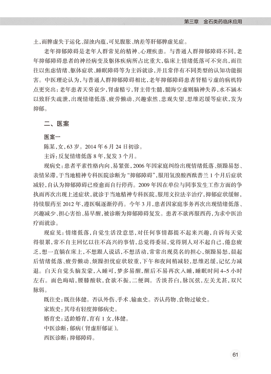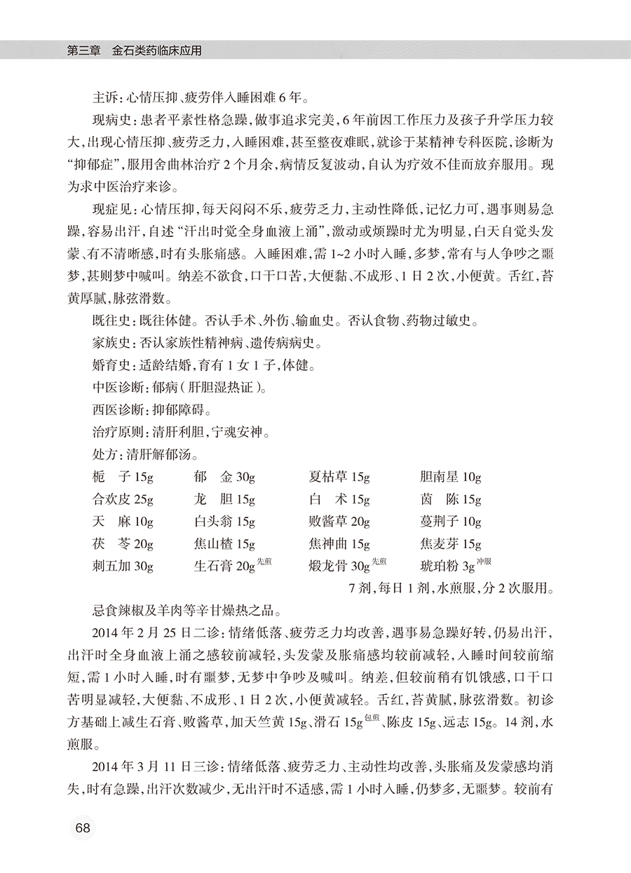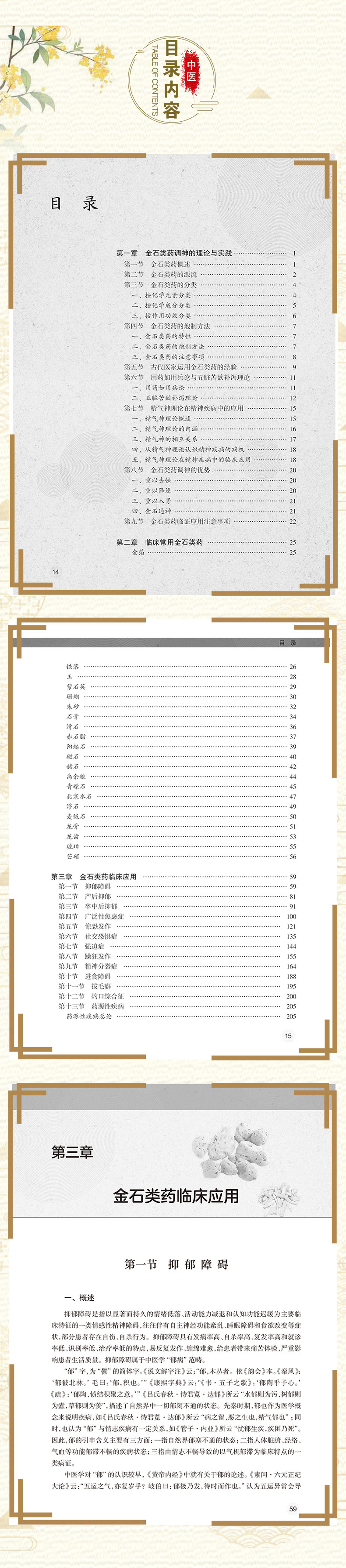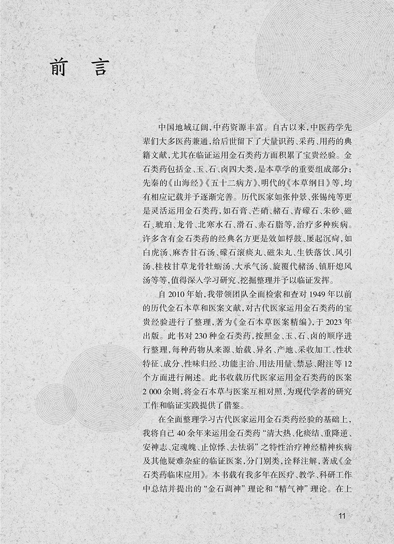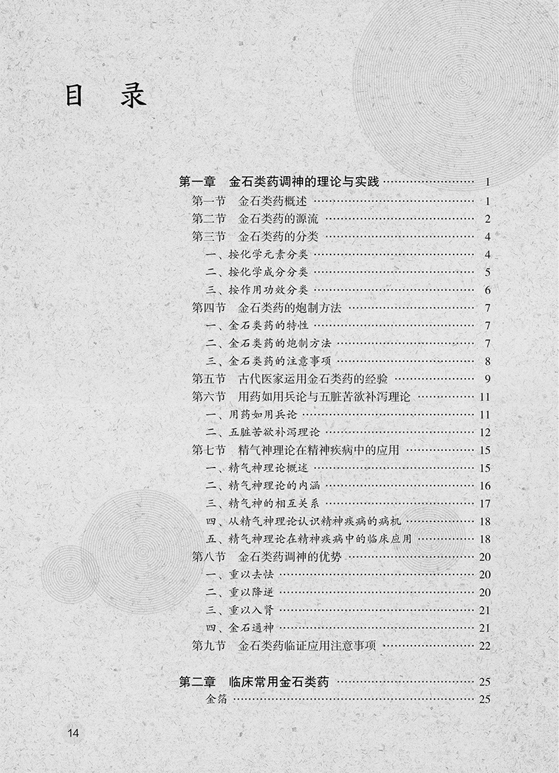 全书共有3章。第一章围绕金石类药调神的理论,系统介绍了金石类药的源流、金石类药的分类、金石类药的炮制方法、古代医家运用金石类药的经验、用药如用兵论与五脏苦欲补泻理论、精气神理论在精神疾病中的应用、金石类药调神的优势,以及金石类药临证应用注意事项等。第二章介绍了21种当前临床常用的金石类药,从药物的来源、始载、异名、产地、采收加工、性状特征、成分、性味归经、功能主治、用法用量、禁忌、临床应用、古代医案涉及病种等方面进行了介绍。第三章从临床应用的角度,围绕46种疾病,结合133个典型医案(含汤方142首、丸方9首),阐述了作者运用金石类药的经验和临证体会。