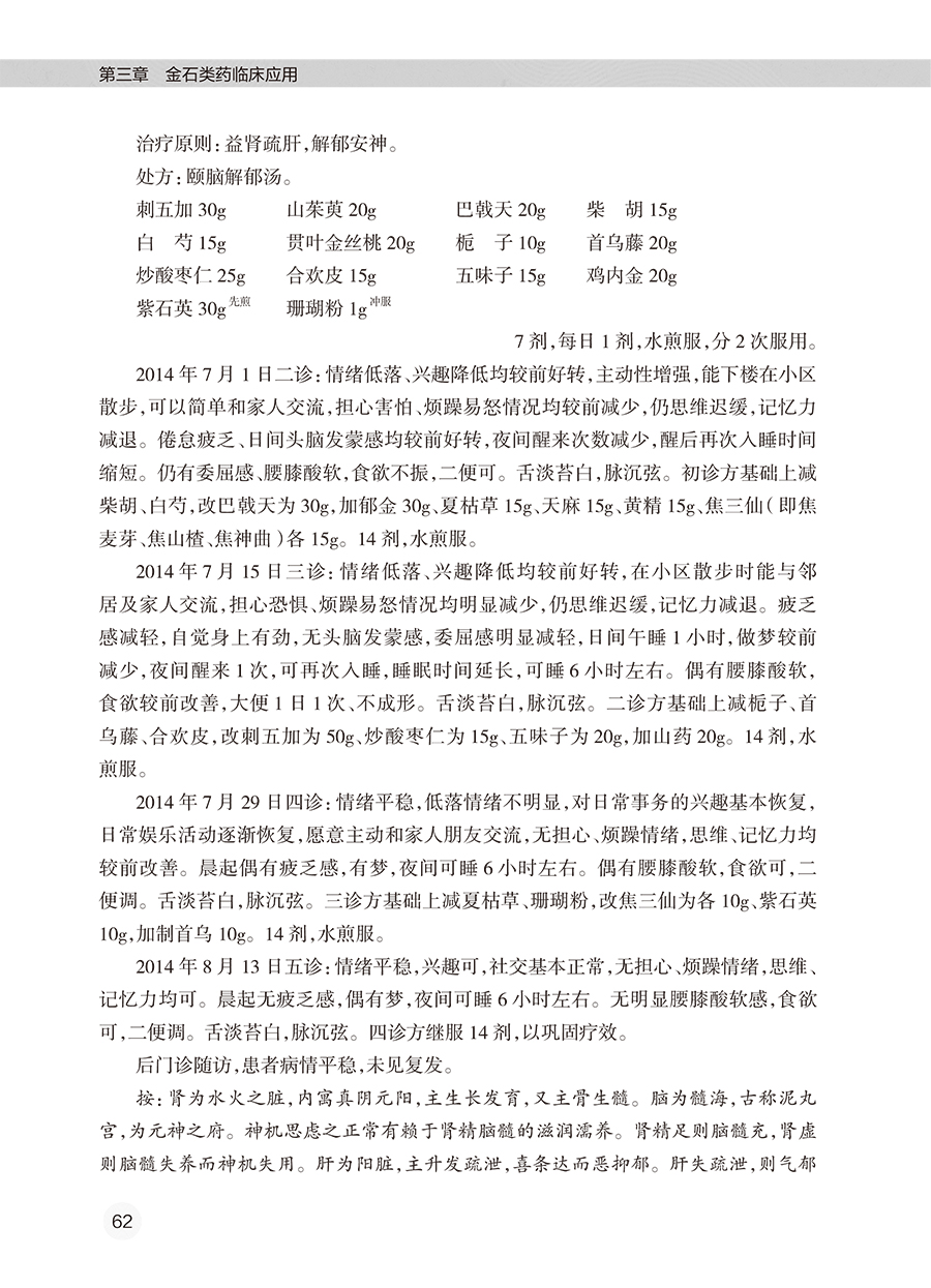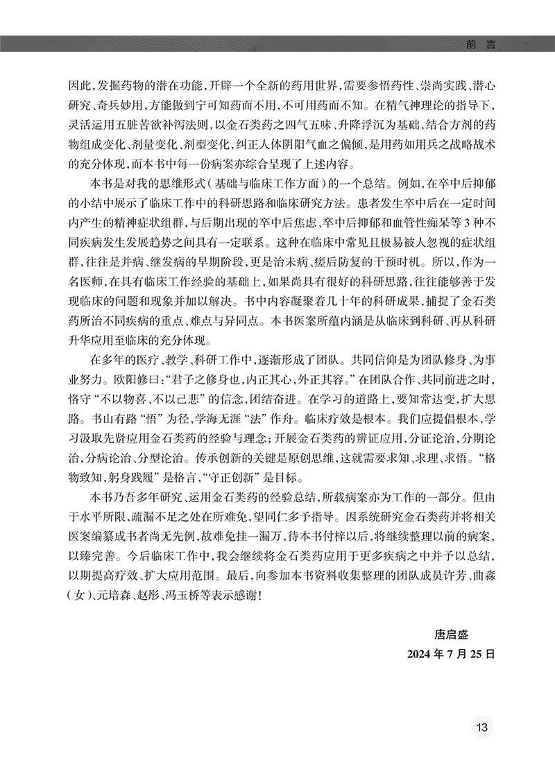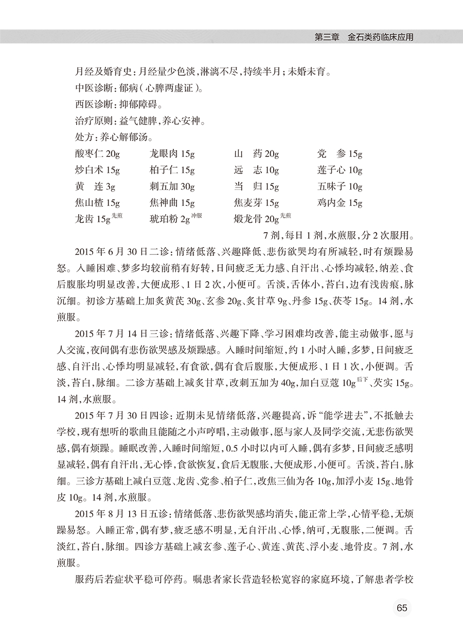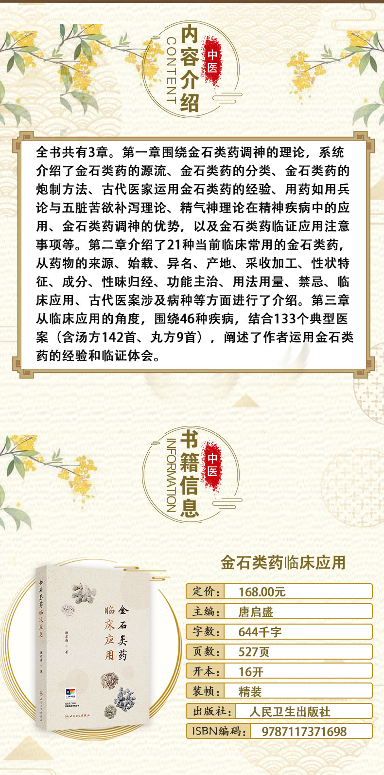 全书共有3章。第一章围绕金石类药调神的理论,系统介绍了金石类药的源流、金石类药的分类、金石类药的炮制方法、古代医家运用金石类药的经验、用药如用兵论与五脏苦欲补泻理论、精气神理论在精神疾病中的应用、金石类药调神的优势,以及金石类药临证应用注意事项等。第二章介绍了21种当前临床常用的金石类药,从药物的来源、始载、异名、产地、采收加工、性状特征、成分、性味归经、功能主治、用法用量、禁忌、临床应用、古代医案涉及病种等方面进行了介绍。第三章从临床应用的角度,围绕46种疾病,结合133个典型医案(含汤方142首、丸方9首),阐述了作者运用金石类药的经验和临证体会。