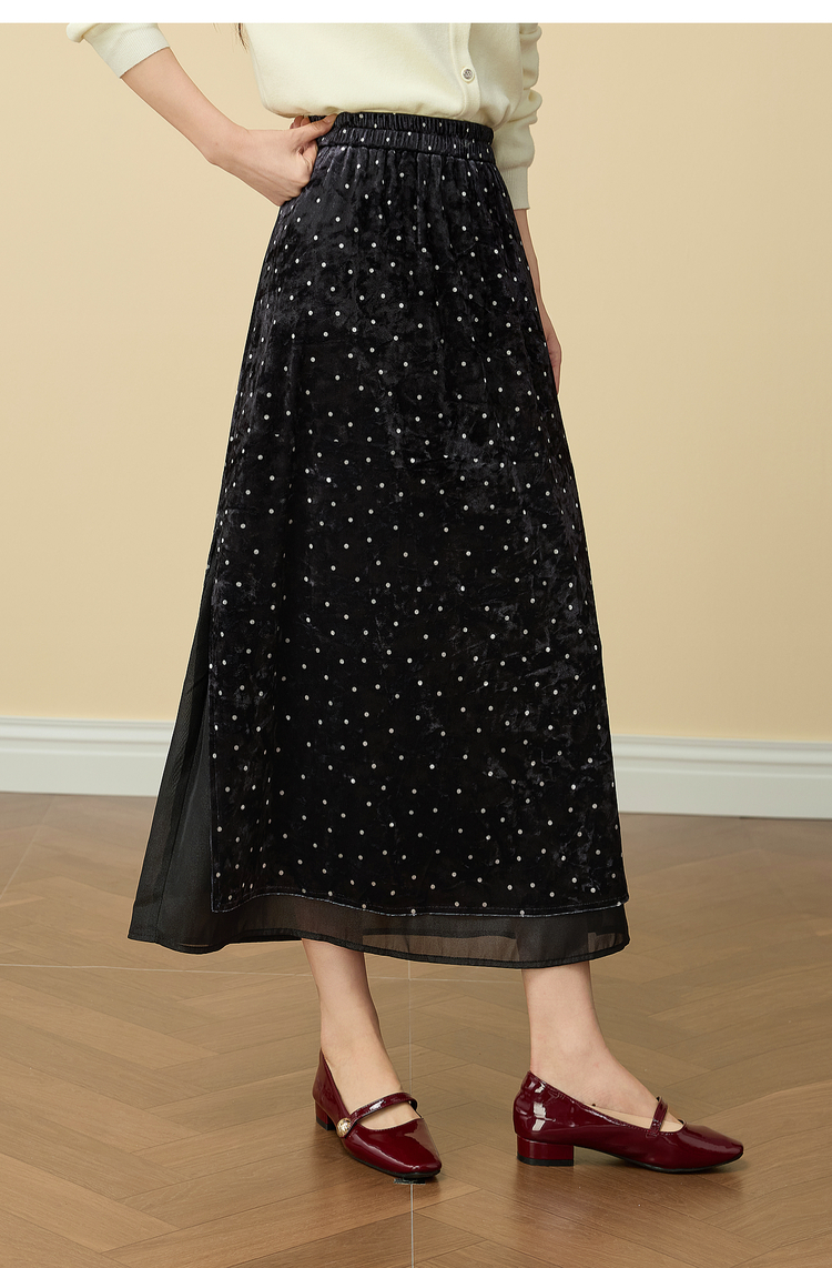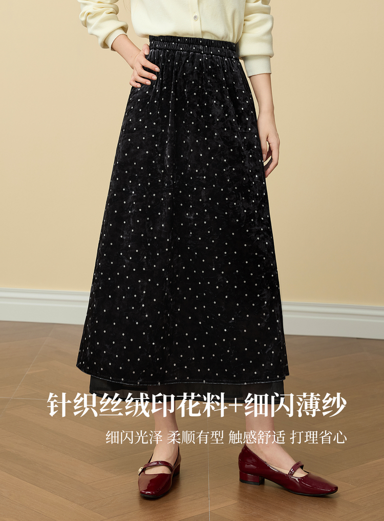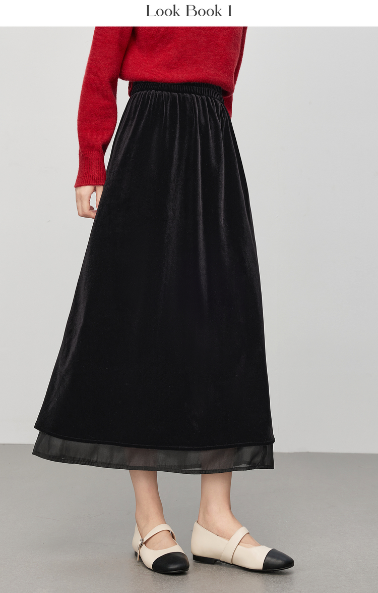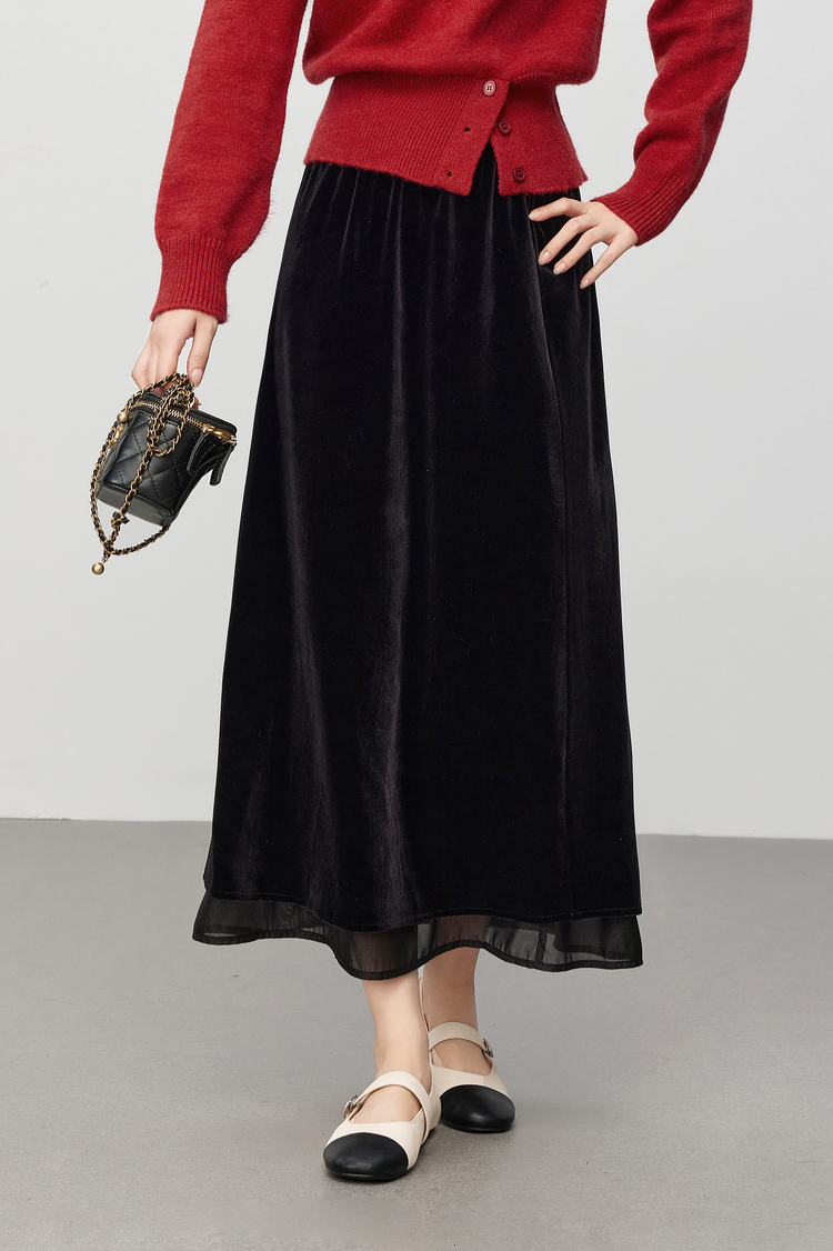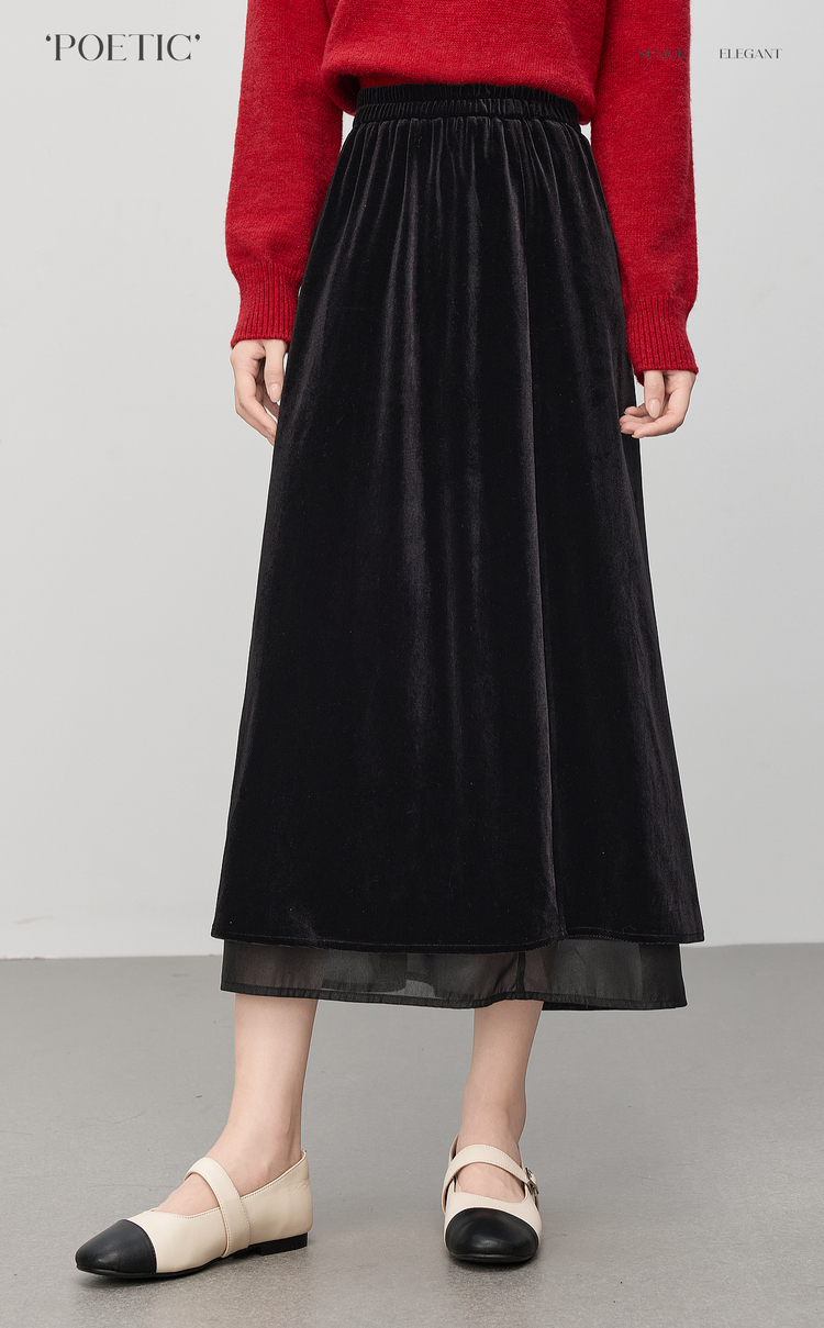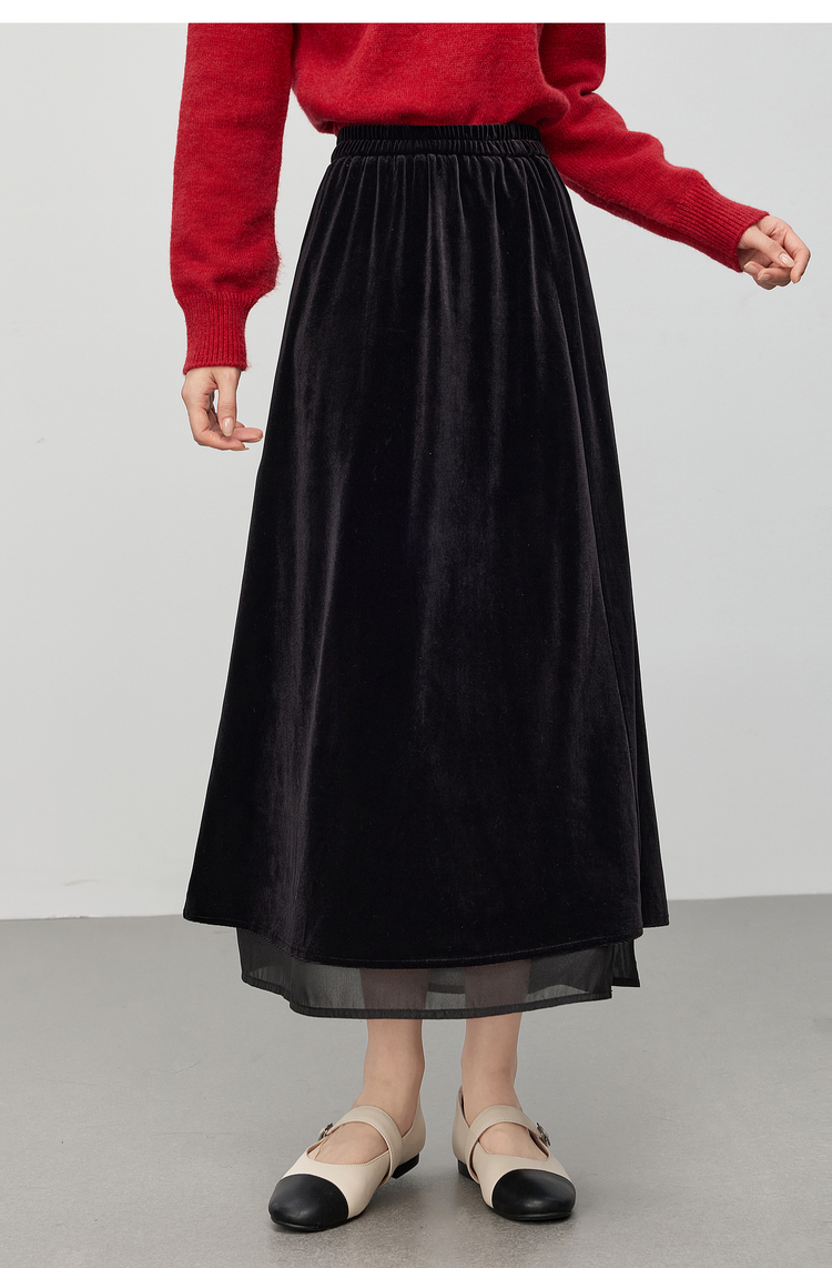 【12/03新品】熙世界法式千金光泽感丝绒半身裙女秋冬高腰网纱拼接中长款A字裙