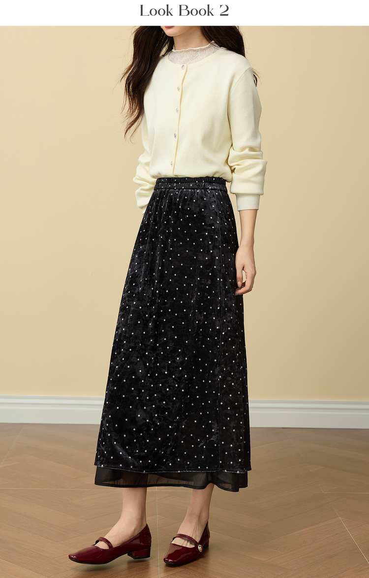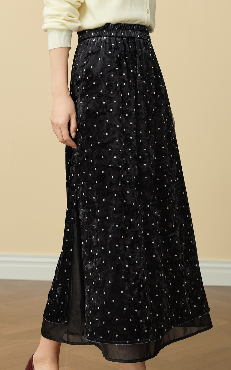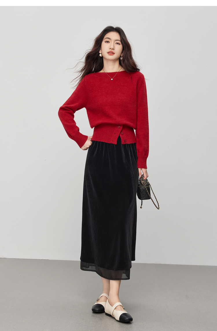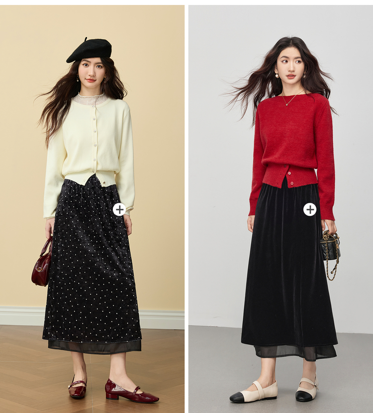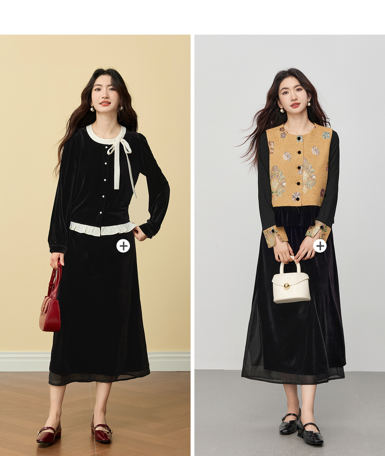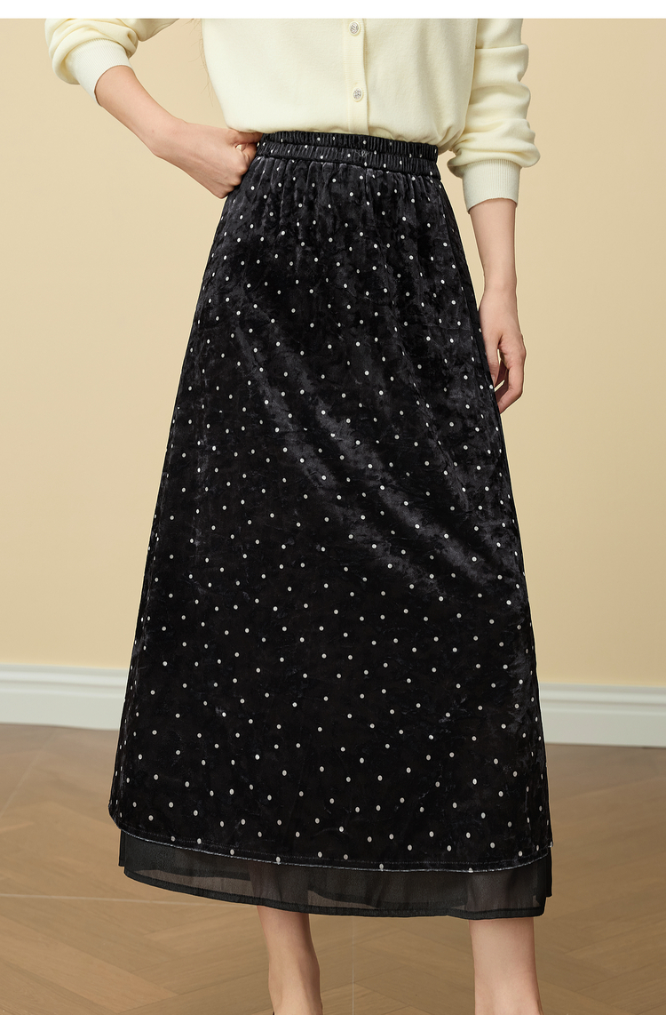 【12/03新品】熙世界法式千金光泽感丝绒半身裙女秋冬高腰网纱拼接中长款A字裙
