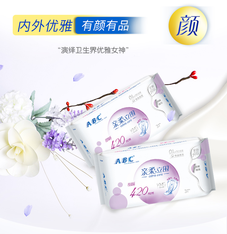 ABC 亲柔立围 棉柔表层 0.1cm轻透薄超长夜用卫生巾420mm*3片(舒适防侧漏)