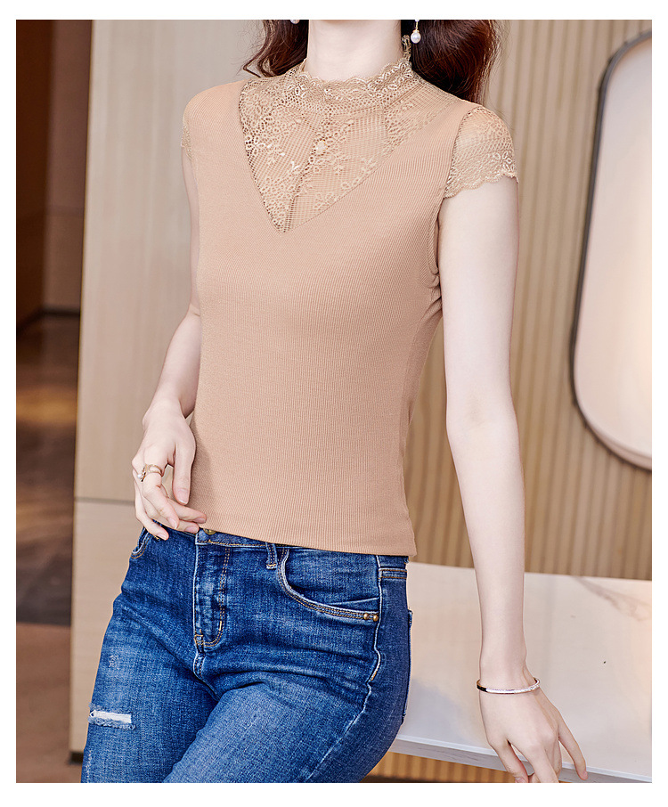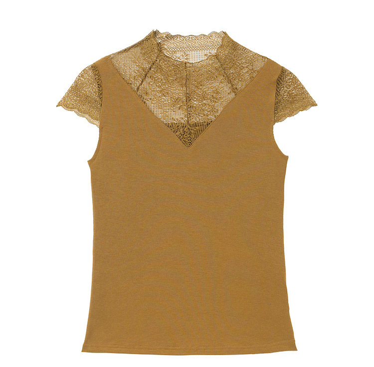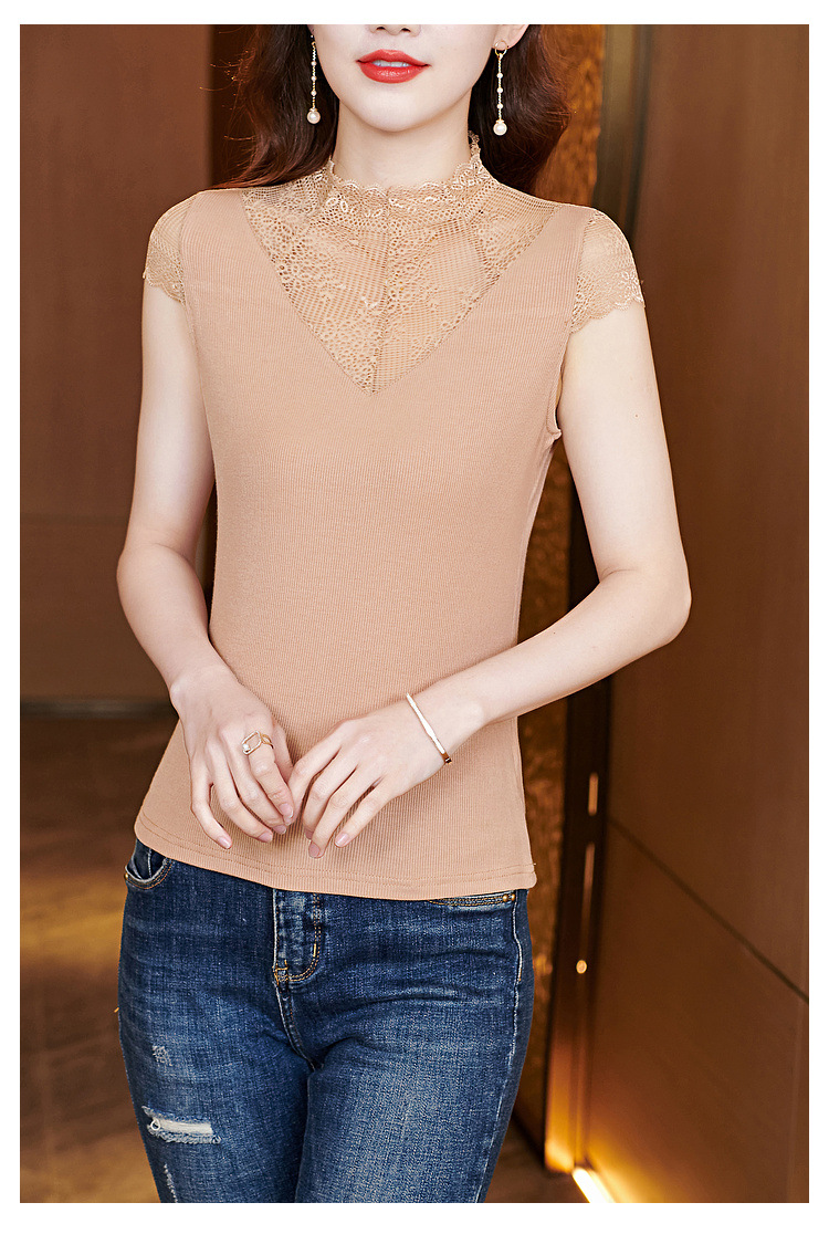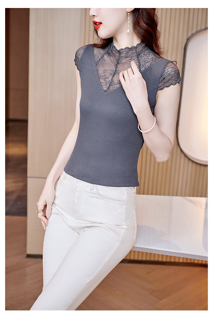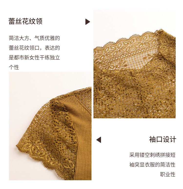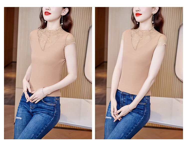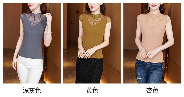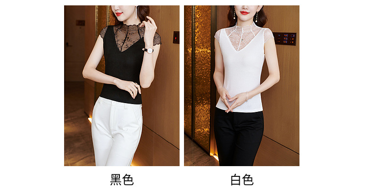 新款莫代尔拼接蕾丝半高领打底衫百搭收腰显瘦短袖T恤KQL-E001M6531