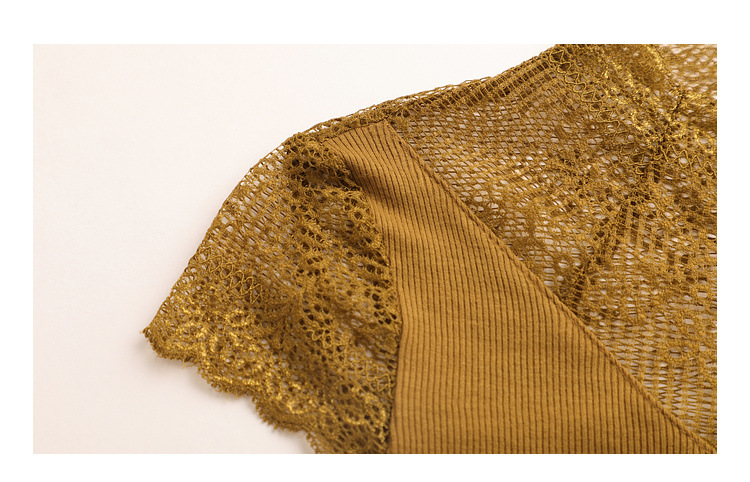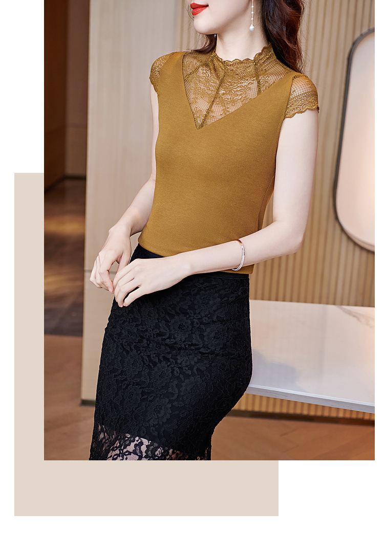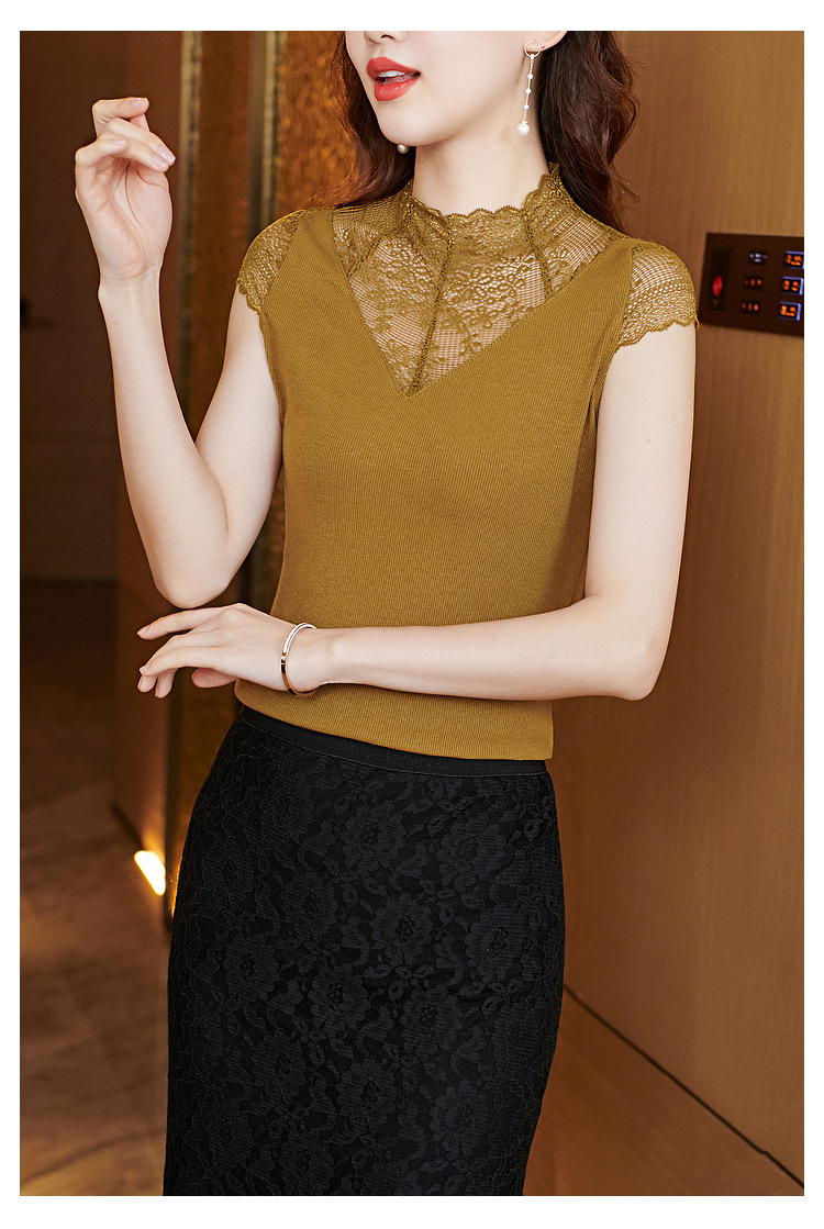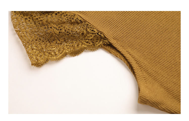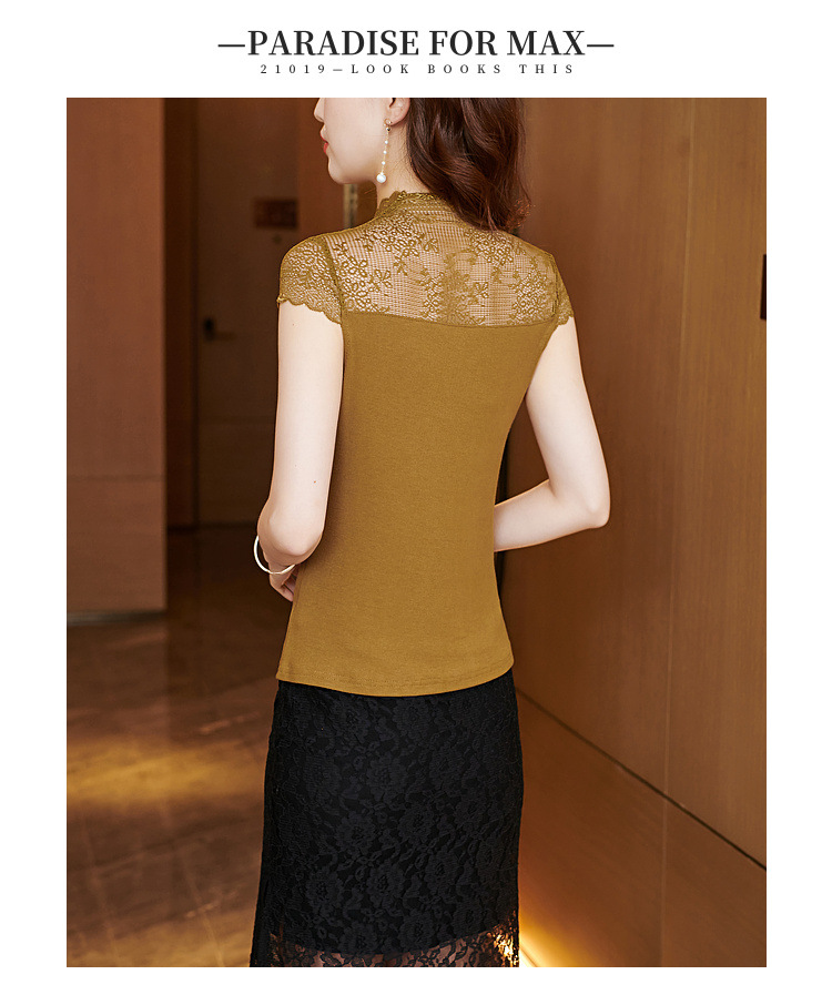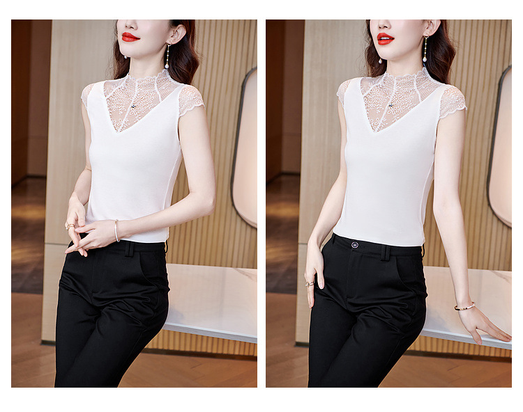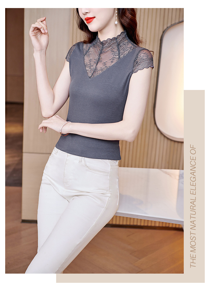 新款莫代尔拼接蕾丝半高领打底衫百搭收腰显瘦短袖T恤KQL-E001M6531