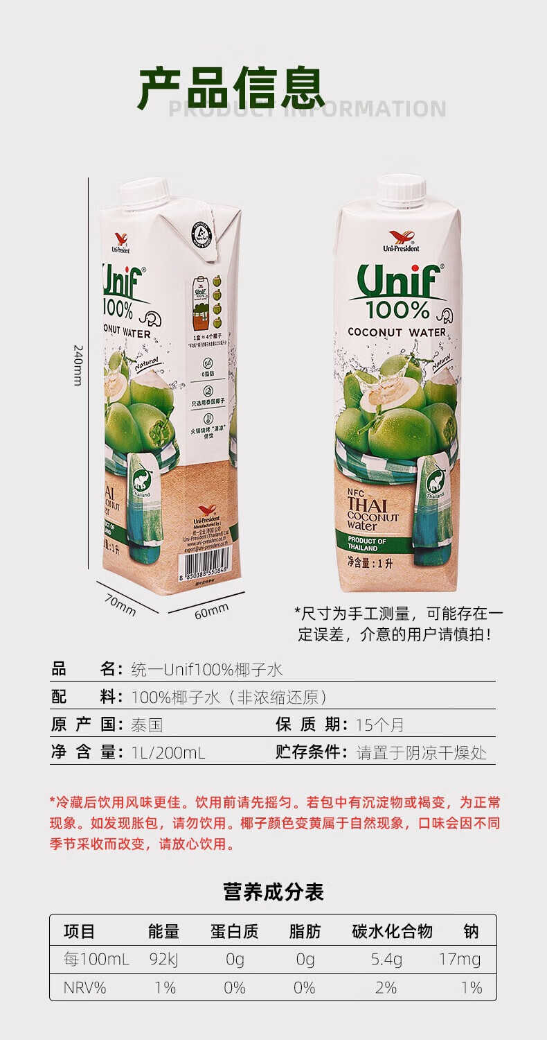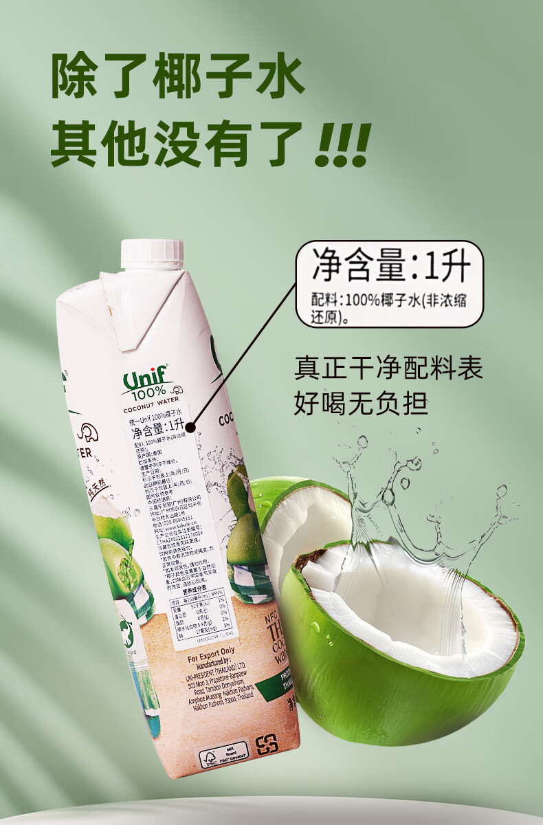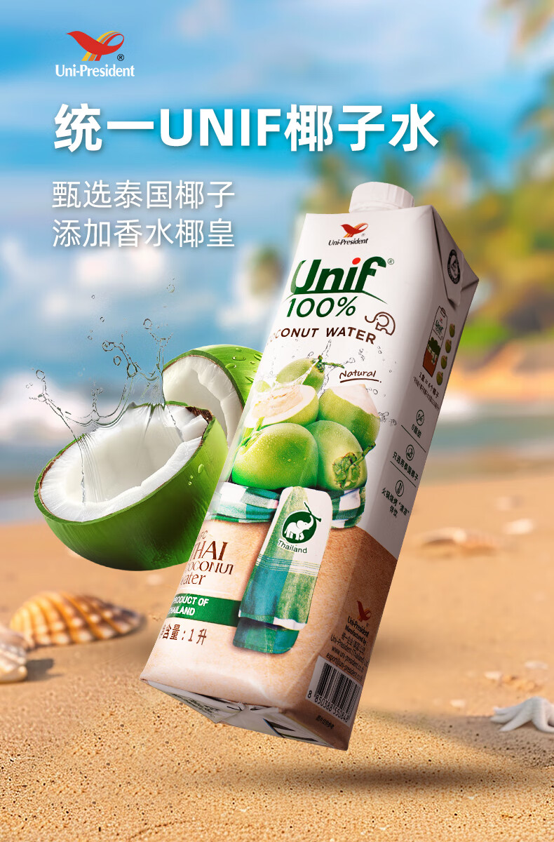 Unif统一100%椰子水1L/200ml 甄选泰国椰子添加香水椰皇 025742/025743