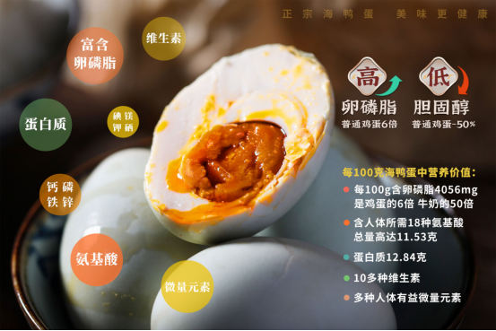 营养价值高 ·1、卵磷脂含量高,有助于大脑发育。每100克海鸭蛋中卵磷脂≥3700mg,比牛奶高出50倍,比普通鸡蛋高6倍之多。 ·2、富含人体日常所需的多种微量元素。蛋白质含量≥11克,氨基酸总量≥11克。富含钙、磷、铁、锌、碘、镁、钾、硒等多种对人体有益的微量元素和维生 素,且胆固醇含量较低,卵磷脂高,无腥臭味,适宜老人、小孩食用,乃蛋中佳品。
