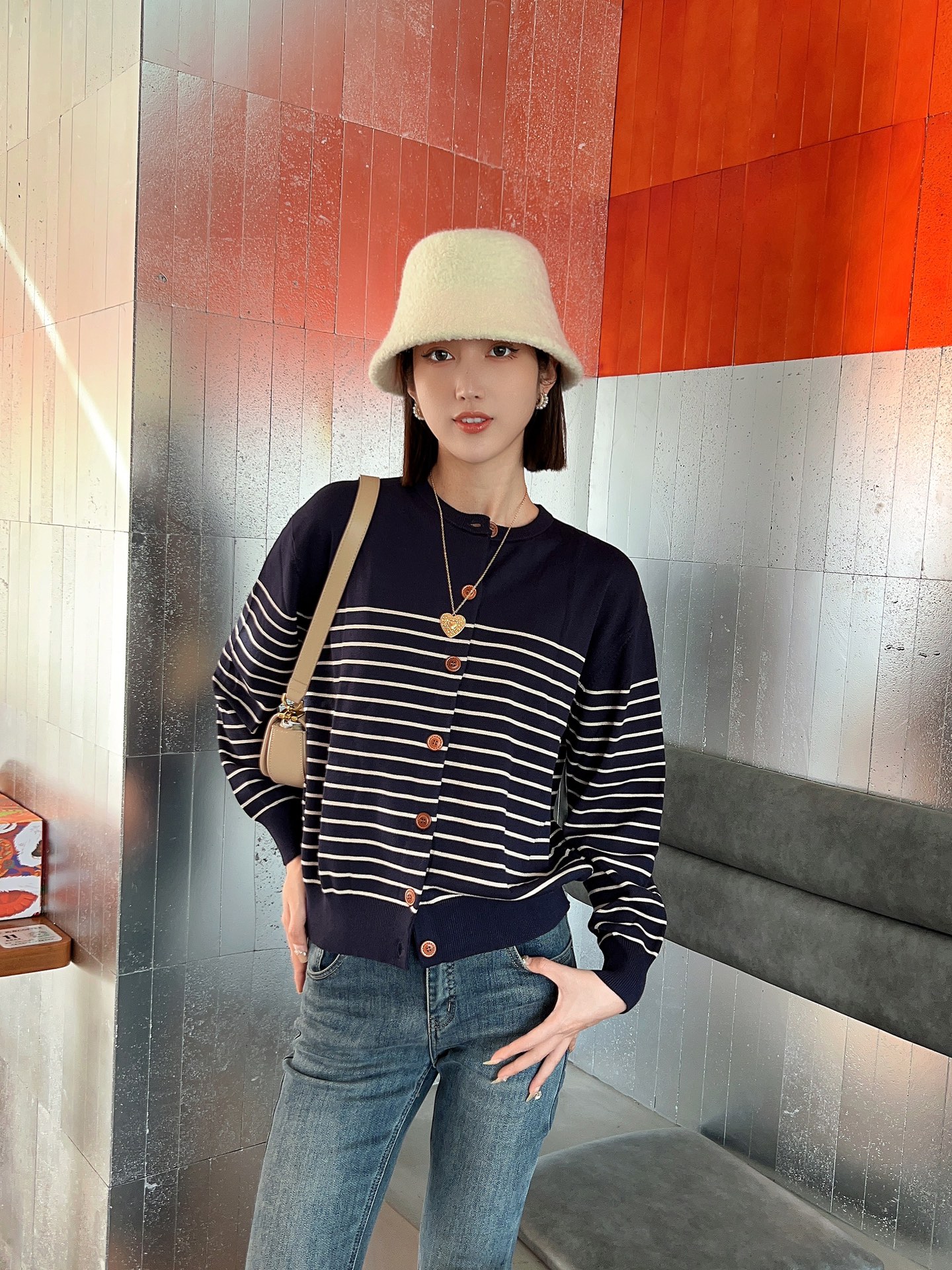 LS1003#间条圆领针织开衫