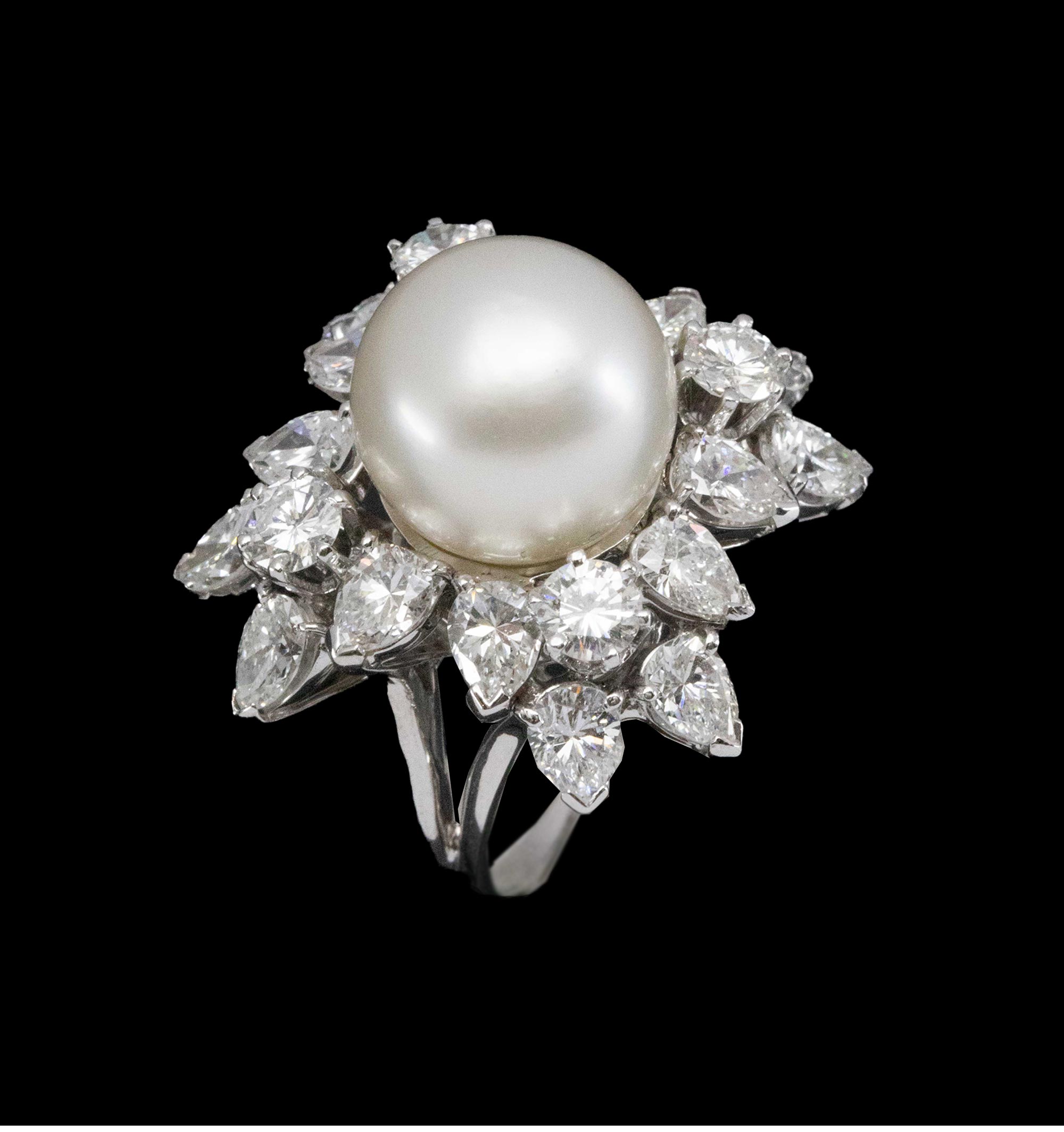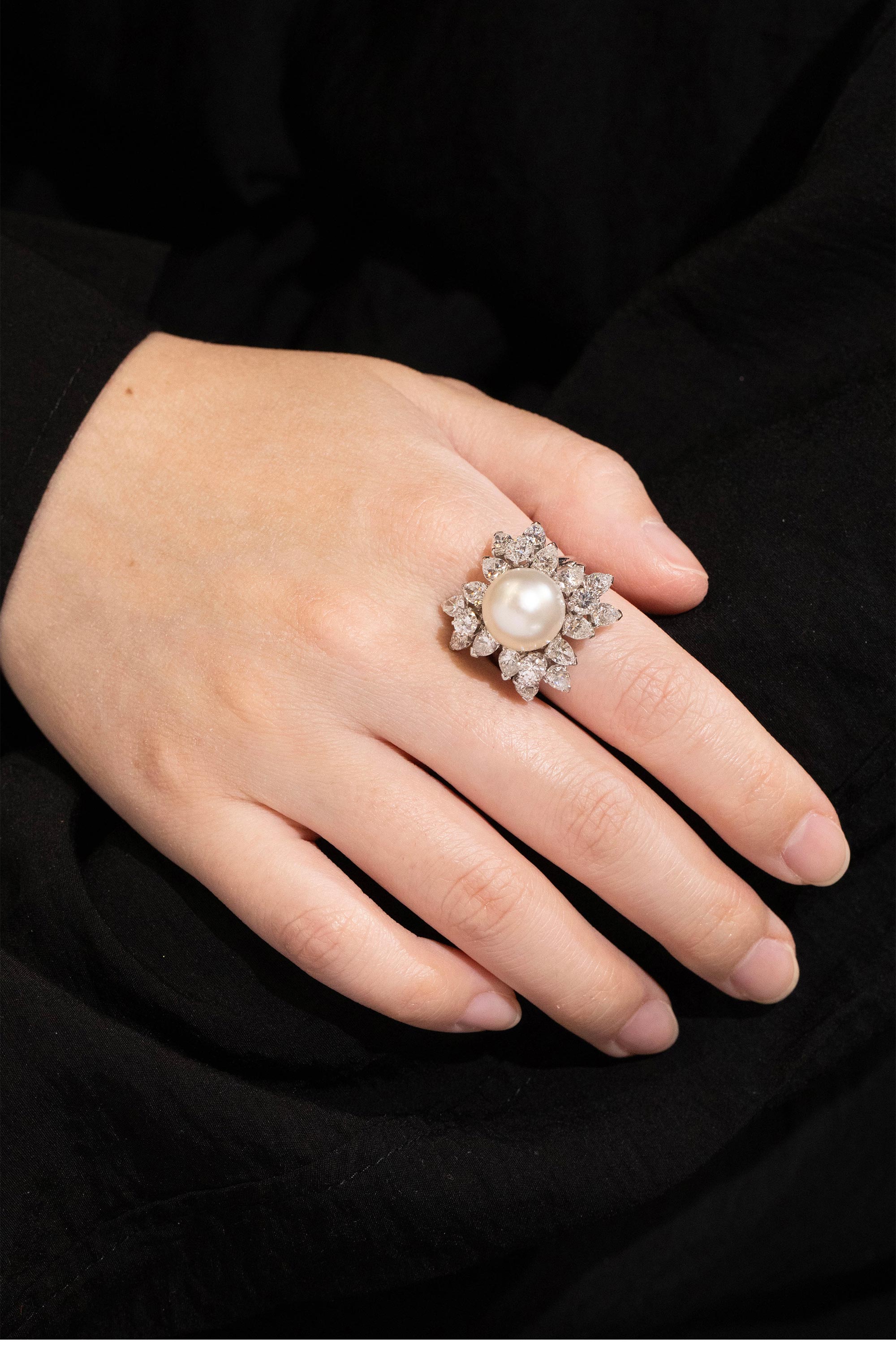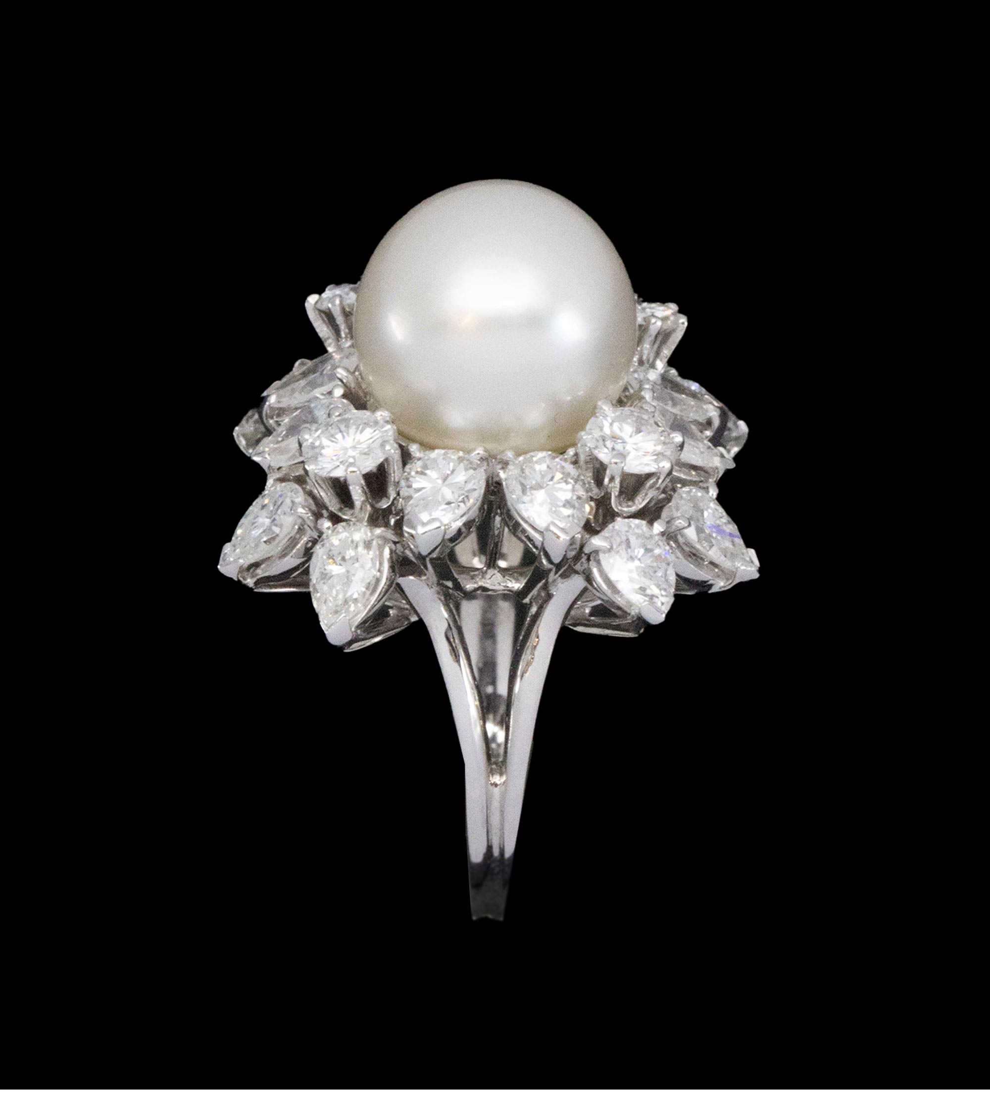 1960年代法国出品花卉造型白金镶嵌钻石及珍珠戒指