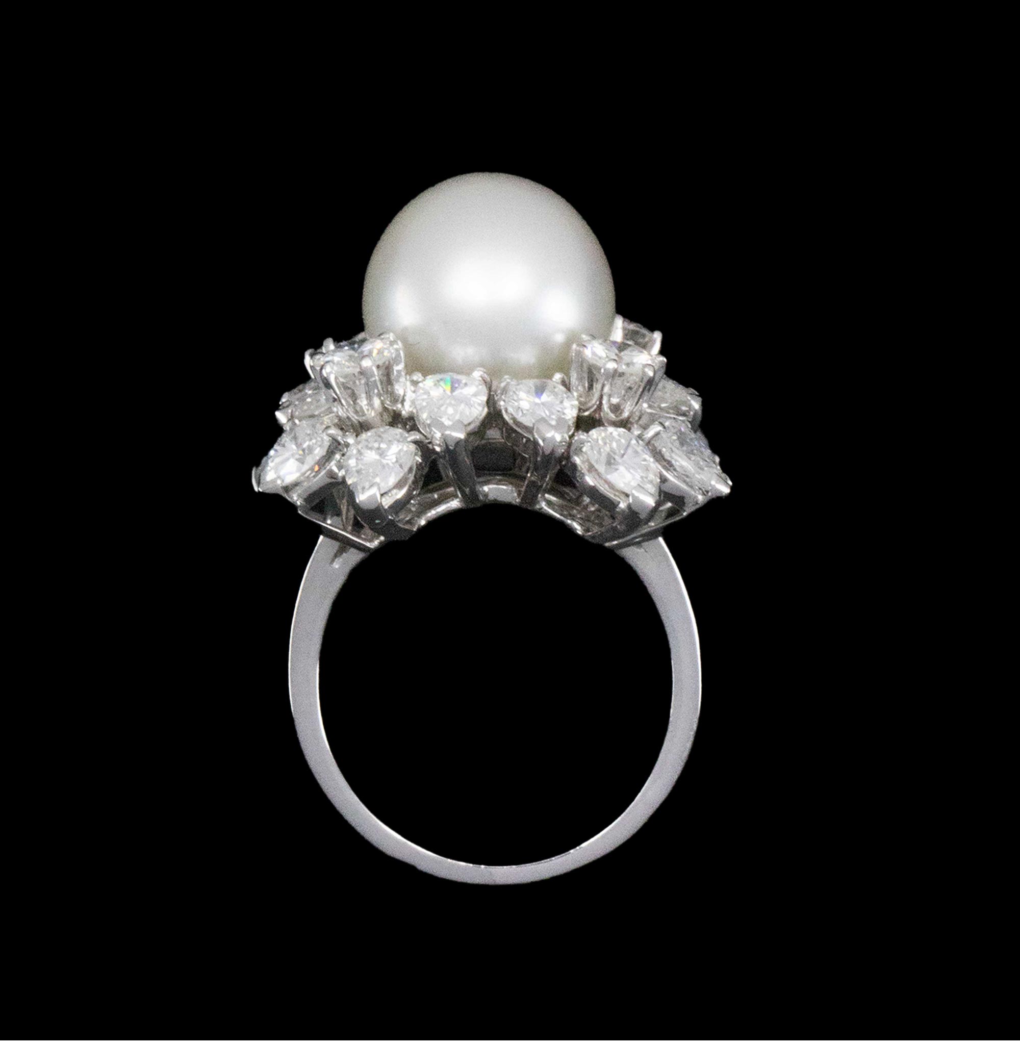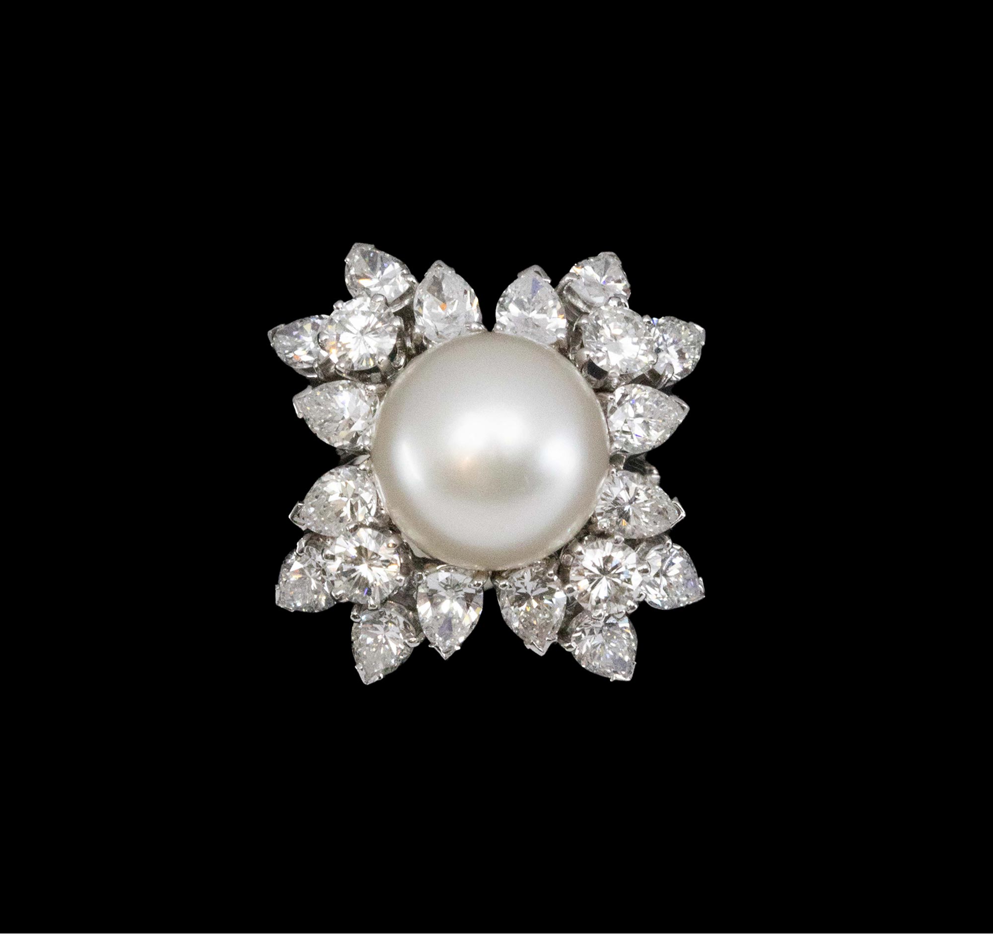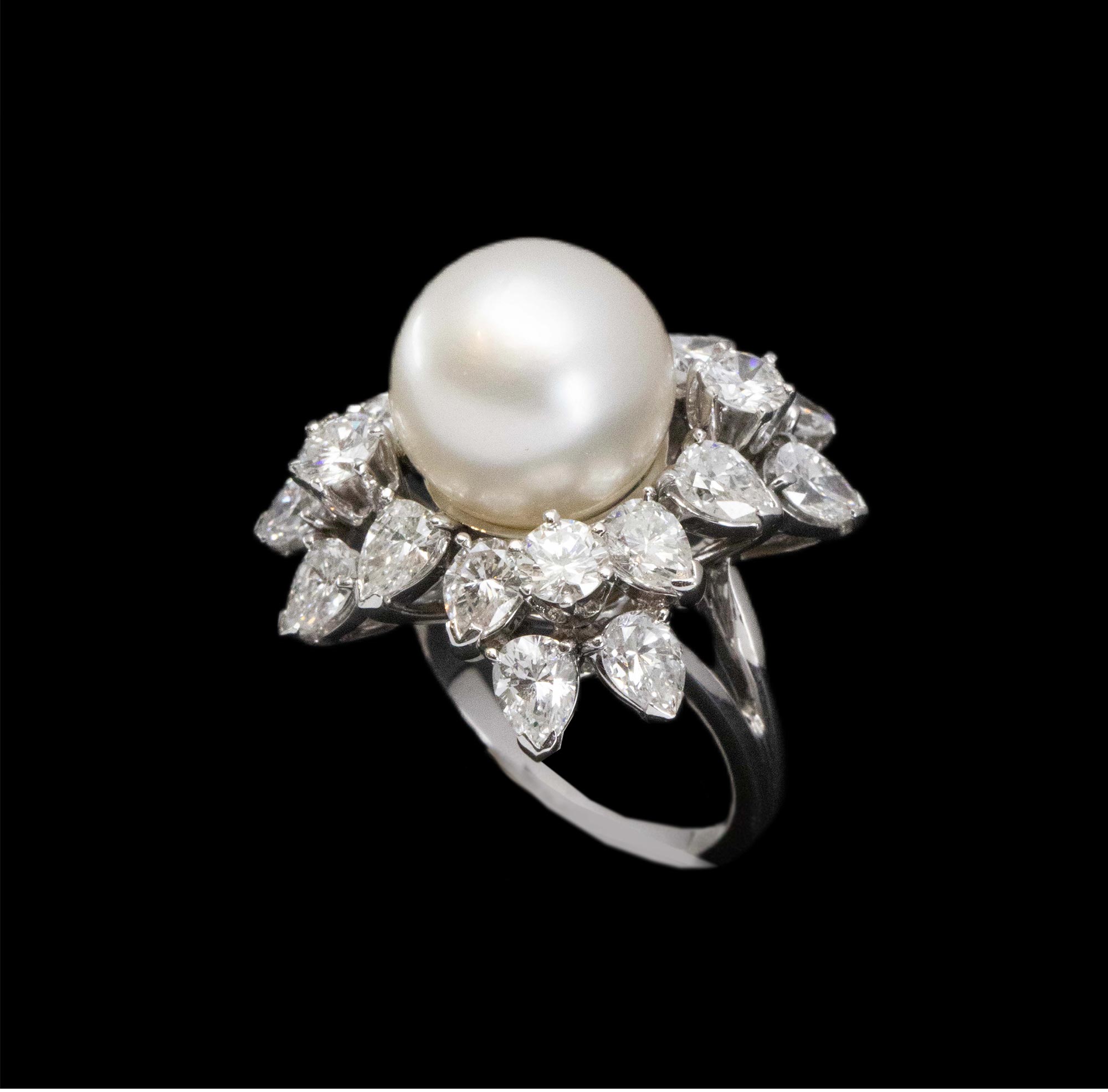 1960年代法国出品花卉造型白金镶嵌钻石及珍珠戒指