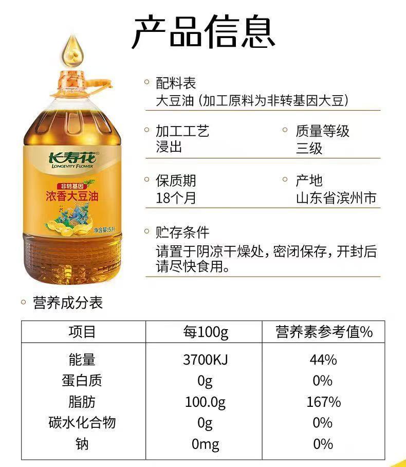 长寿花浓香非转基因豆香浓郁 非转基因 压榨大豆油5L