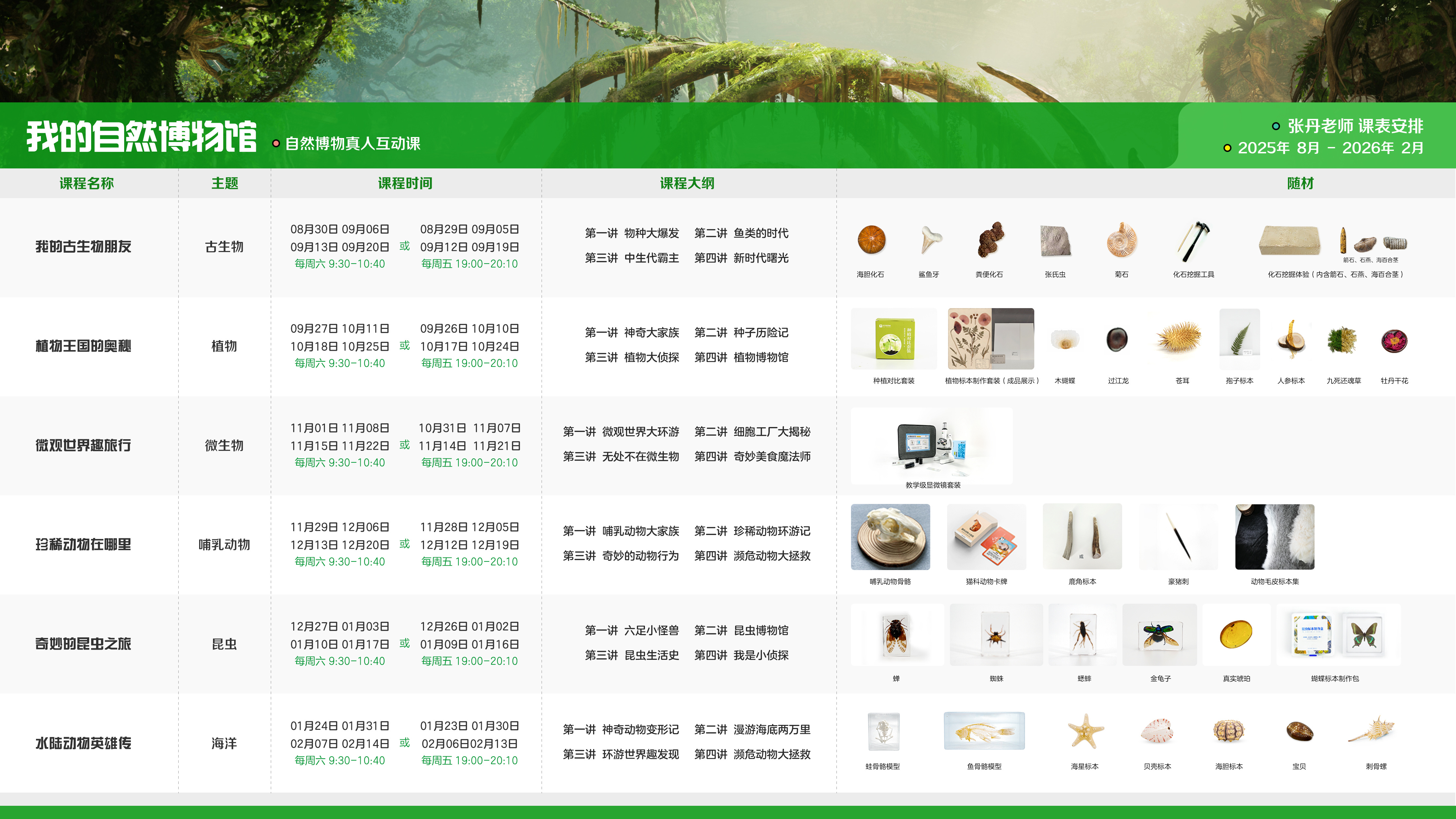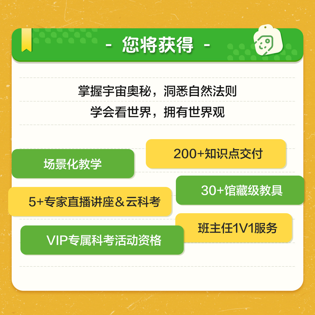 六大主题24节真人互动课+20次动手实验+40个馆藏级教具+200个知识点+365天伴学服务