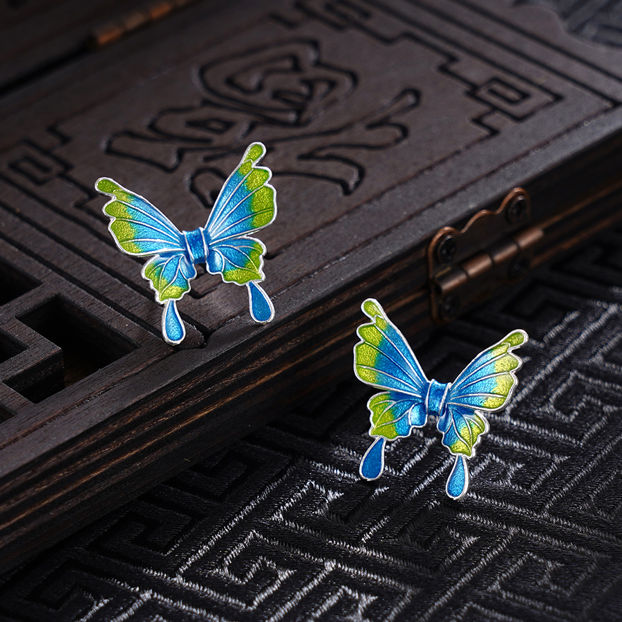 【寓意】:此作品以蝴蝶为灵感,采用足银材质打造打造,融合景泰蓝特调蓝绿色,清丽淡雅,细腻梦幻。寓意蝴蝶已至,福气自来。