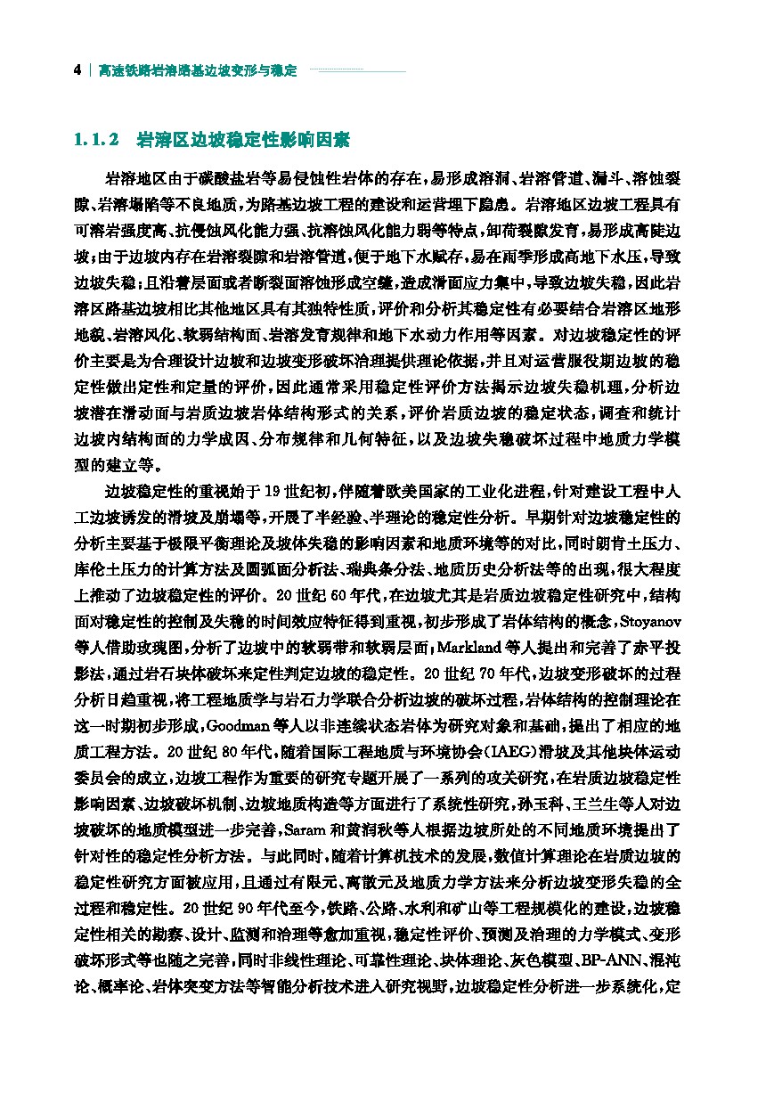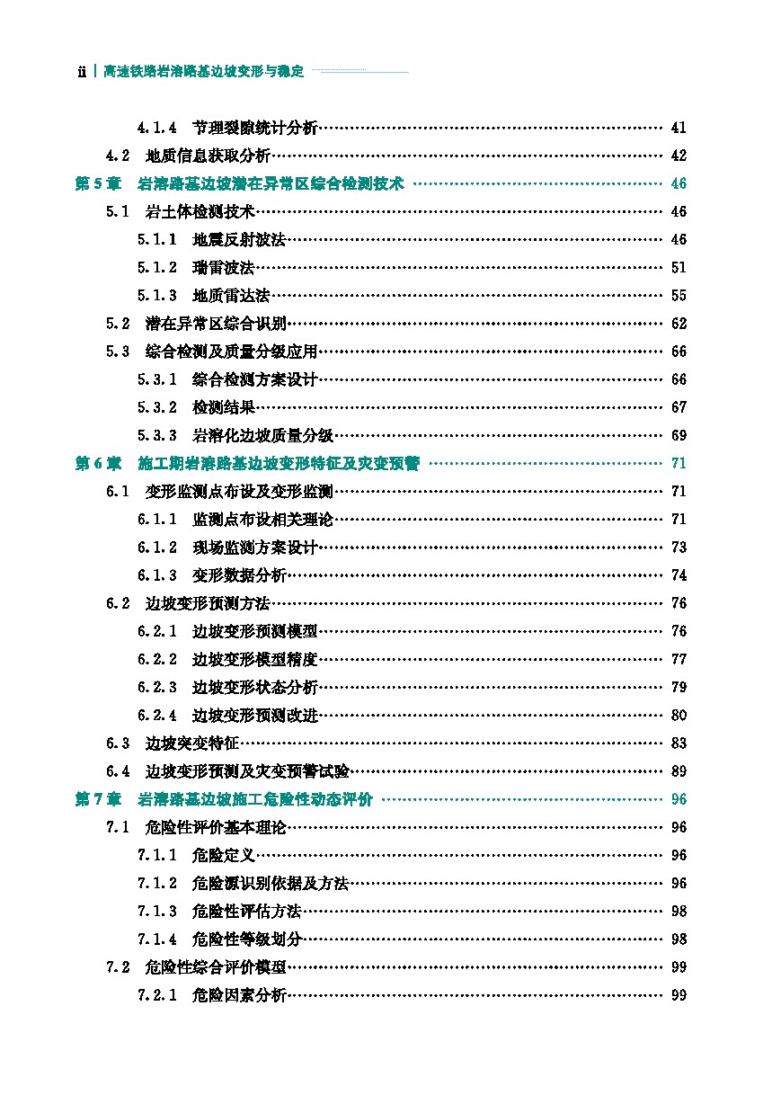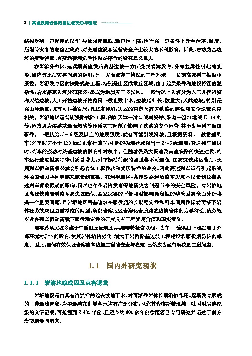 与传统路基边坡工程不同,高速铁路岩溶路基边坡一方面受不良地质条件的影响,另一方面受岩溶水侵蚀、岩溶分布差异化的影响,同时也在长期的高速列车振动中服役,给边坡的稳定和防护带来巨大的挑战。且从国内外研究现状来看,当前国内外关于边坡工程防灾减灾的文献、书籍较多,但专门针对高速铁路岩溶路基边坡的书籍非常稀缺,特别是岩溶路基边坡全生命周期的减灾防灾更为少见。