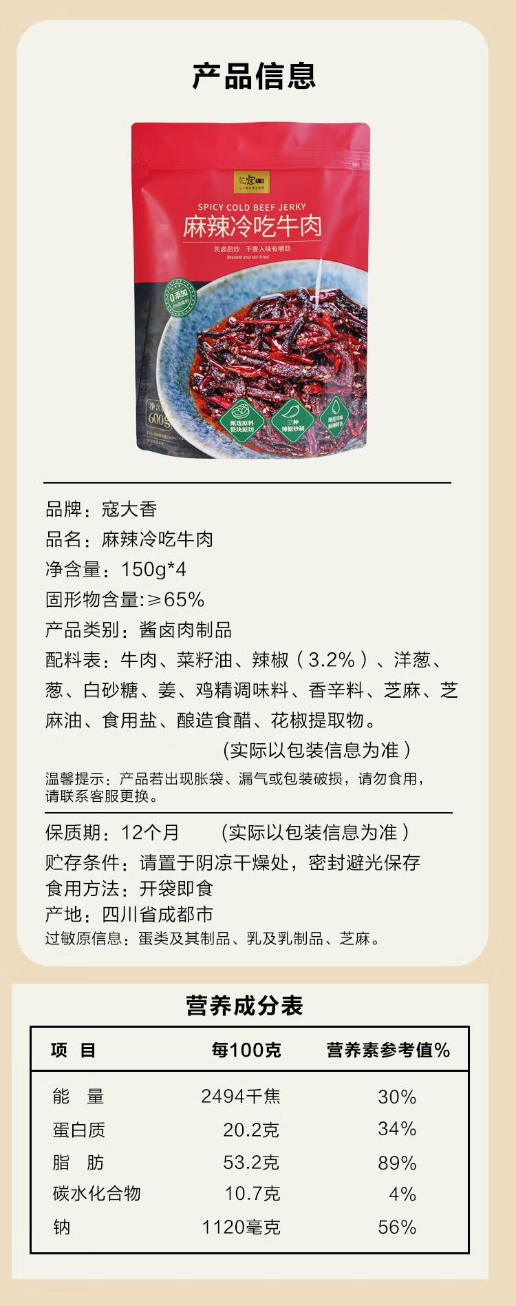 【山姆】寇大香 麻辣冷吃牛肉 600g(150g*4) 麻辣味 600g