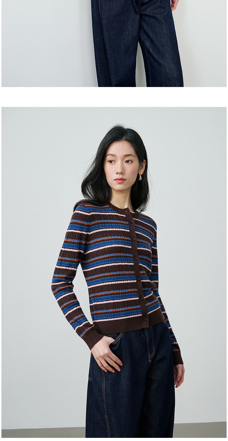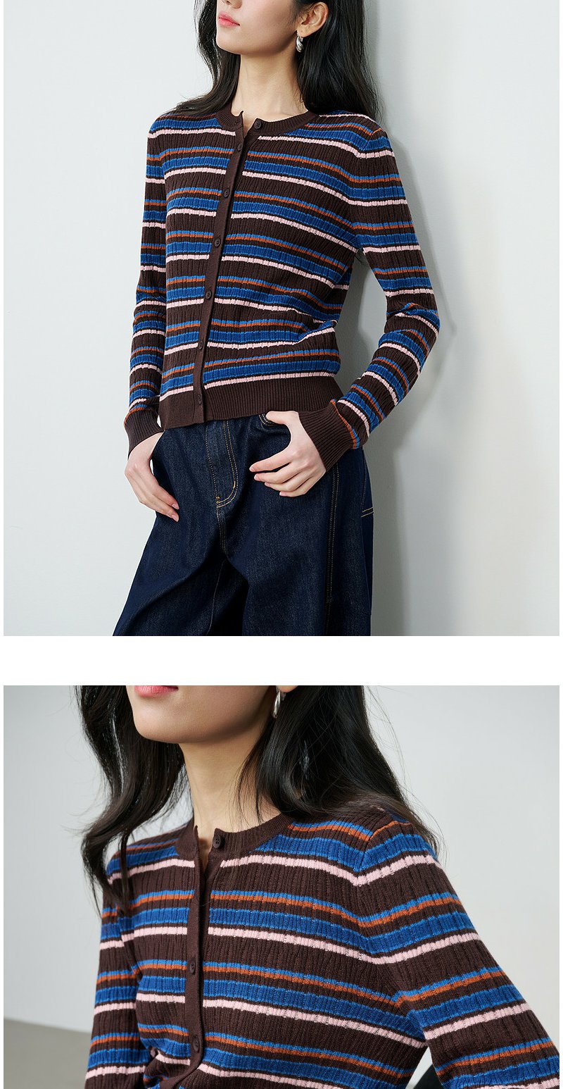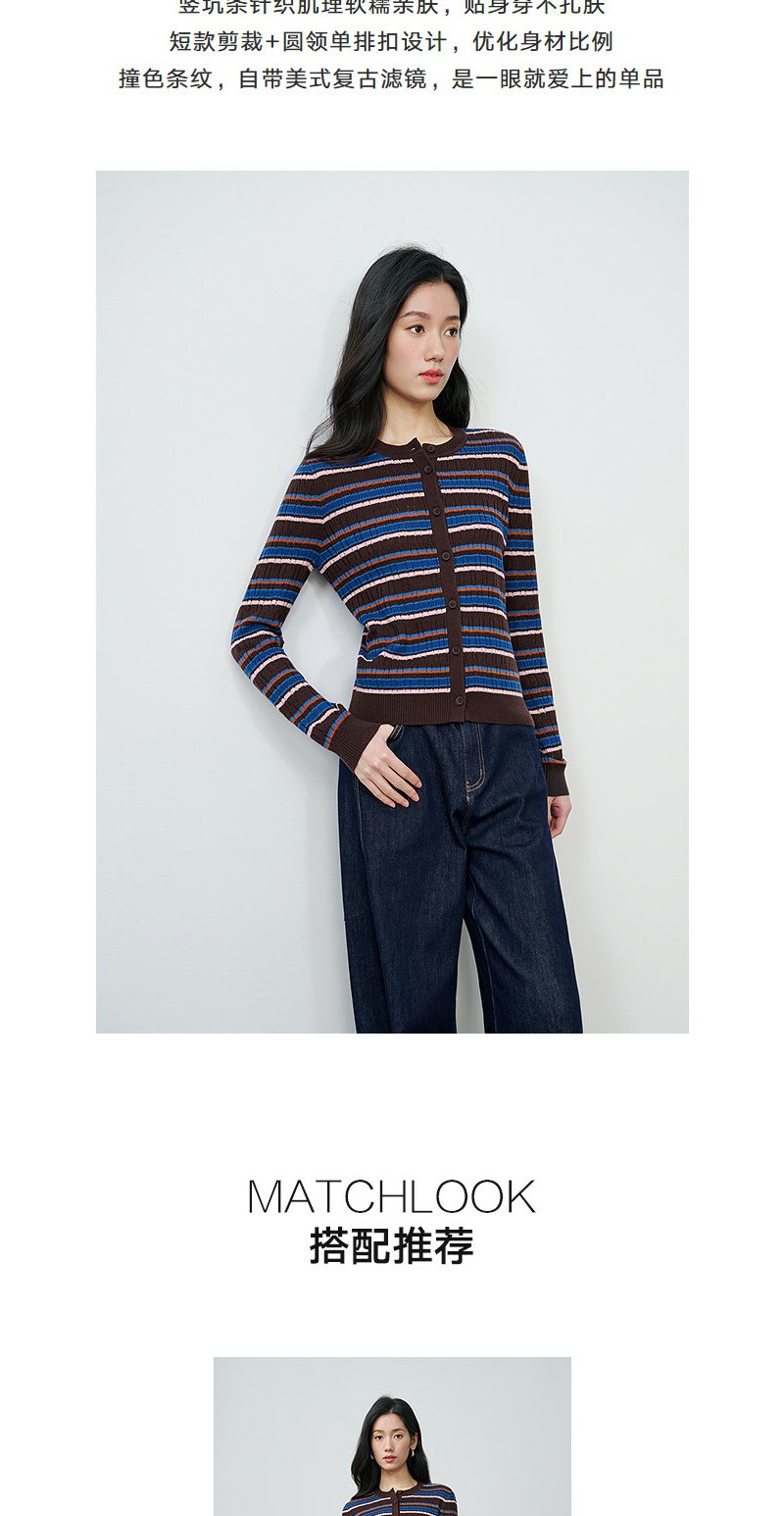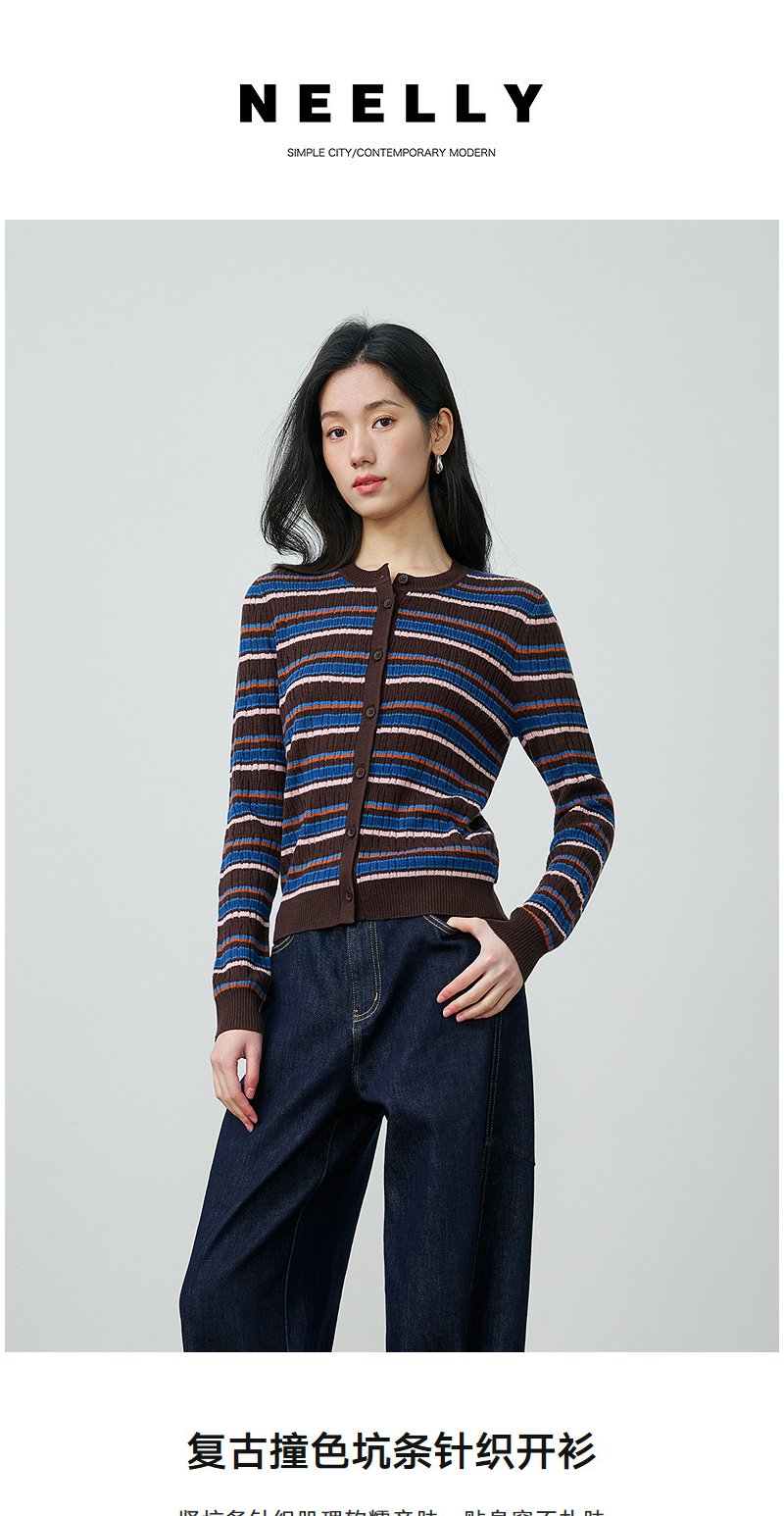 NEELLY纳俪商场同款春季新款复古撞色坑条针织开衫女圆领修身上衣N26014A03316