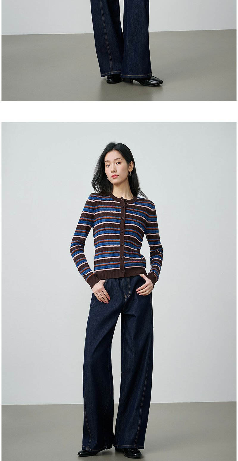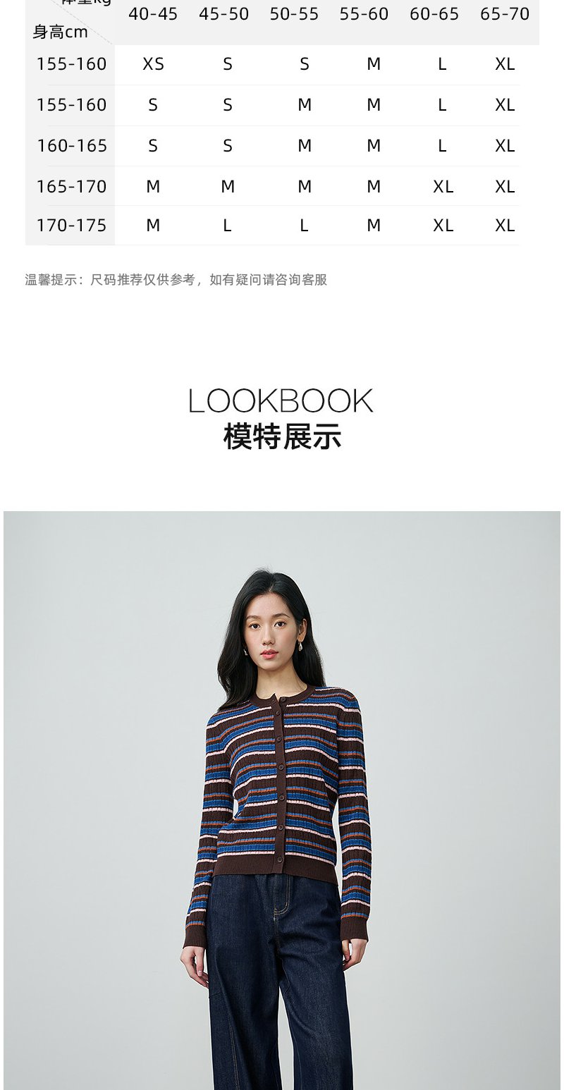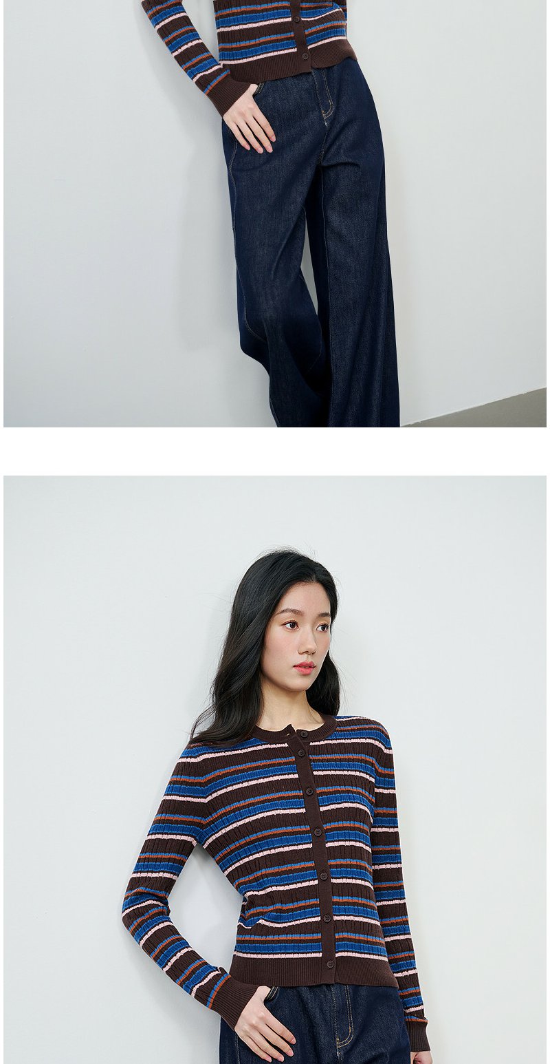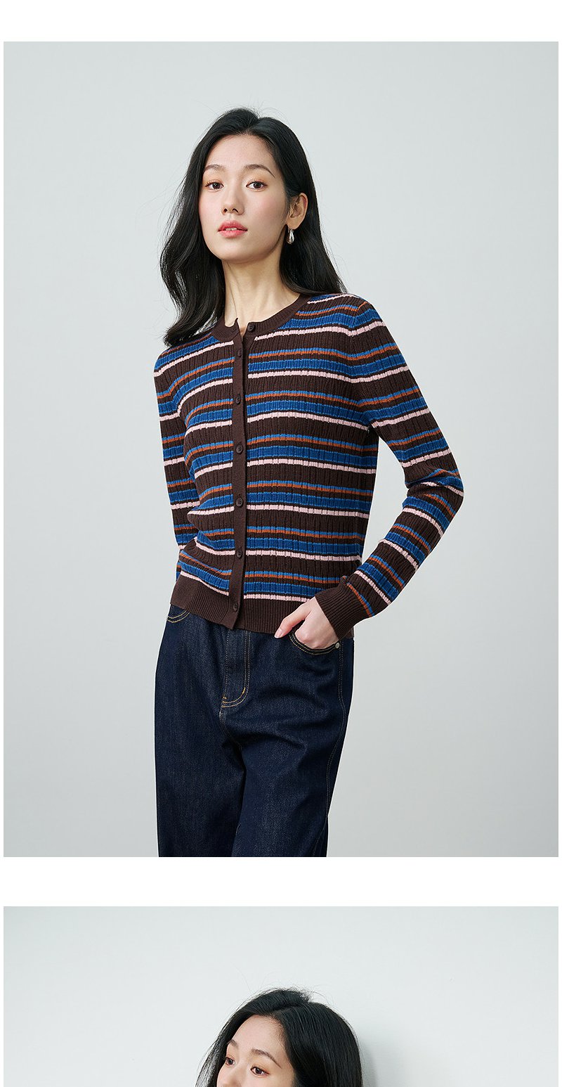 NEELLY纳俪商场同款春季新款复古撞色坑条针织开衫女圆领修身上衣N26014A03316