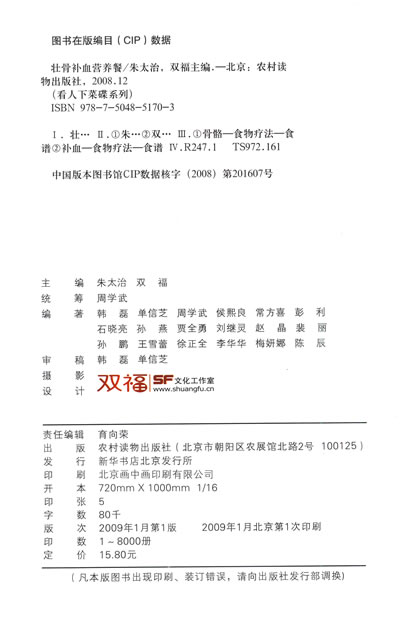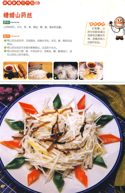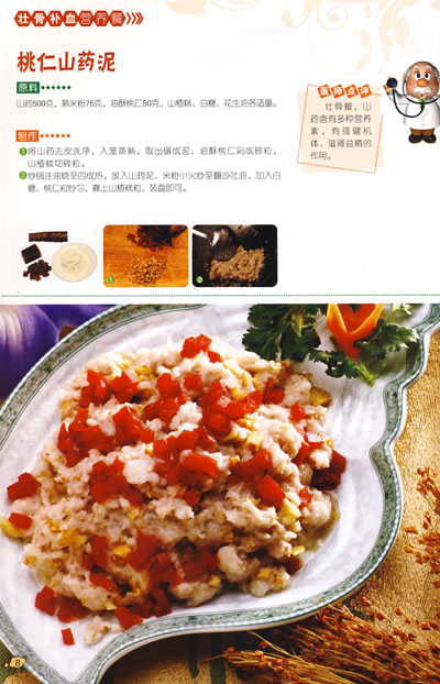 写在前面 壮骨补血的饮食原则 蔬果类 琉璃桃仁 桃仁山药泥 番茄炒山药 蛋黄山药 糖醋山药丝 香酥山药 金沙山药条 姜丝炒鲜藕 椒丝脆藕片 椒盐酥藕丸 红枣糯米藕 *末翠鹦哥 双蛋浸菠菜 菠菜色拉 多宝菠菜 粉丝菠菜 莴笋烩香菇 芝麻香菇串 香煸菠菜 樱桃香菇 蜜豆红枣煲娃娃菜 桂花蜜枣 养生四宝 炯番茄 黄豆拌雪菜 *禽蛋类 枸杞莲藕烧*皮 枸杞山药煲瘦* *末烧木耳 *蒜香骨 糖醋排骨 花旗参木瓜排骨赁 莲藕黄豆排骨汤 红烧大枣猪蹄 板栗焖猪手 干烧蹄筋 当归赤豆煲猪肝 菠菜炒肝片 赤豆枸杞猪肝汤 酸菜炖牛尾 酸奶牛*球 蘑菇烧牛排 酸菜牛腩 沙参淮山煲牛腩 白菜红枣牛腩汤 党参牛腩汤 番茄牛*菠菜汤 豉汁蒸牛髓 枸杞烧牛* 多味牛*丸 京葱爆羊* 萝卜桂圆煲羊腩 胡萝卜炒羊* 家常烧仔鸡 酱烧嫩仔鸡 乌鸡煲 清汤滑鸡球 尖椒虾皮炒鸡蛋 锦绣蛋丝 当归黄芪乌鸡汤 沙参玉竹老鸭汤 韭菜炒鸭血 红枣鹌鹑汤 党参枸杞炖乳鸽 桂圆鸽子煲 香菇蒸乳鸽 党参桃仁乳鸽汤 核桃乳鸽煲 水产品类 酸菜鲤鱼 香煎脆鳞活鲤鱼 糖醋黄河鲤鱼 清炖鲢鱼头 葱油鲢鱼 三菇炖鱼头 赤豆鲫鱼汤 锅仔鱼羊鲜 红烧鳝鱼段 干烧鳝鱼 沙锅鳙鱼头 醋熘鳜鱼 莼菜银鱼羹 银鱼炒滑蛋 清炒双银 巴戟天鱼头汤 北芪参枣生鱼汤 田七红枣生鱼汤 章鱼猪蹄煲 蒜瓣烧甲鱼 红煨甲鱼 尖椒拌虾皮 酱爆香螺 清炸蛎黄 炒蛎黄 葱烧海参 *末烧海参 淮山巴戟炖海参 主食饮品类 樱桃雪豆粥 菠菜瘦*粥 香菇滑鸡粥 木耳粥 茯苓大枣山药粥 莲藕香芋饼 西式奶香粥 乳鸽*桂圆粥 山药莲子羹 猪皮红枣羹 山药大枣粥 附录 鱼类和蔬菜的选购技巧