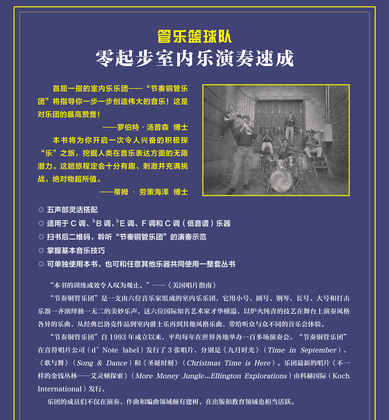 由奥地利百年名社维也纳环球音乐出版有限公司编写。 该出版社是一家古典音乐出版公司。1901年成立于维也纳,最初旨在为奥地利市场提供核心古典作品和教育作品。该公司很快扩展成为现代音乐最重要的出版商之一,是我社长期的业务合作伙伴。本套书所有曲目由“节奏铜管乐团”演奏,该乐团是一支由六位音乐家组成的欧洲室内乐团,它用小号、圆号、钢琴、长号、大号和打击乐器一齐演绎独一无二的美妙乐声。这六位国际知名艺术家才华横溢,以炉火纯青的技艺在舞台上演奏风格各异的乐曲,从经典巴洛克作品到室内爵士乐再到其他风格乐曲,带给听众与众不同的音乐会体验。“节奏铜管乐团”自1993年成立以来,平均每年在世界各地举办一百多场巡回演奏会,如日本、中东和欧洲等地区。节奏铜管乐团在音符唱片公司(d’Note label)发行了3张唱片,分别是《九月时光》(Time in September)、《歌与舞》(Song & Dance)和《圣诞时刻》(Christmas Time is Here)。他们最新的唱片《不一样的金钱丛林--艾灵顿探索》(More Money Jungle …Ellington Explorations)由科赫国际(Koch International)发行。乐团的成员们不仅在演奏、作曲和编曲领域颇有建树,在出版和教育领域也相当活跃。译者简介:本系列丛书原版语言为英语,译者周泽林,1999年2月生,广西大学英语笔译专业研究生,系与我社初次合作的新人译者。