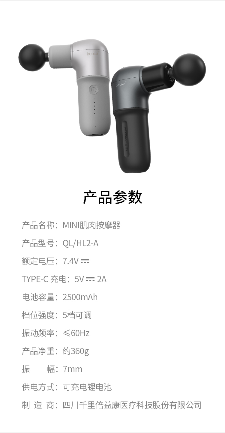 beoka/倍益康HL2 mini迷你款电动筋膜枪 肌肉按摩器 四种头可选 送布包+飞机盒