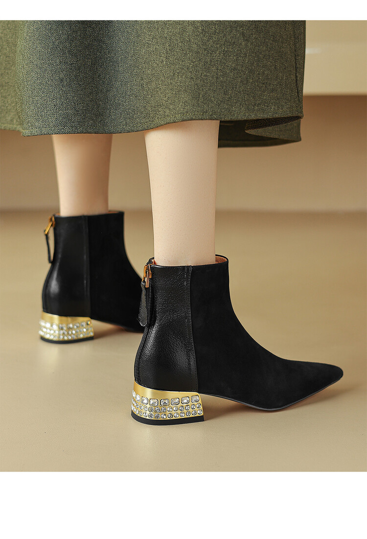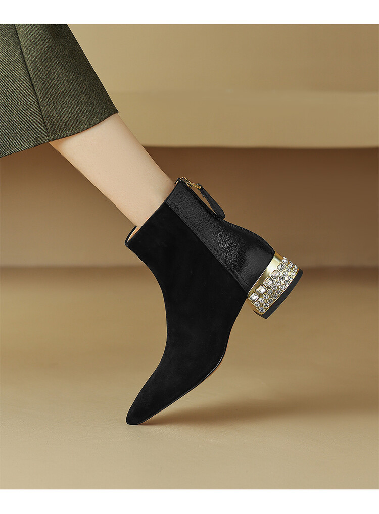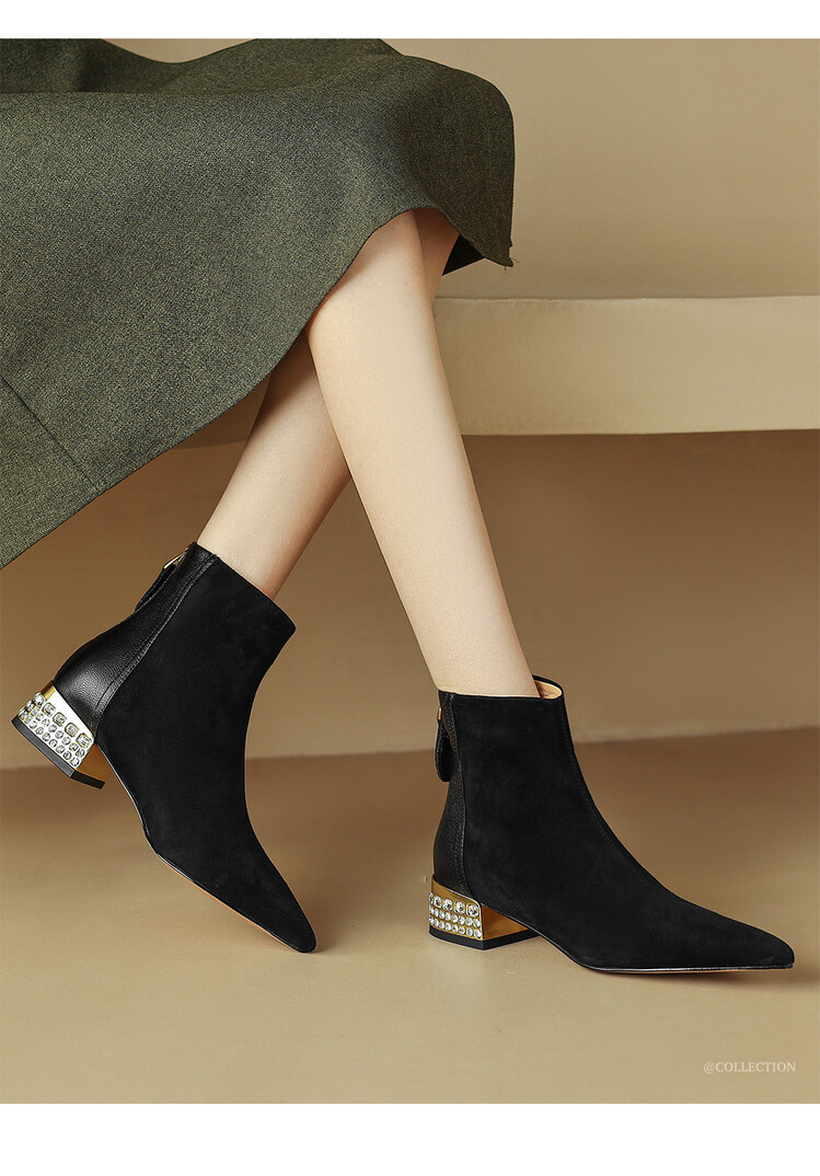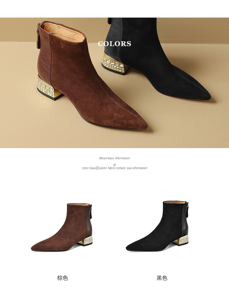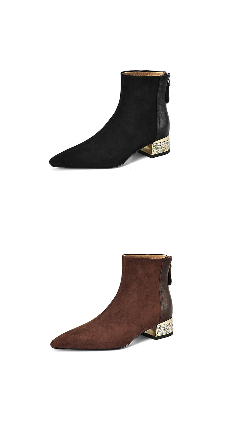 【预售5天】简约时装靴秋冬季新款靴子尖头粗低跟女靴电镀跟金属羊皮拼接短靴NDXC&6777