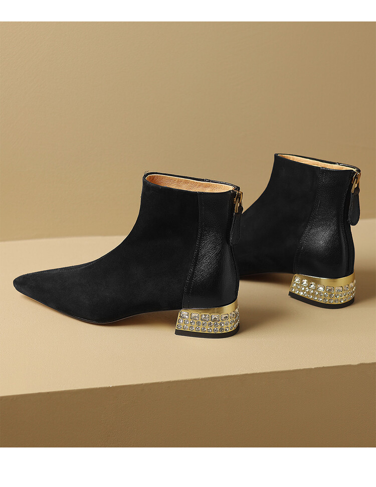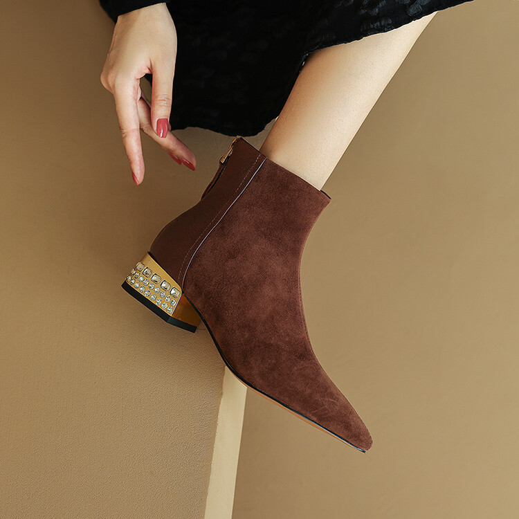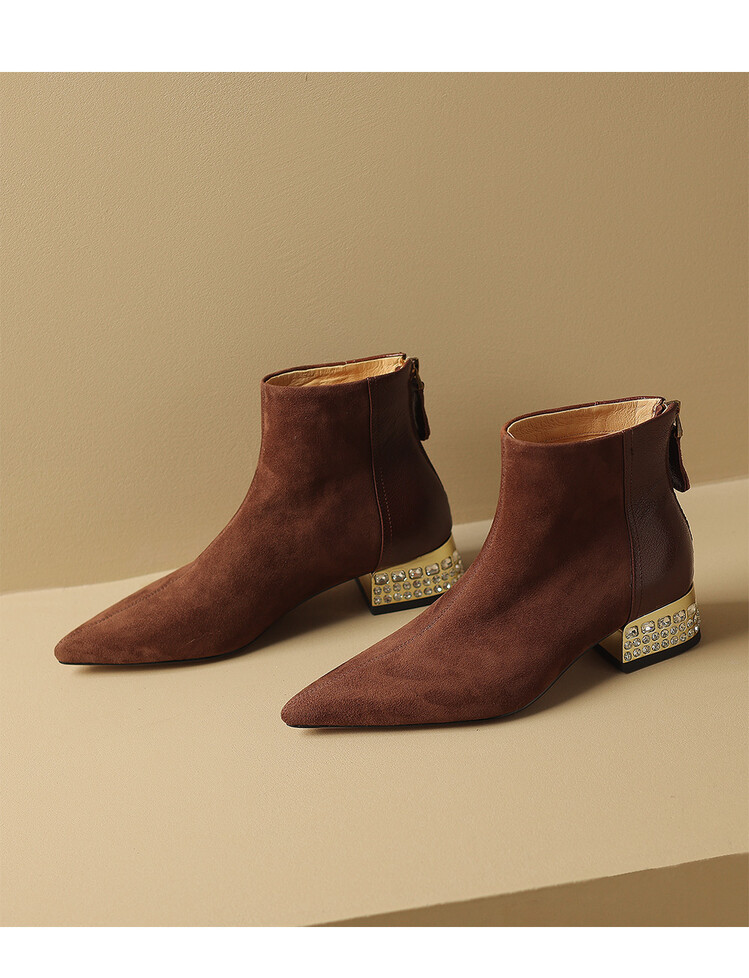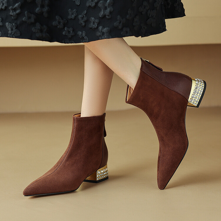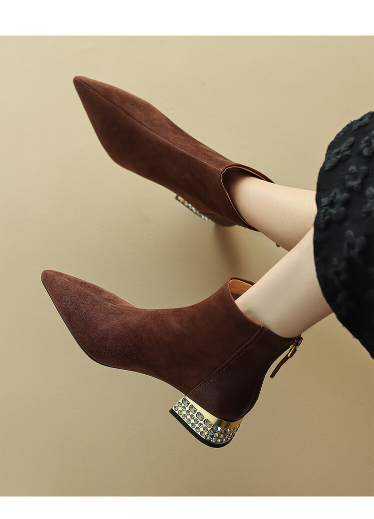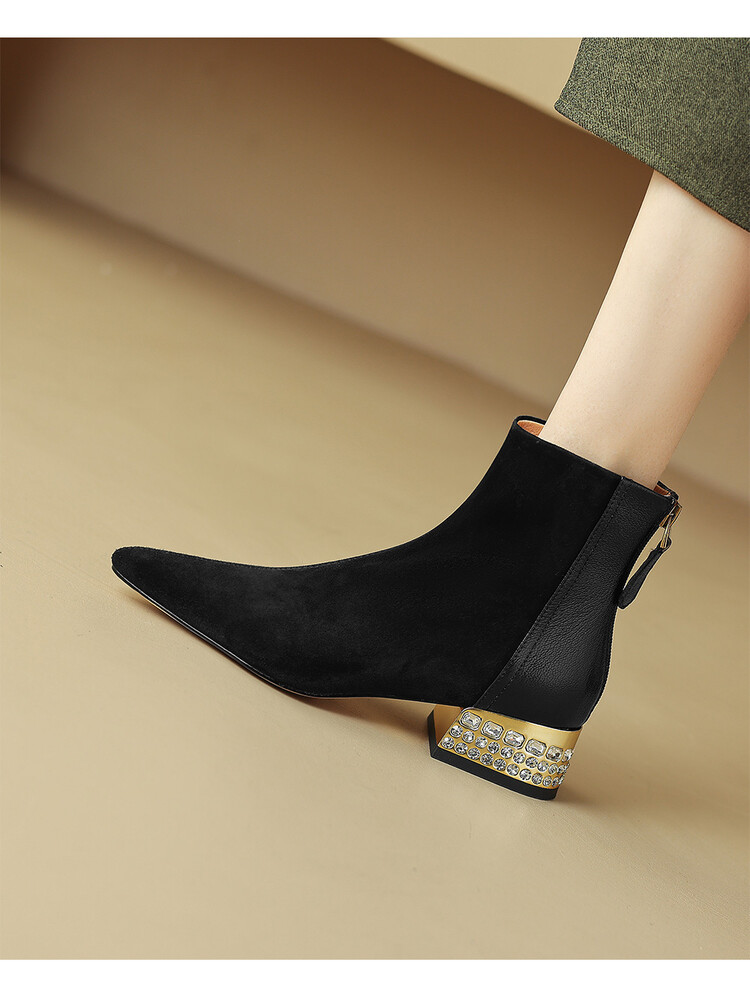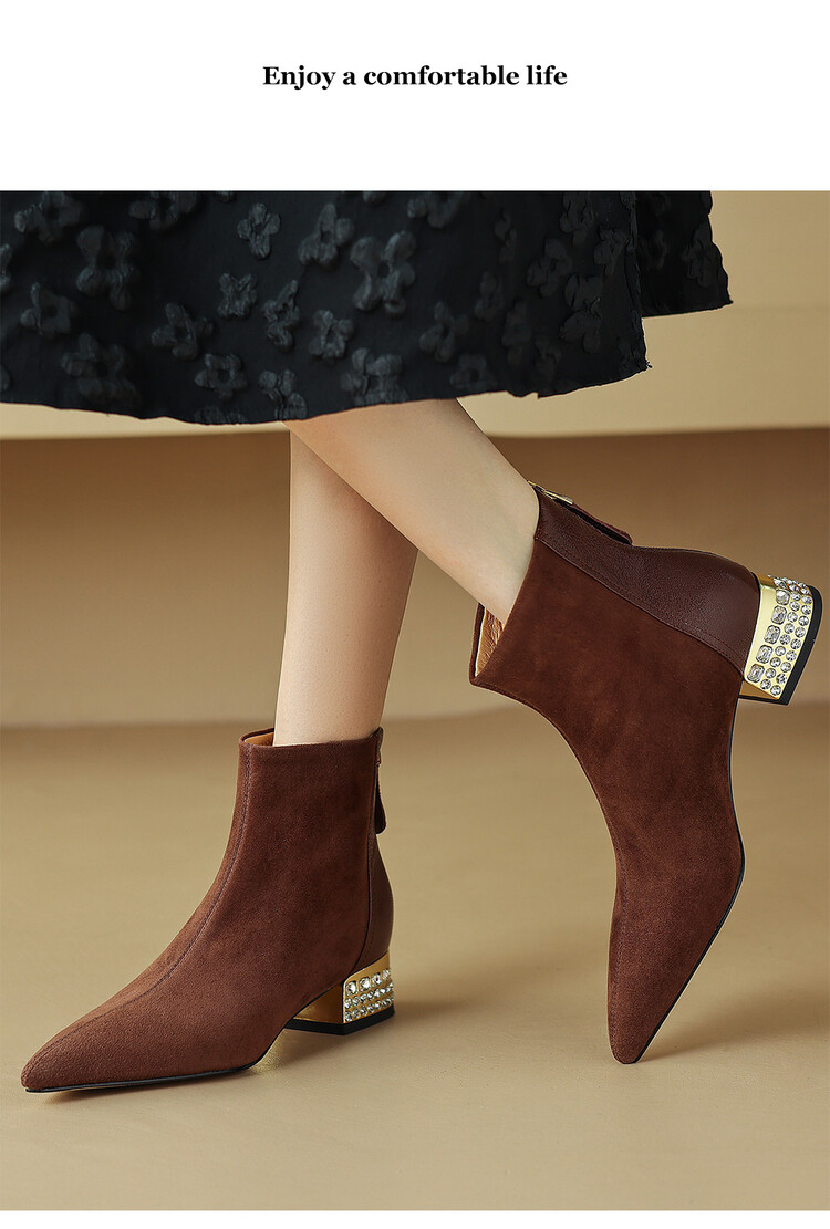 【预售5天】简约时装靴秋冬季新款靴子尖头粗低跟女靴电镀跟金属羊皮拼接短靴NDXC&6777