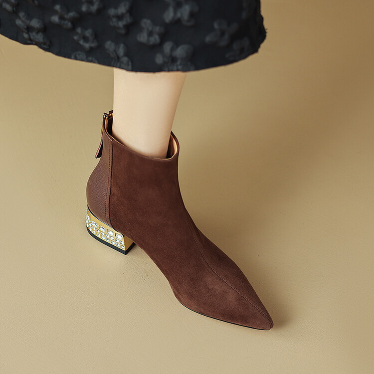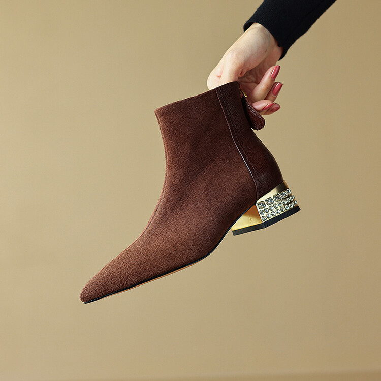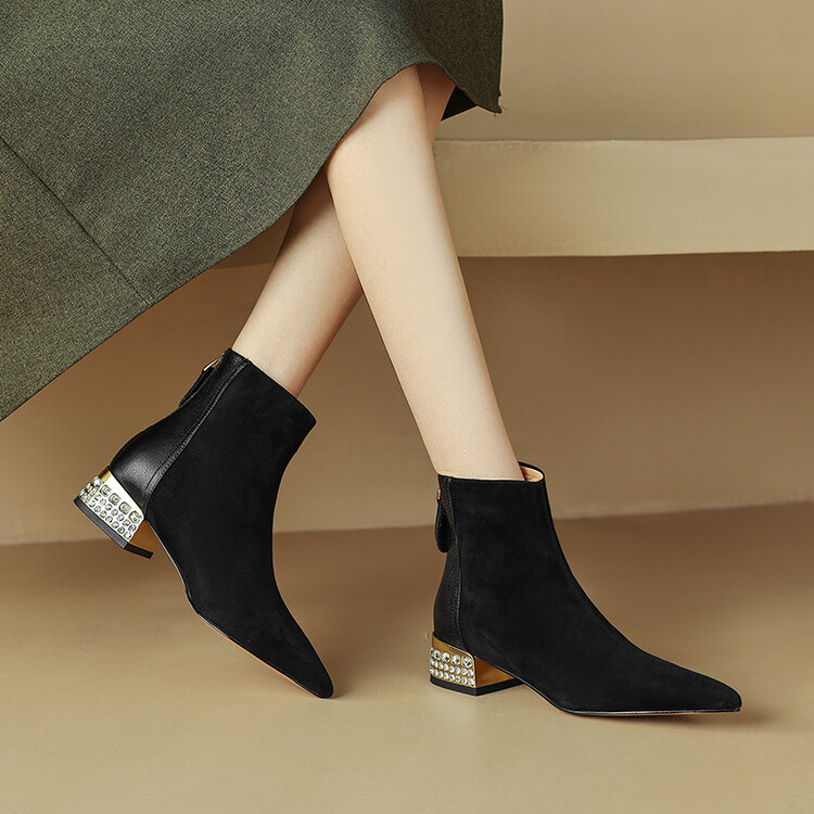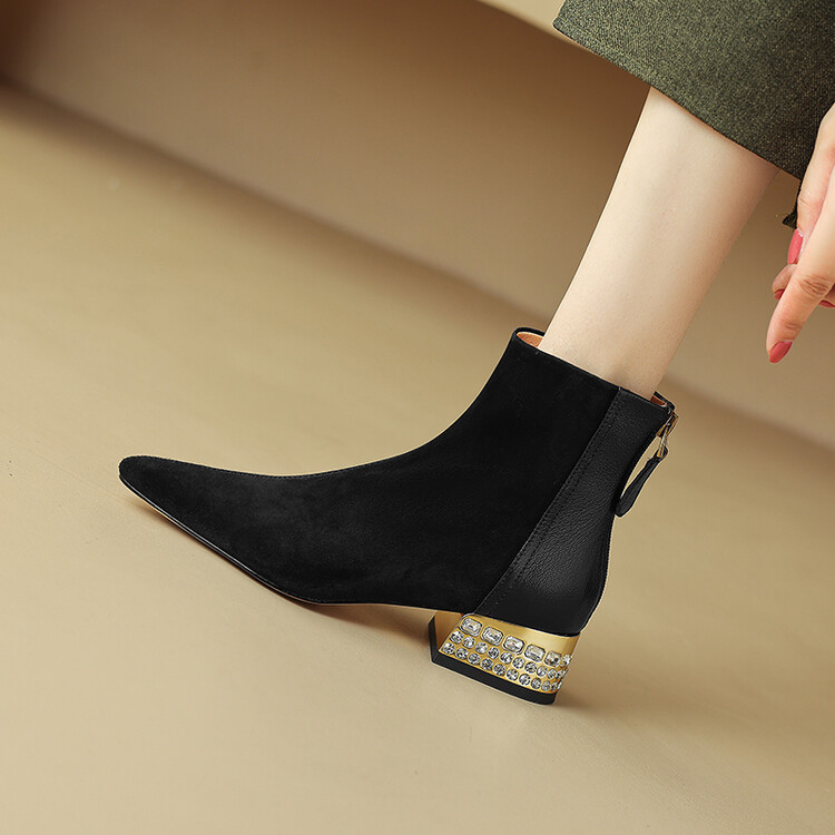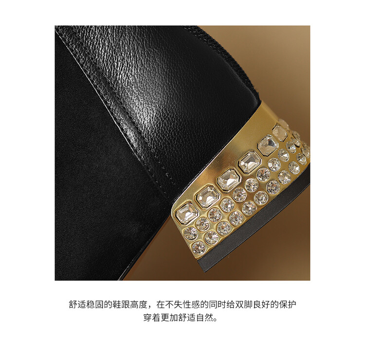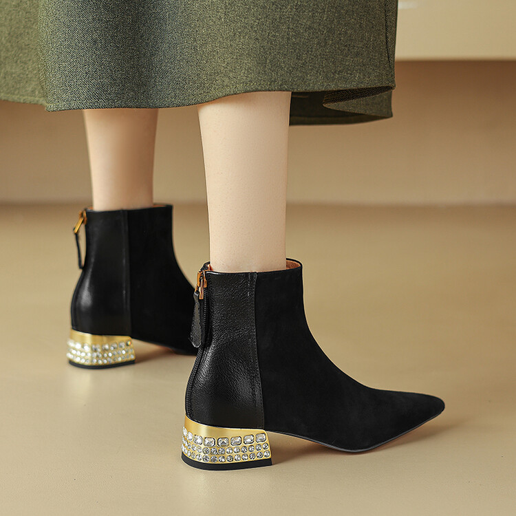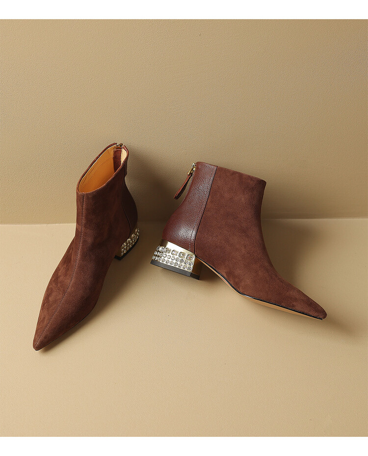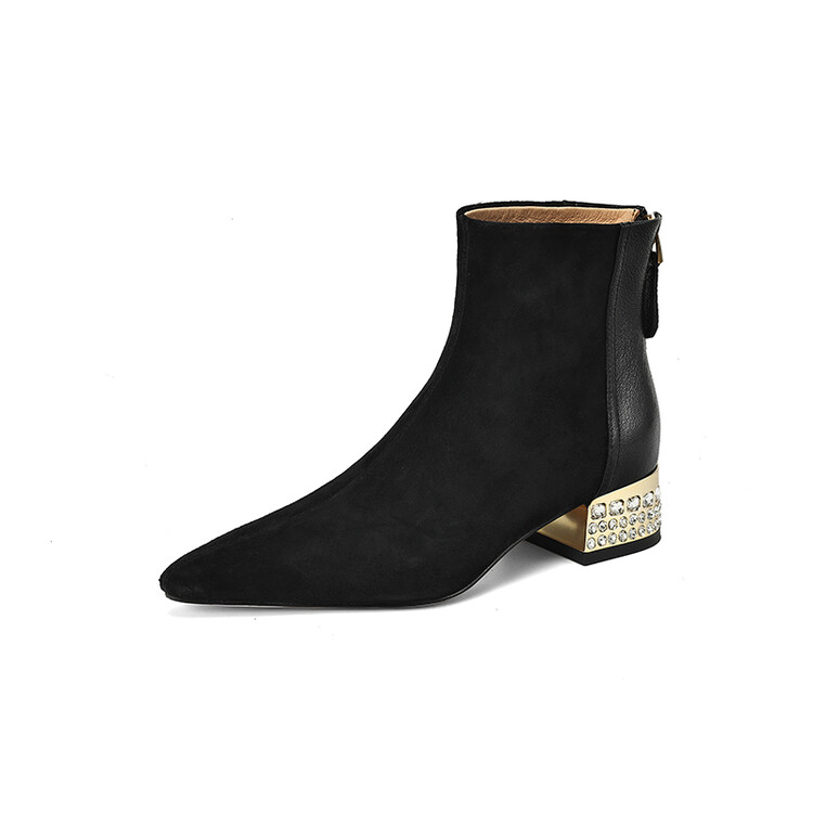 【预售5天】简约时装靴秋冬季新款靴子尖头粗低跟女靴电镀跟金属羊皮拼接短靴NDXC&6777