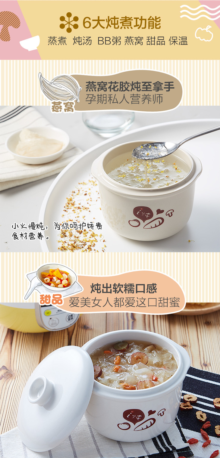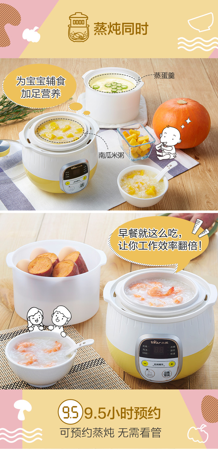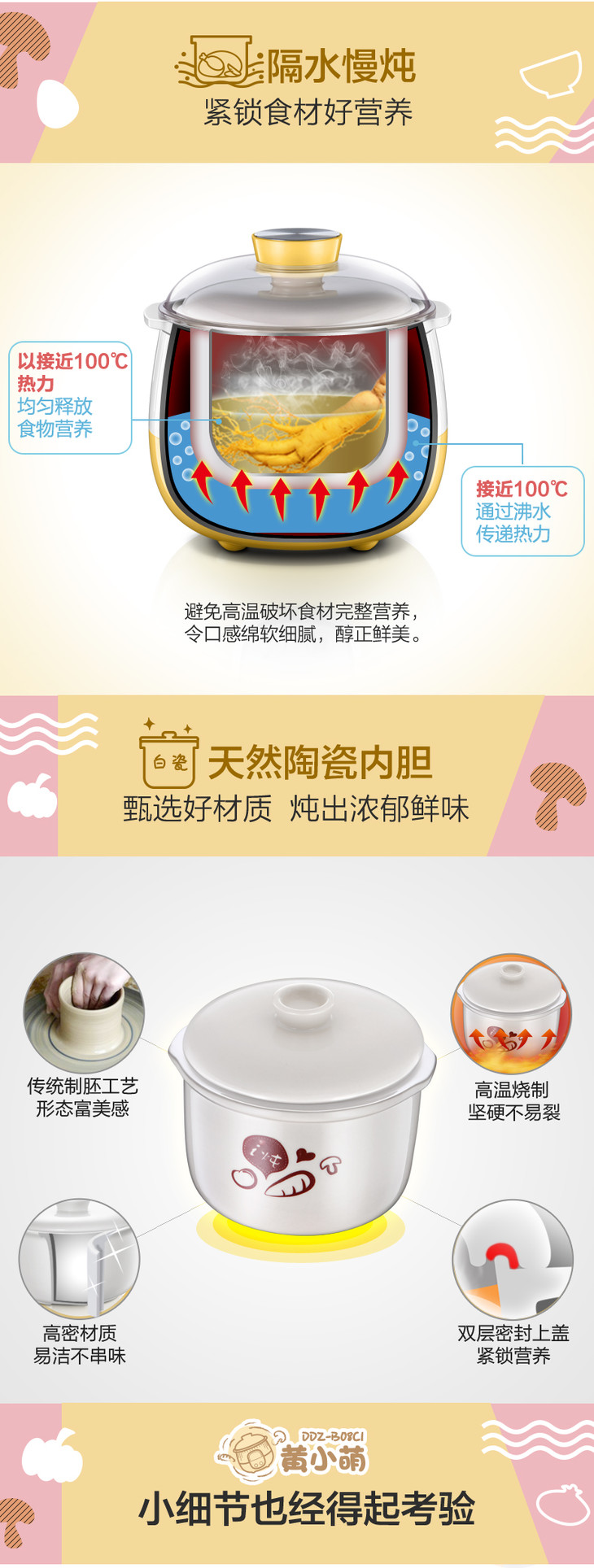小熊(Bear) 电炖锅宝宝辅食锅煲粥熬粥锅炖锅隔水炖燕窝炖盅陶瓷煲汤锅 DDZ-B08C1 0.8L 黄色