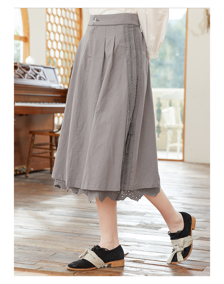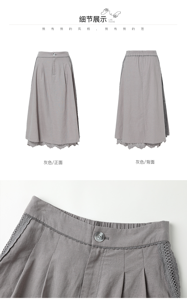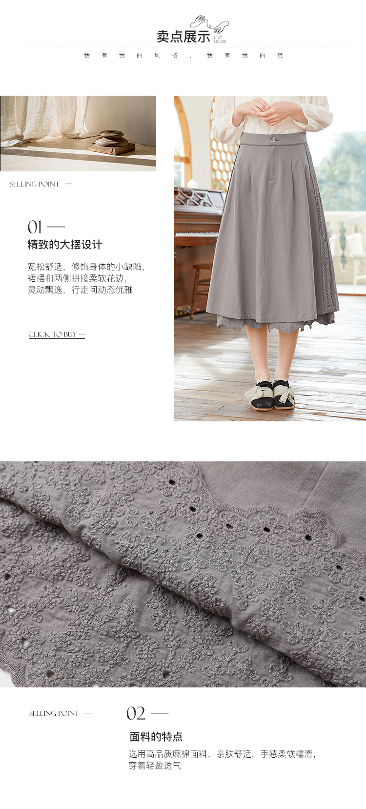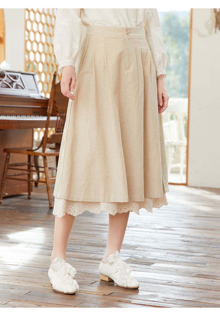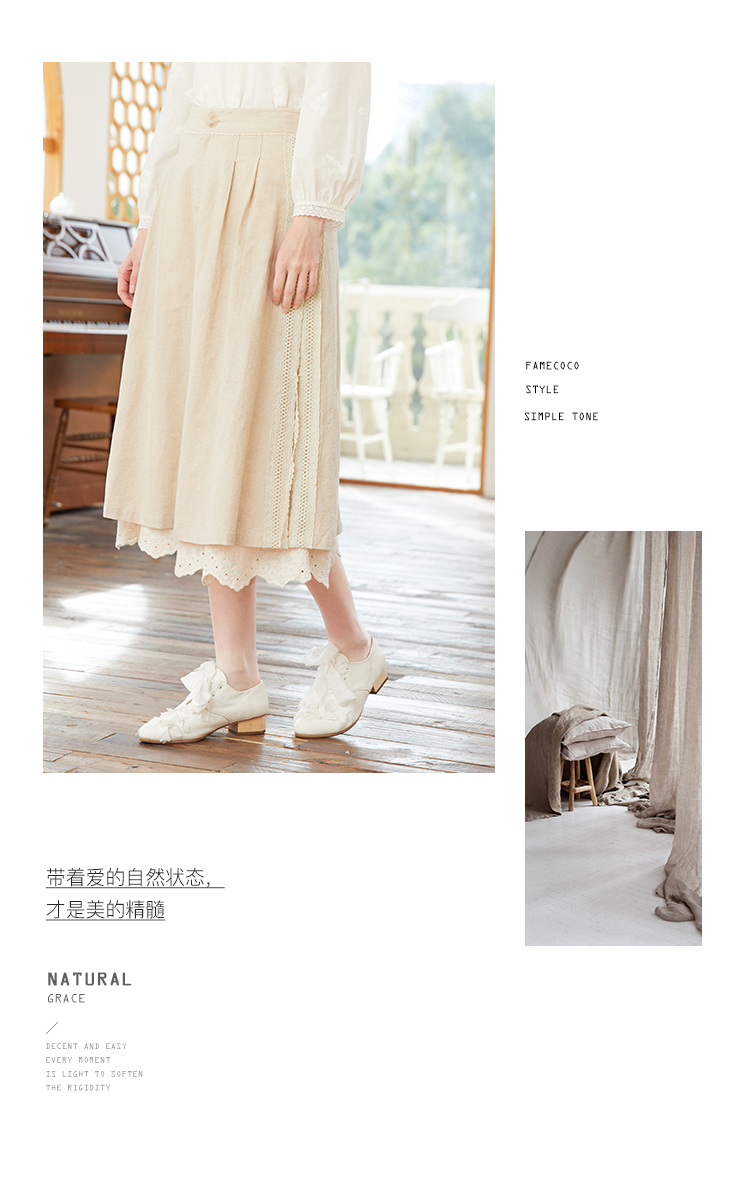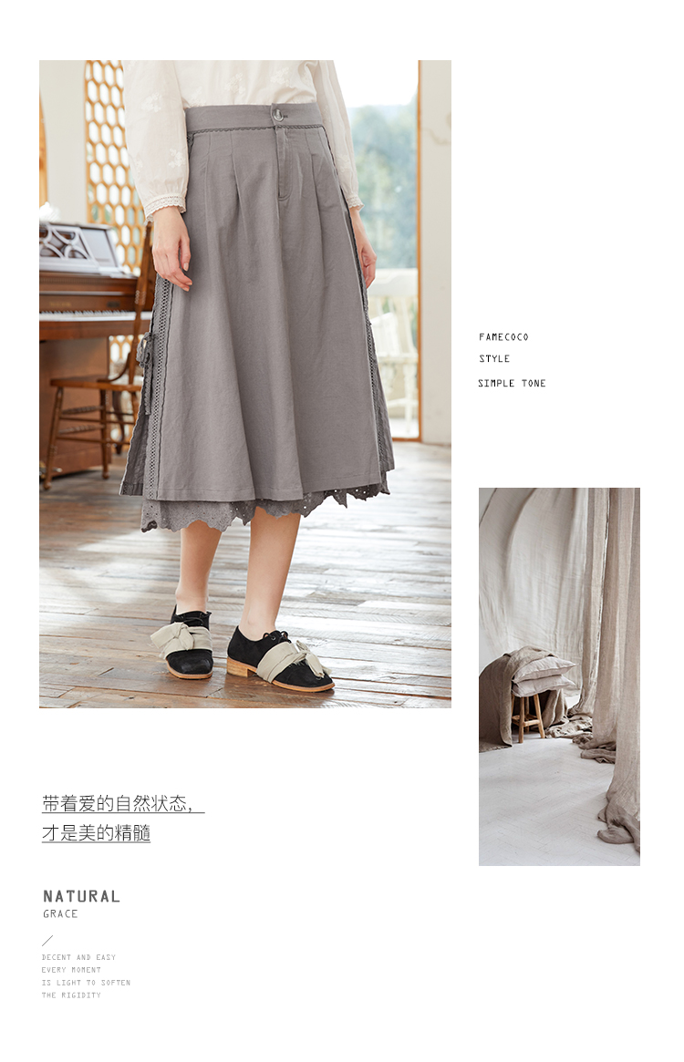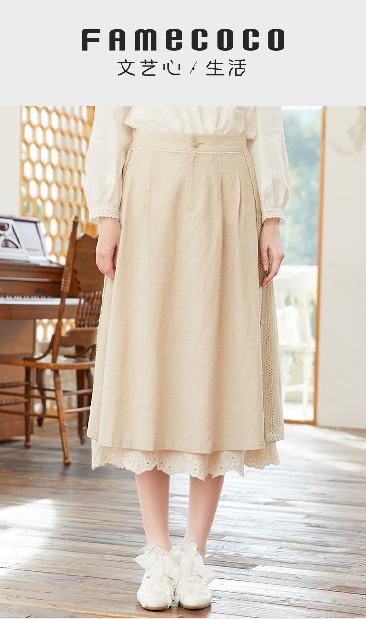 famecoco范可儿文艺棉麻半身裙女春季花边拼接宽松大摆裙FAB1HA014