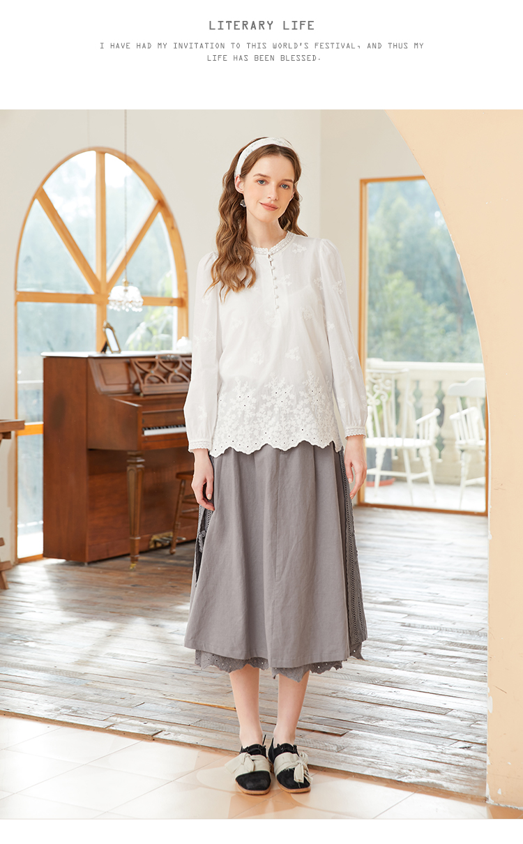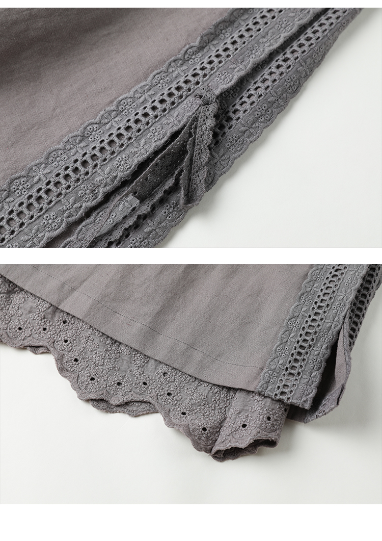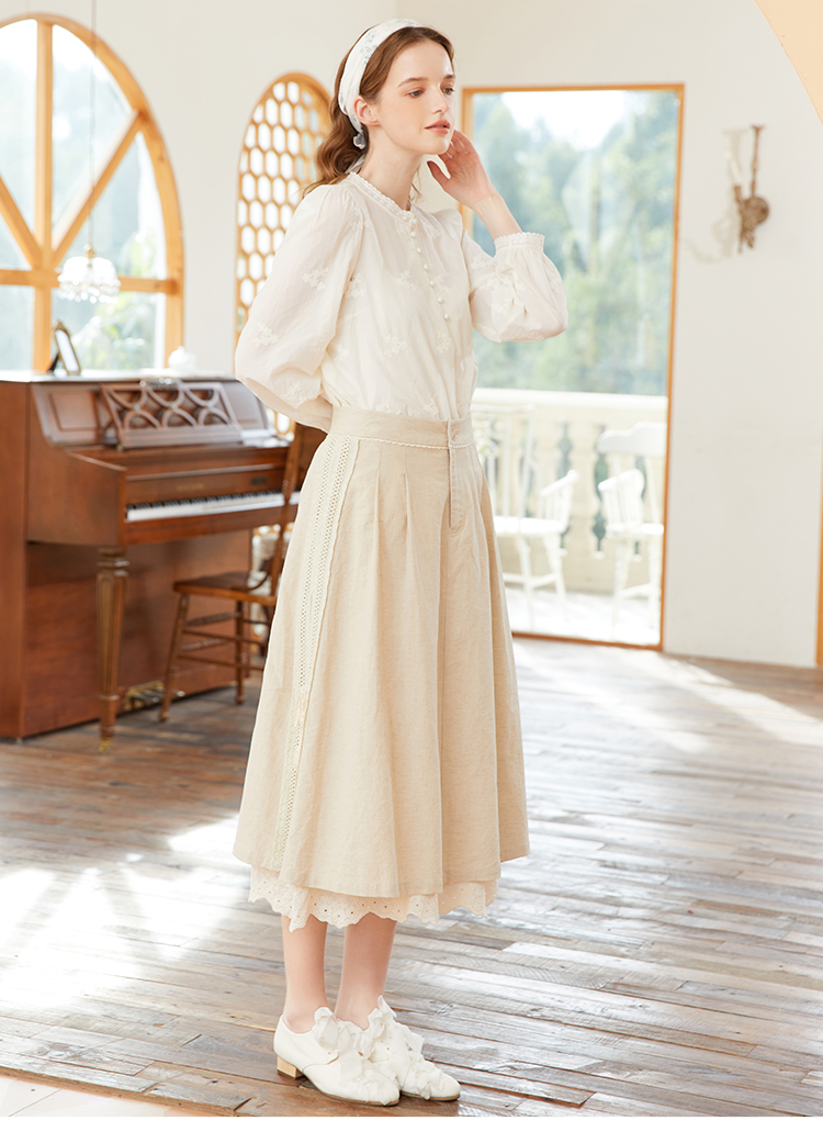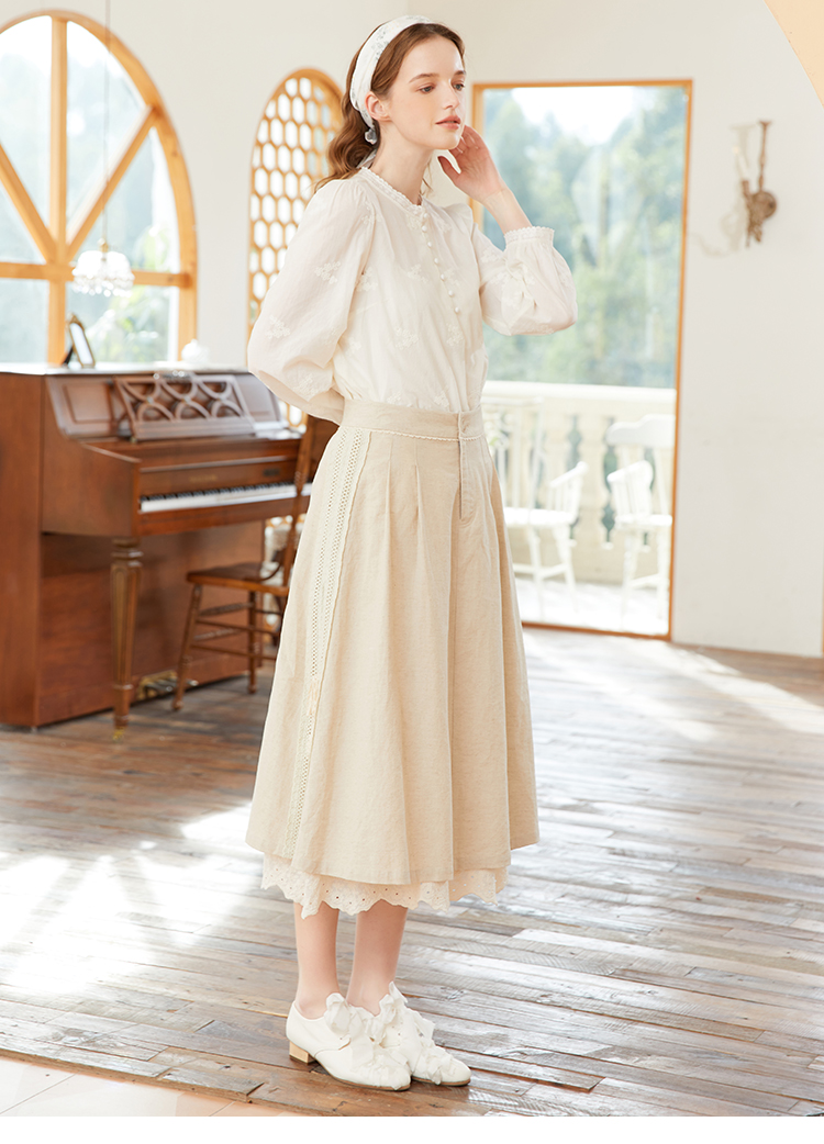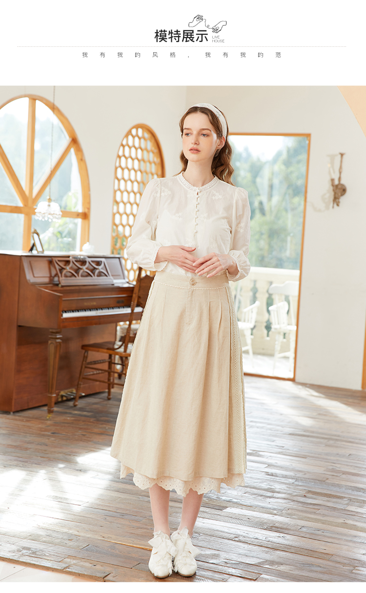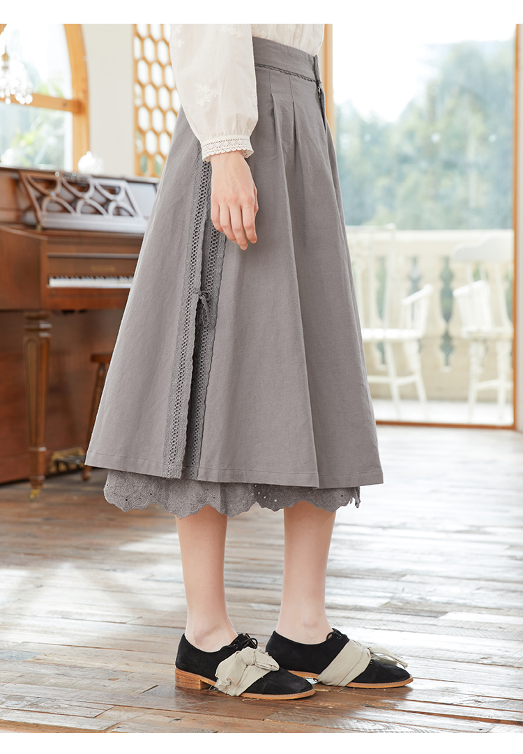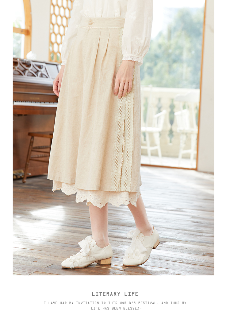 famecoco范可儿文艺棉麻半身裙女春季花边拼接宽松大摆裙FAB1HA014