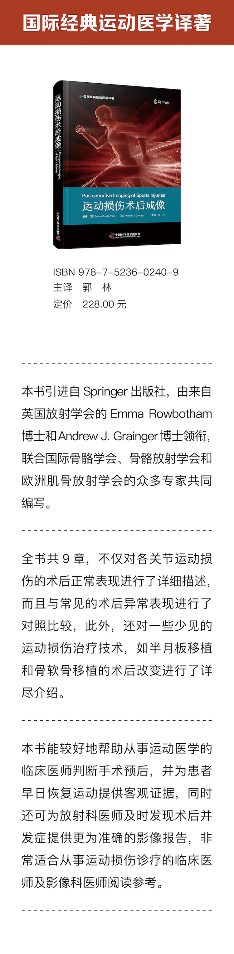 本书引进自 Springer 出版社,由来自英国放射学会的 Emma Rowbotham 博士和Andrew J. Grainger 博士领衔,联合国际骨骼学会、骨骼放射学会和欧洲肌骨放射学会的众多专家共同编写,是一部新颖实用的关节运动损伤术后影像学专著。全书共9 章,不仅对各关节运动损伤的术后正常表现进行了详细描述,而且与常见的术后异常表现进行了对照比较,此外,还对一些少见的运动损伤治疗技术,如半月板移植和骨软骨移植的术后改变进行了详尽介绍。本书内容实用、图文并茂,非常适合从事运动损伤诊疗的临床医师及影像科医师阅读参考。
