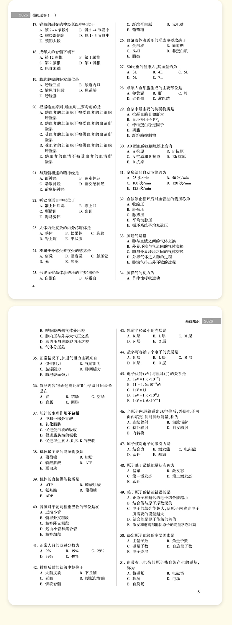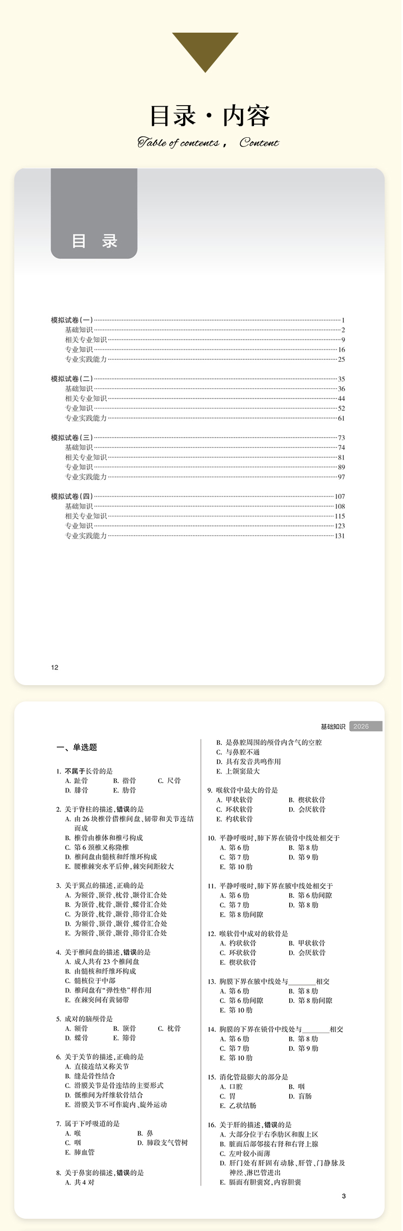 “全国卫生专业技术资格考试习题集丛书”以新考试大纲和全国卫生专业技术资格考试用书编写专家委员会编写的考试指导为依据,编写工作遵循科学、严谨、客观、规范的原则,严格按照实际考试的科目划分和题型分布进行编写,切实考查考生对知识点的掌握程度和专业水平。本系列丛书包括《同步习题与全真模拟》《同步习题集》《模拟试卷》等,能够有效帮助考生考前复习、自测和反馈学习成果。《模拟试卷》全面模拟考试真题,针对考生临考备战进行综合性巩固。题目难度和题型分布参考实际考试情况设定。除附参考答案外,部分重点、难点问题附有解析。每套试卷根据试题不同的难易度设置了不同的建议完成时间,仿真度高,是考前冲刺的重要用书。