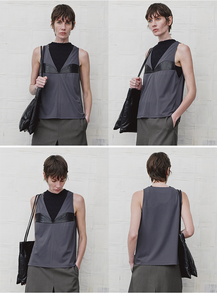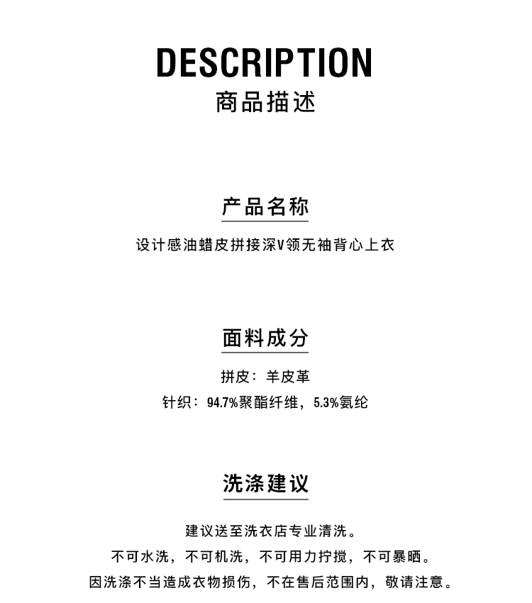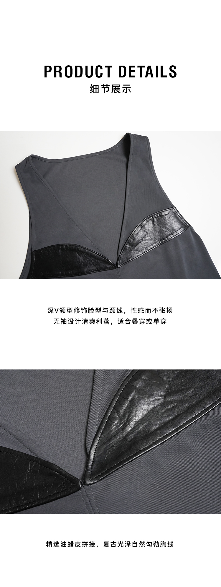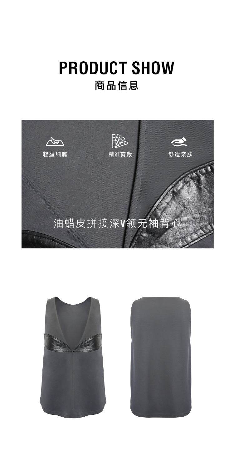 HIDEMI 设计感油蜡皮拼接套装深V领无袖背心上衣
