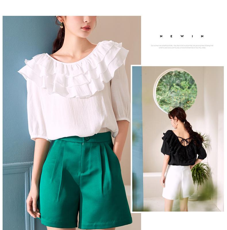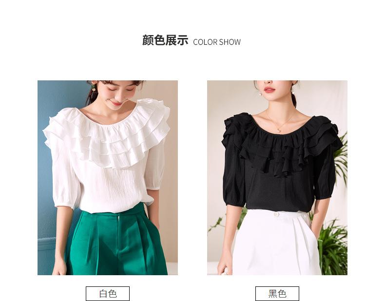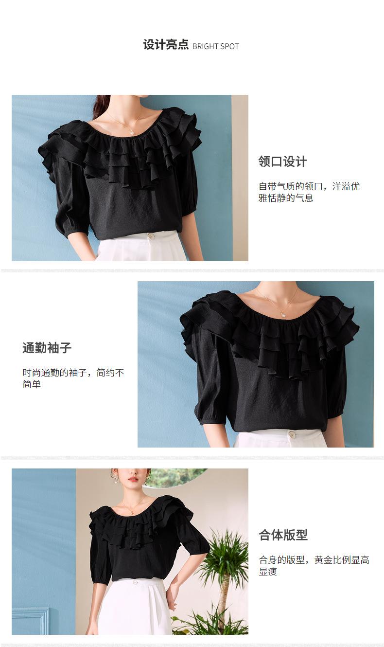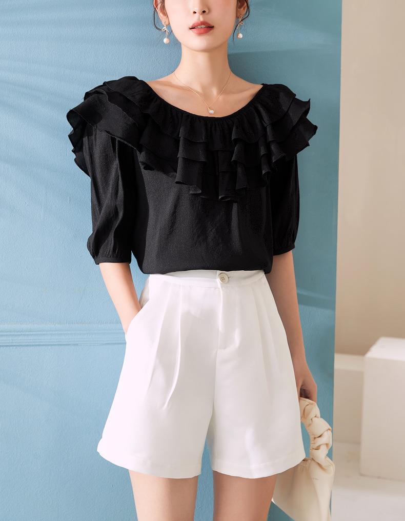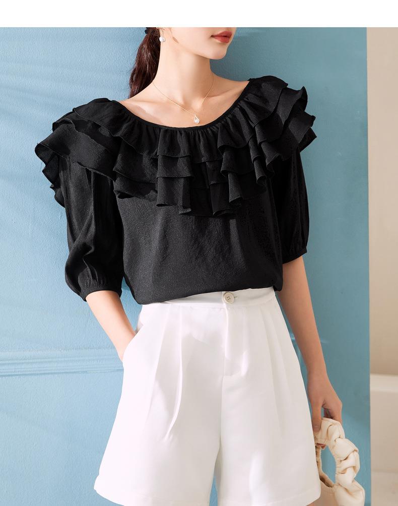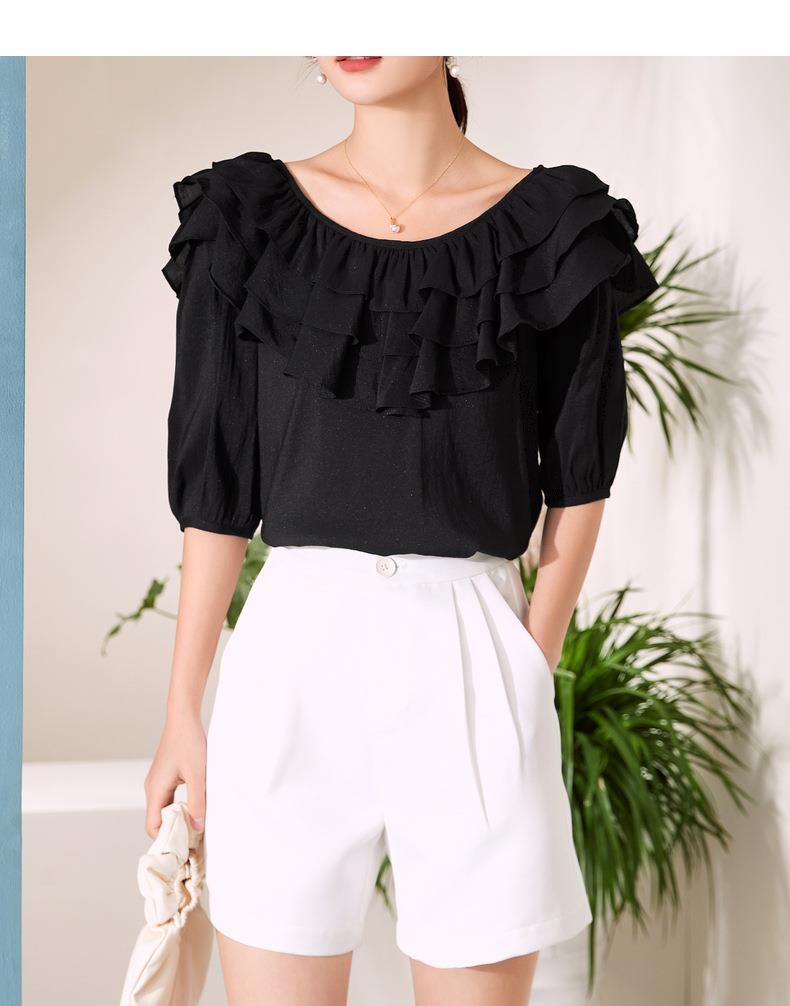 百姿 新款时尚荷叶边上衣气质露背短袖雪纺衫女231127