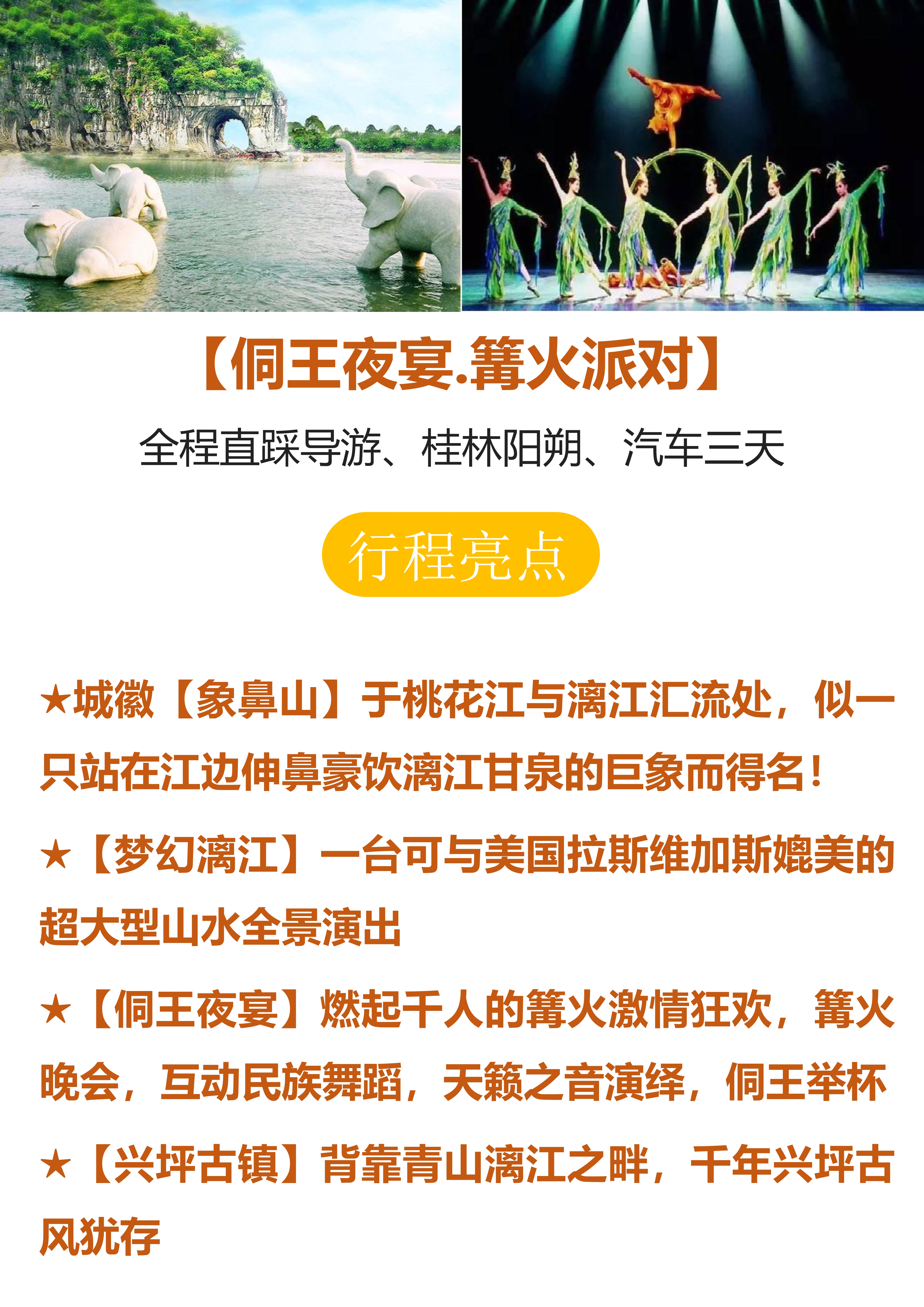 【侗王夜宴.篝火派对】 全程直踩导游、广西桂林阳朔、汽车三天