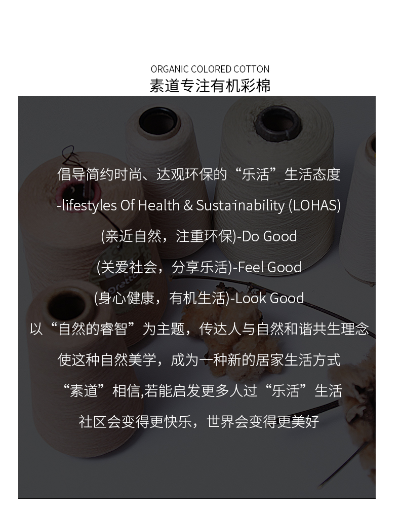 - 素道有机彩棉,源自2005年的健康纺织品牌,为上百万户家庭解决“穿”的健康、“用”的放心的问题。