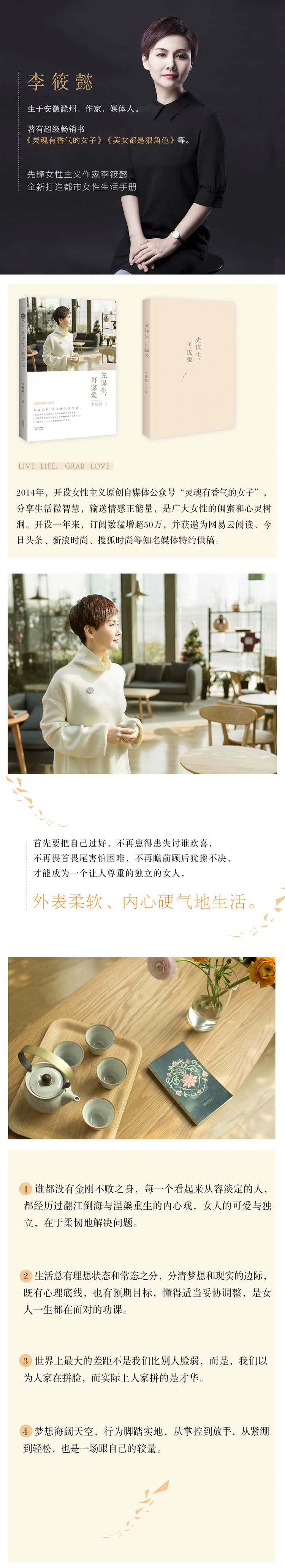 ◇这不是鸡汤,它给了你喝汤的勺子。作为所有女性的树洞和闺蜜,李筱懿在她的文章中为所有在生活里遇到困惑的女孩,提供了解决问题的方法,指明了雷区。她用名人或身边人的故事细细讲述事业与爱情的关系该如何平衡,闺蜜之间的关系该如何处理,现实生活中如何坚持自我,以及实现梦想……好生活就在眼前,好爱情还会远吗?