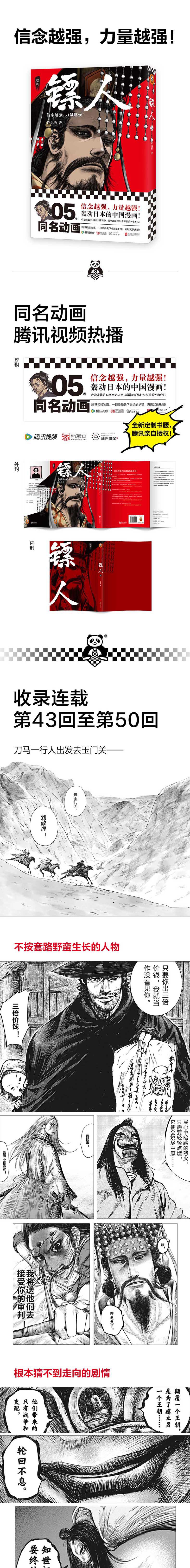 1. 轰动日本的中国漫画!《镖人》第五册轰动上市! 2. 3次登上日本央视NHK电视台新闻报道节目,被日本媒体誉为“太阳系级别的中国动漫精品”! 日文&韩文单行本热卖中! 3. 征服日本知名漫画编辑!双叶社(代表作《蜡笔小新》)前主编栗原一二、小学馆(代表作《名侦探柯南》)前主编御木基宏连连称赞! 4. 漫画大师高桥留美子(代表作《犬夜叉》)、藤泽亨(代表作《麻辣教师GTO》),知名作家马伯庸,《大圣归来》总导演田晓鹏,实力派演员万茜鼎力推荐! 5. 新漫画、有妖气、快看漫画、腾讯动漫、网易漫画等十余家国内漫画阅读平台及日本知名电子阅读平台全好评连载中! 6. 新增36页未公开神秘番外&后记,随书附赠精美海报。 7. 信念越强,力量越强!