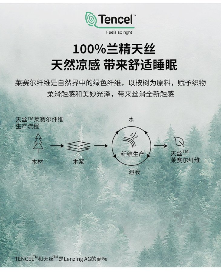 非常适合四季使用的面料比纯棉更凉爽 天丝的导热系数比棉强许多,触感凉爽丝滑比纯棉更柔软 纯棉的表面粗糙度为3.46,而天丝的度仅为0.628,触感更加细腻柔软,轻如无物比纯棉更透气 吸湿性能优越,和阴雨天、梅雨季更配。纯棉透气性在200-500之间,而天丝可以达到1500。 上色采用的是新一代活性印染工艺,这是一种健康环保染色方式。