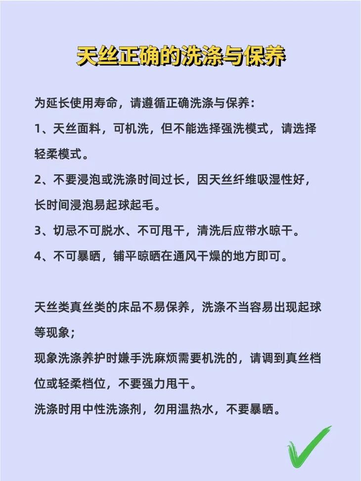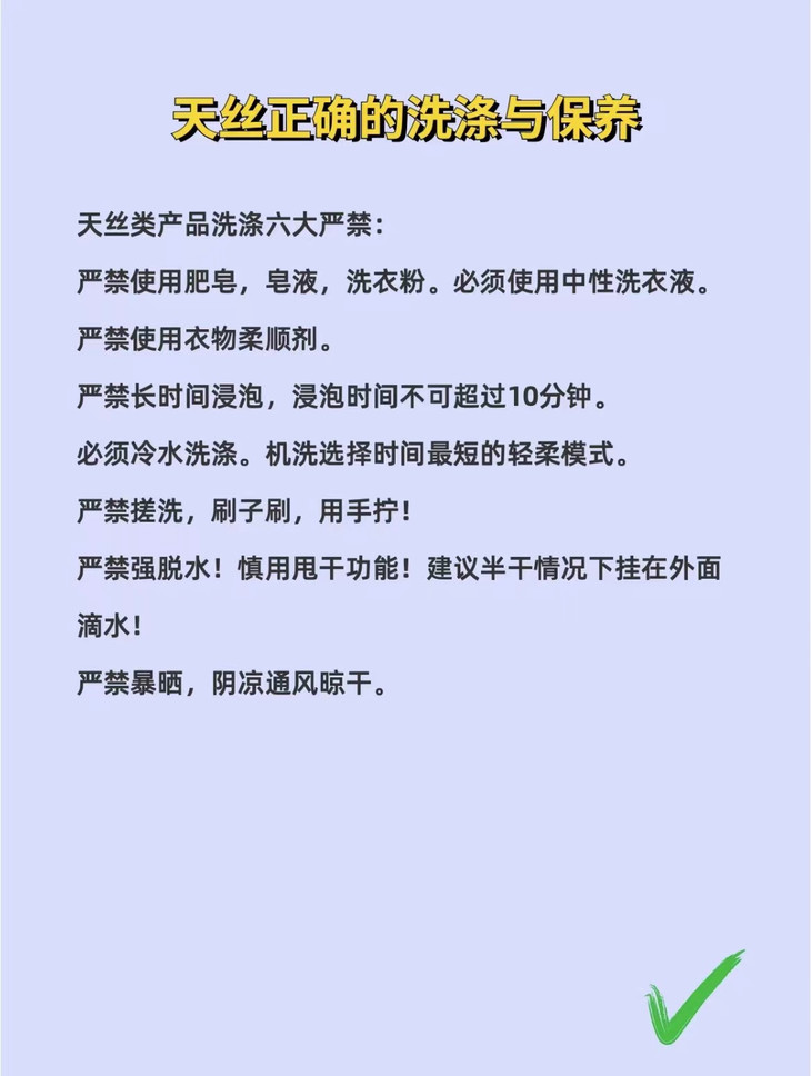 🔺关于洗涤——天丝一些洗涤保养方式 敲重要‼不要洗“废”啦‼ PPS:天丝它的吸水性比较好,是棉的三倍,所以它洗涤的时候啊 💥💥尽量不要超过15分钟!!💥💥水洗温度不要超过30度!! 因为吸水性比较好,浸泡时间长的话 💥会使植物纤维胀开!! 💥会使纱线稍微变粗!! 💥会导致它的手感会变硬!! 💥超过30度也会导致天丝的面料纤维的那个膨胀变形变硬!! 同时,酸碱性洗涤剂,高温洗涤,长久浸泡,阳光直晒 都会有加大天丝纤维损伤,膨胀,硬化和色泽度降低的风险喔