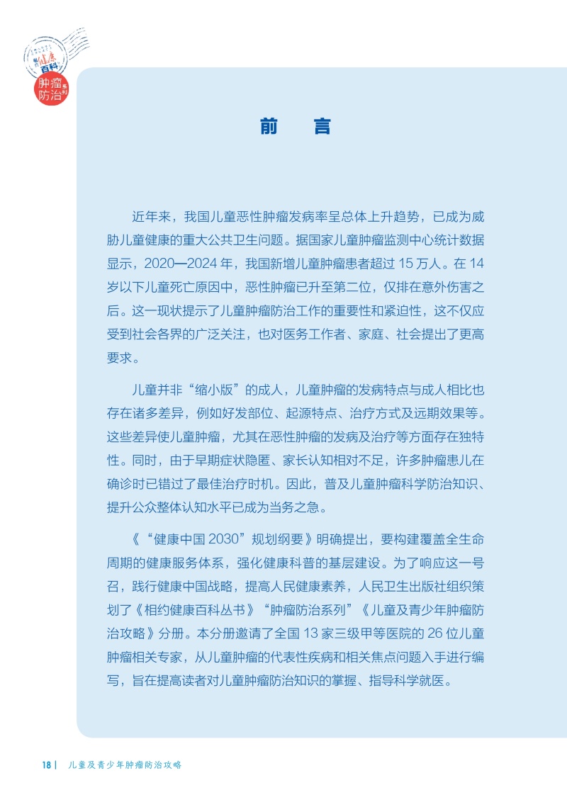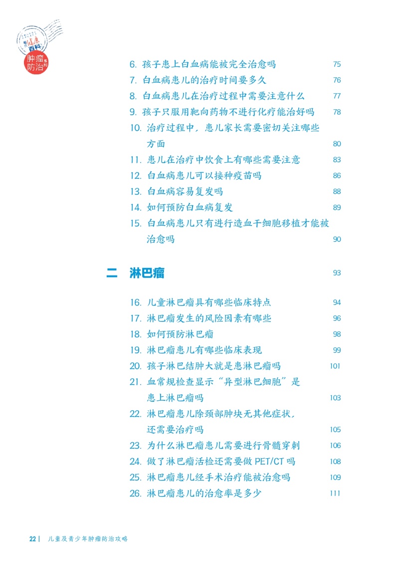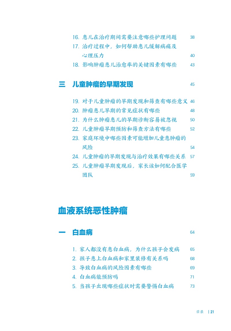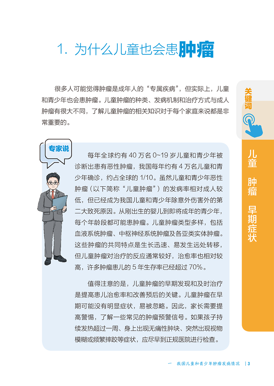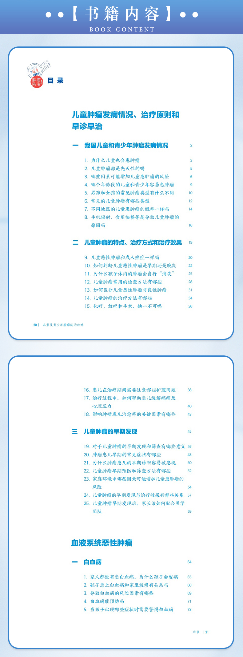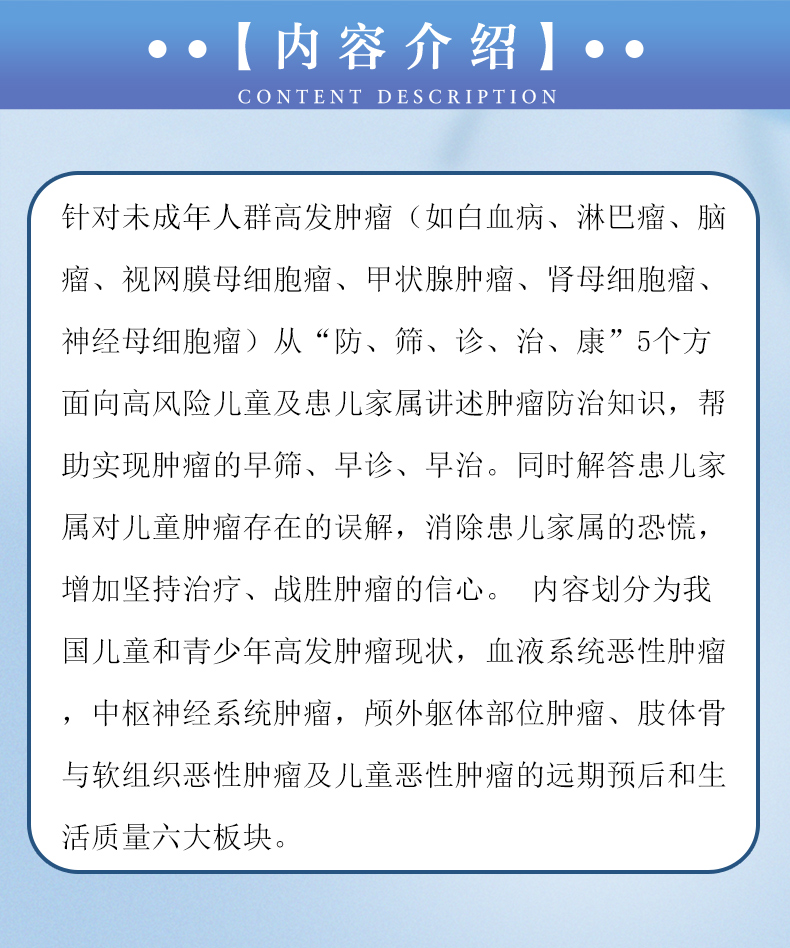 针对未成年人群高发肿瘤(如白血病、淋巴瘤、脑瘤、视网膜母细胞瘤、甲状腺肿瘤、肾母细胞瘤、神经母细胞瘤)从“防、筛、诊、治、康”5个方面向高风险儿童及患儿家属讲述肿瘤防治知识,帮助实现肿瘤的早筛、早诊、早治。同时解答患儿家属对儿童肿瘤存在的误解,消除患儿家属的恐慌,增加坚持治疗、战胜肿瘤的信心。 内容划分为我国儿童和青少年高发肿瘤现状,血液系统恶性肿瘤,中枢神经系统肿瘤,颅外躯体部位肿瘤、肢体骨与软组织恶性肿瘤及儿童恶性肿瘤的远期预后和生活质量六大板块。