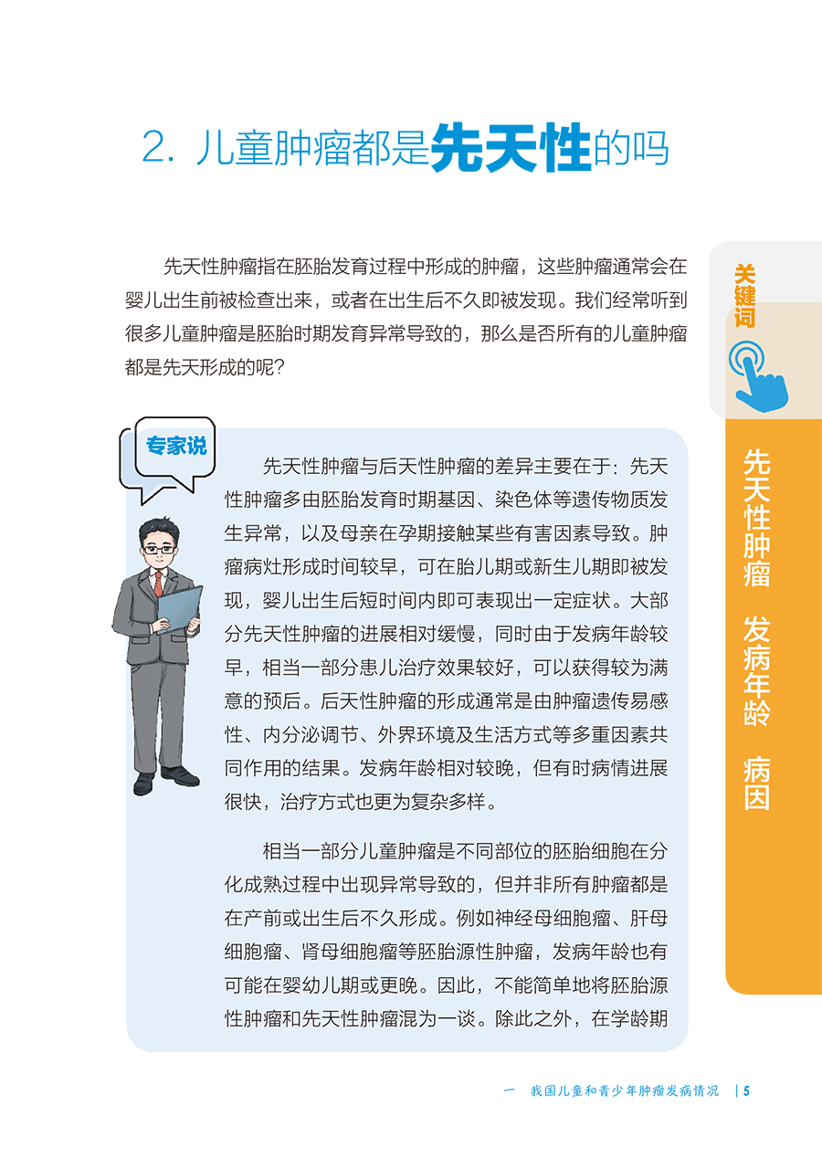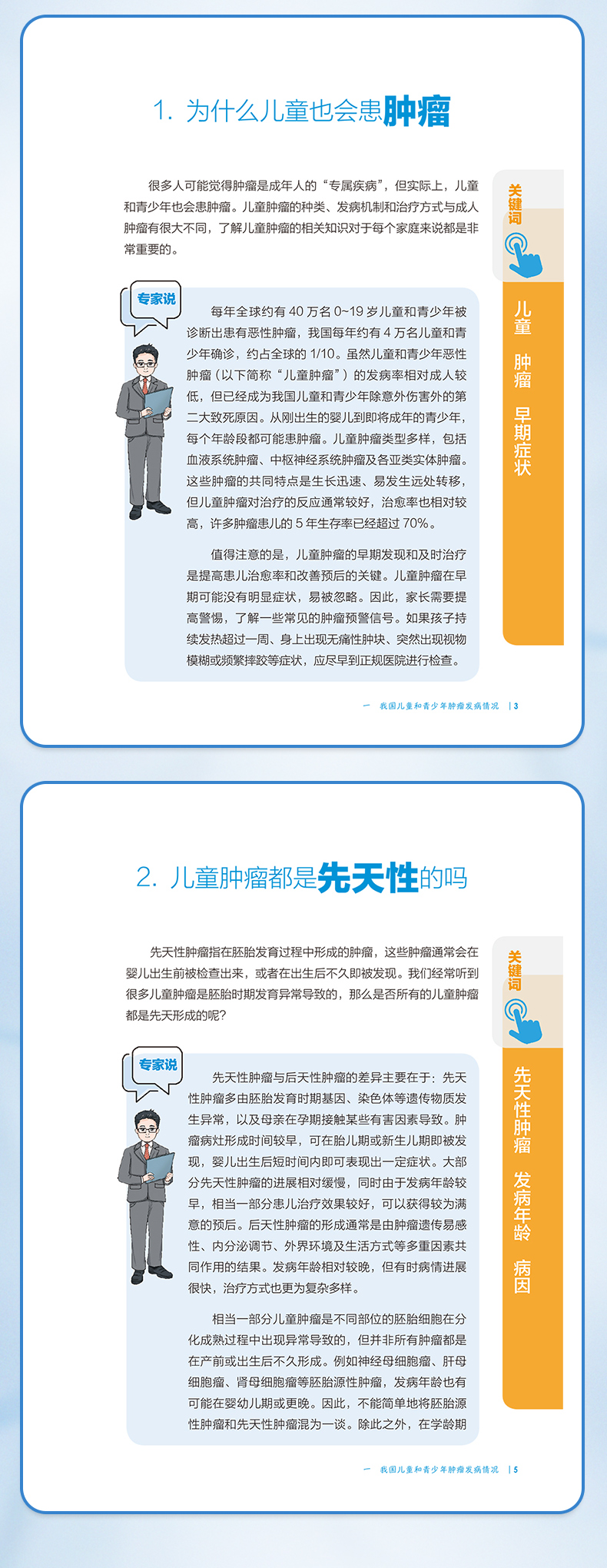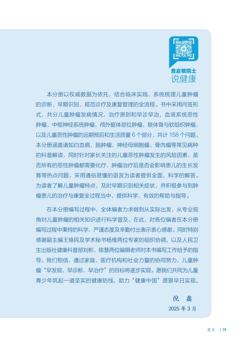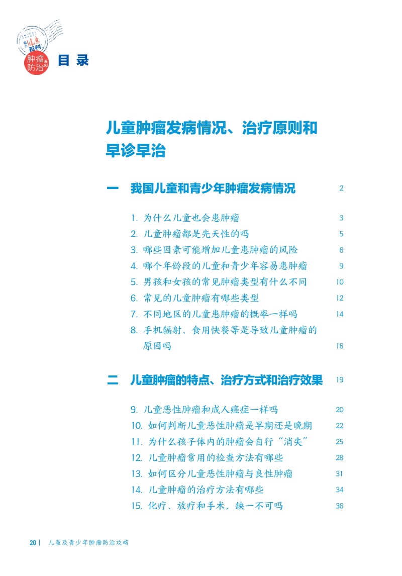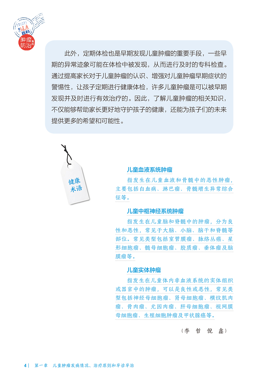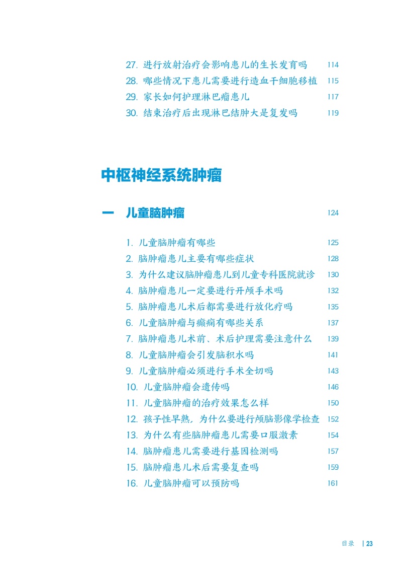 针对未成年人群高发肿瘤(如白血病、淋巴瘤、脑瘤、视网膜母细胞瘤、甲状腺肿瘤、肾母细胞瘤、神经母细胞瘤)从“防、筛、诊、治、康”5个方面向高风险儿童及患儿家属讲述肿瘤防治知识,帮助实现肿瘤的早筛、早诊、早治。同时解答患儿家属对儿童肿瘤存在的误解,消除患儿家属的恐慌,增加坚持治疗、战胜肿瘤的信心。 内容划分为我国儿童和青少年高发肿瘤现状,血液系统恶性肿瘤,中枢神经系统肿瘤,颅外躯体部位肿瘤、肢体骨与软组织恶性肿瘤及儿童恶性肿瘤的远期预后和生活质量六大板块。