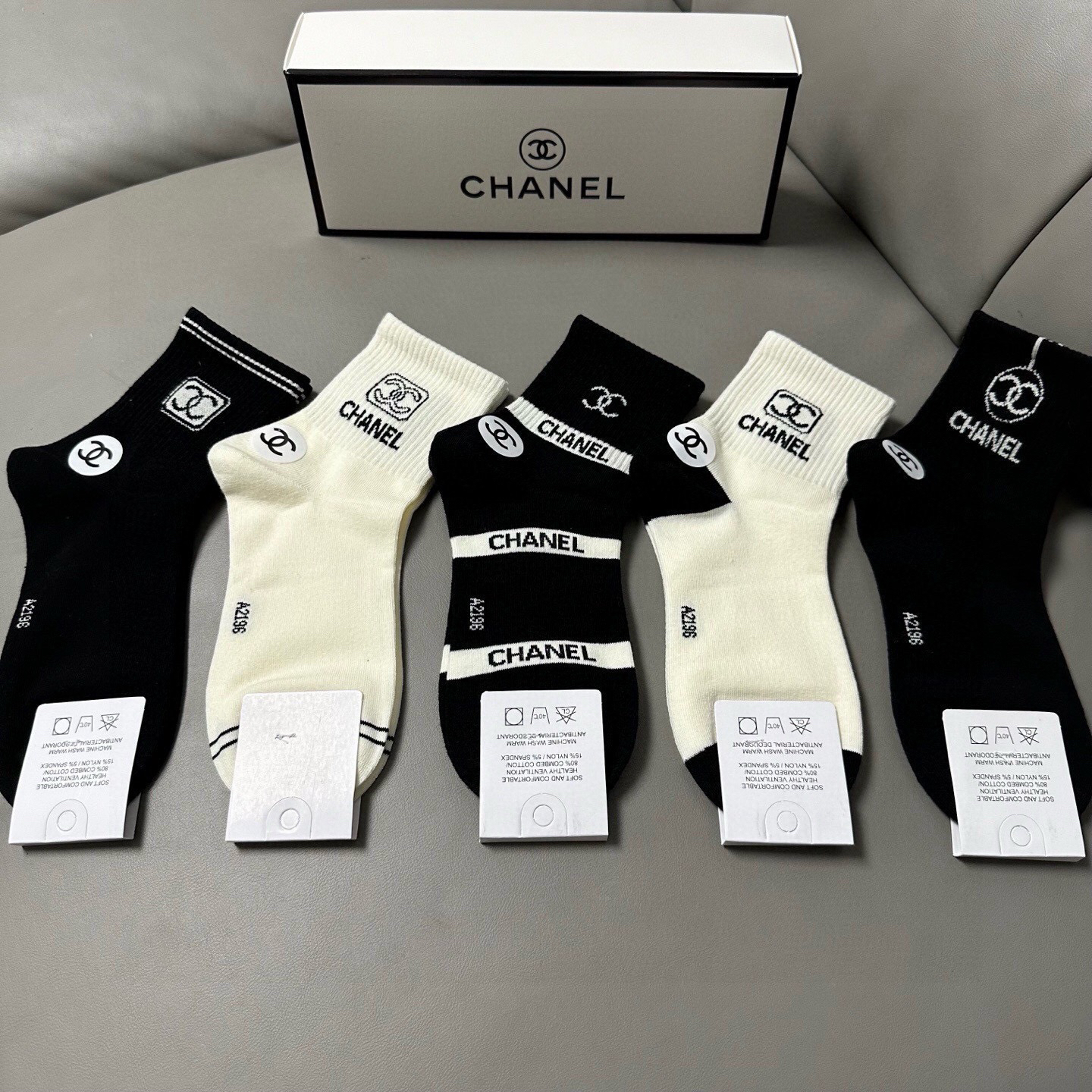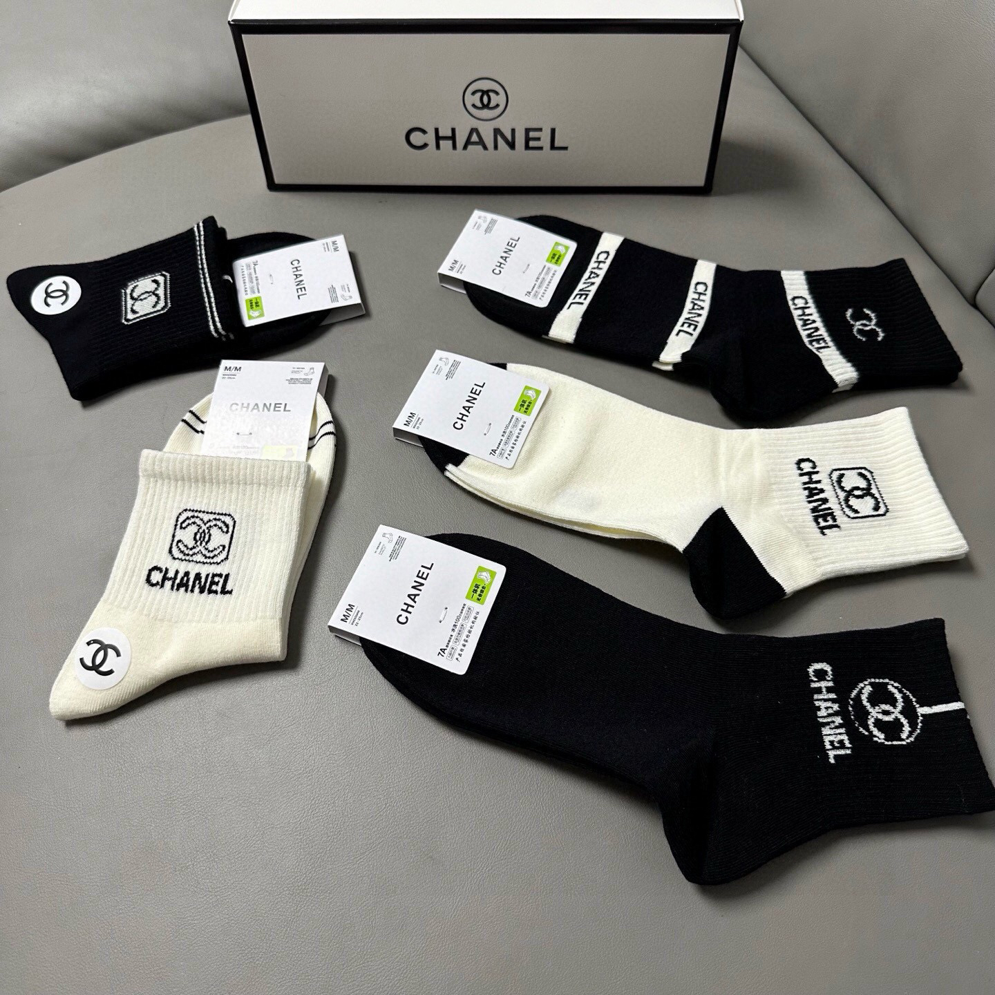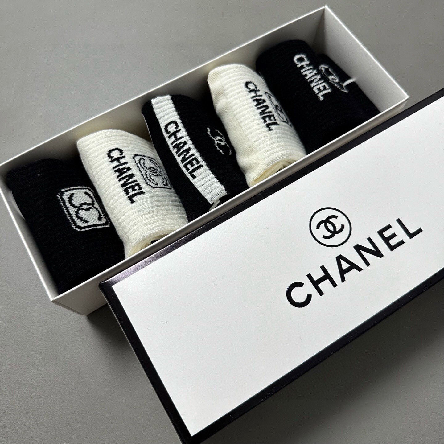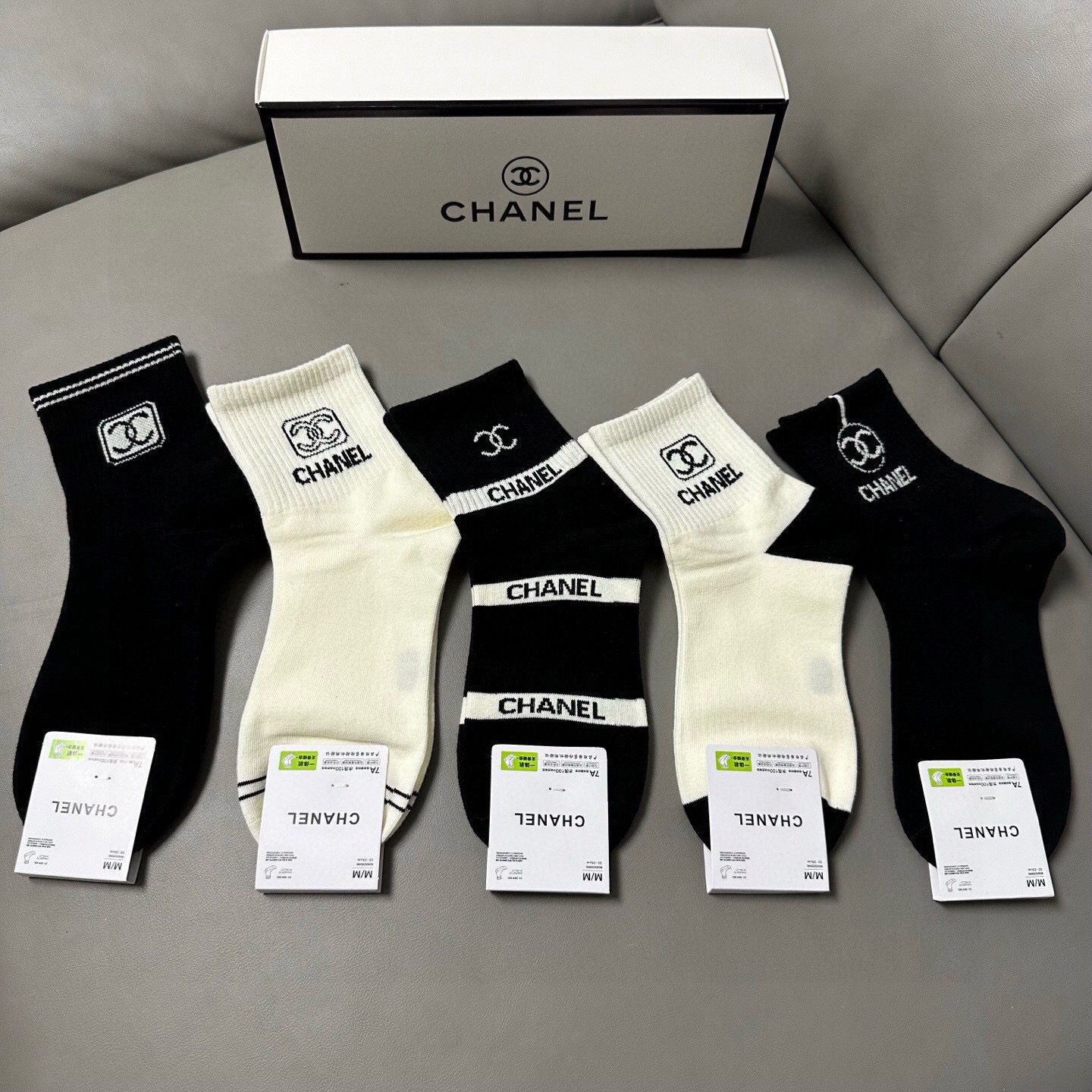 秋冬特惠💰130 香奈儿袜子 香奶奶家新品女款中筒袜子【一盒五双】纯棉材质,柔软舒适透气,提花经典标志,炒鸡nice,大牌出街,潮人必备 超好搭