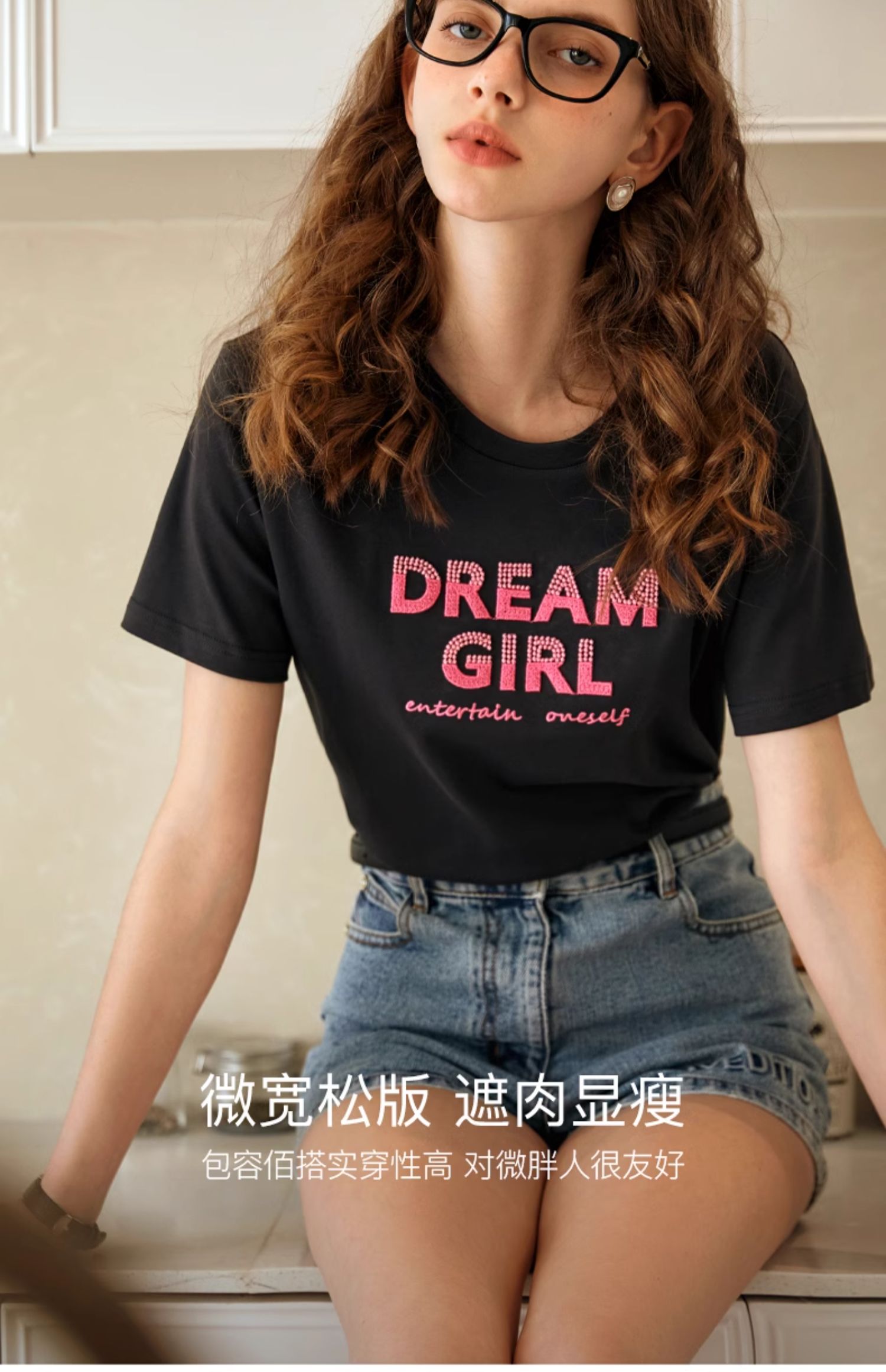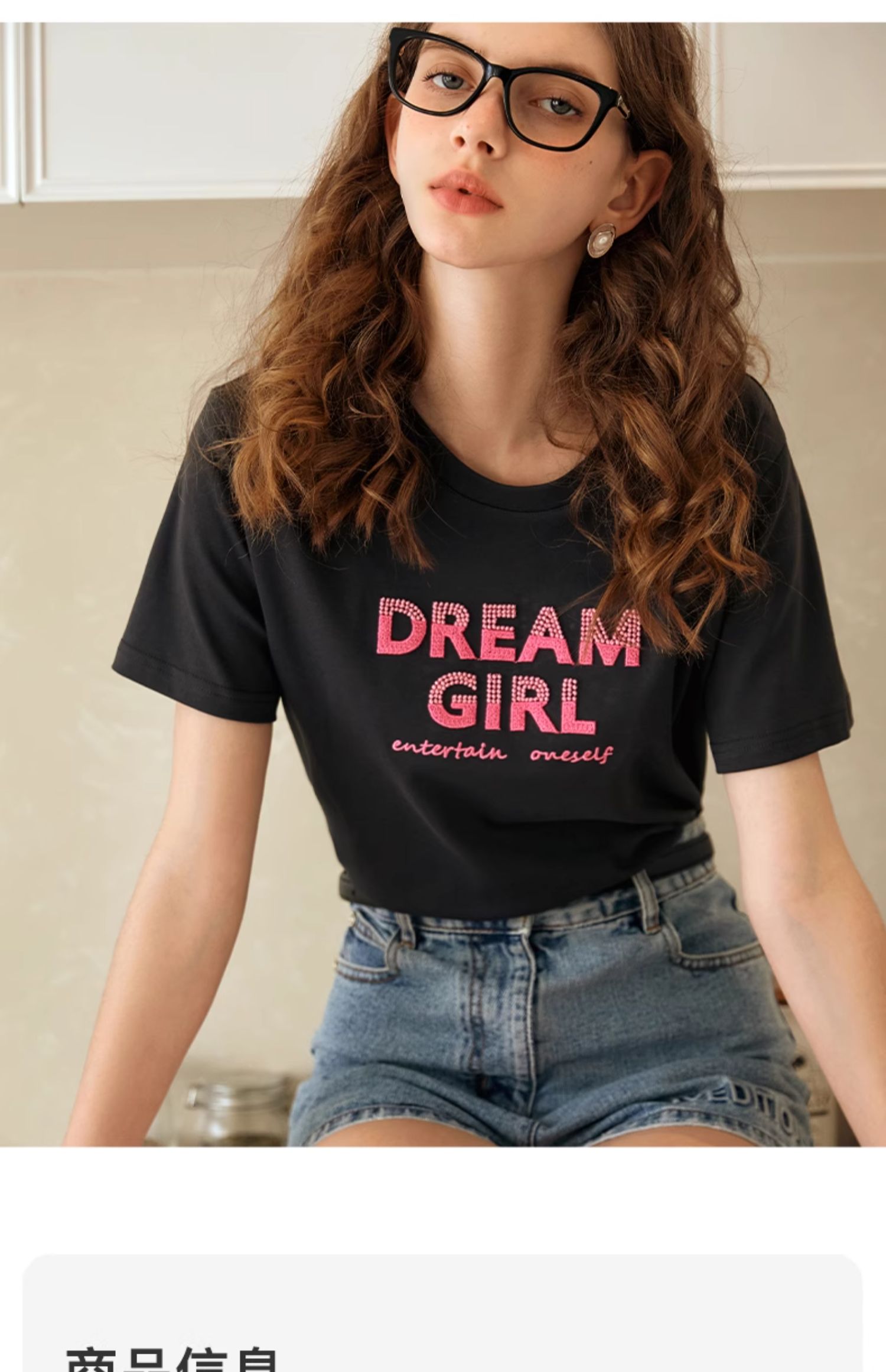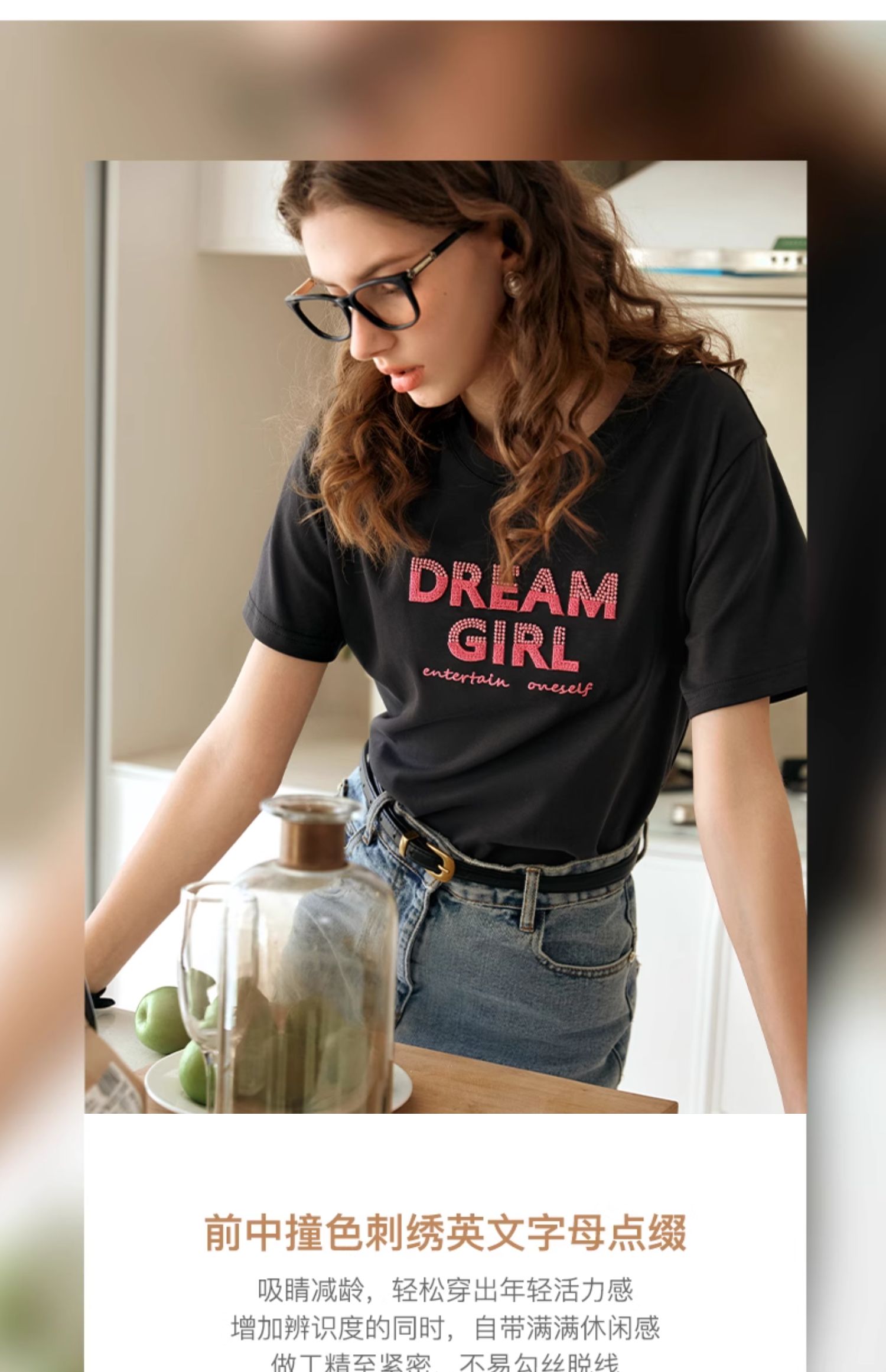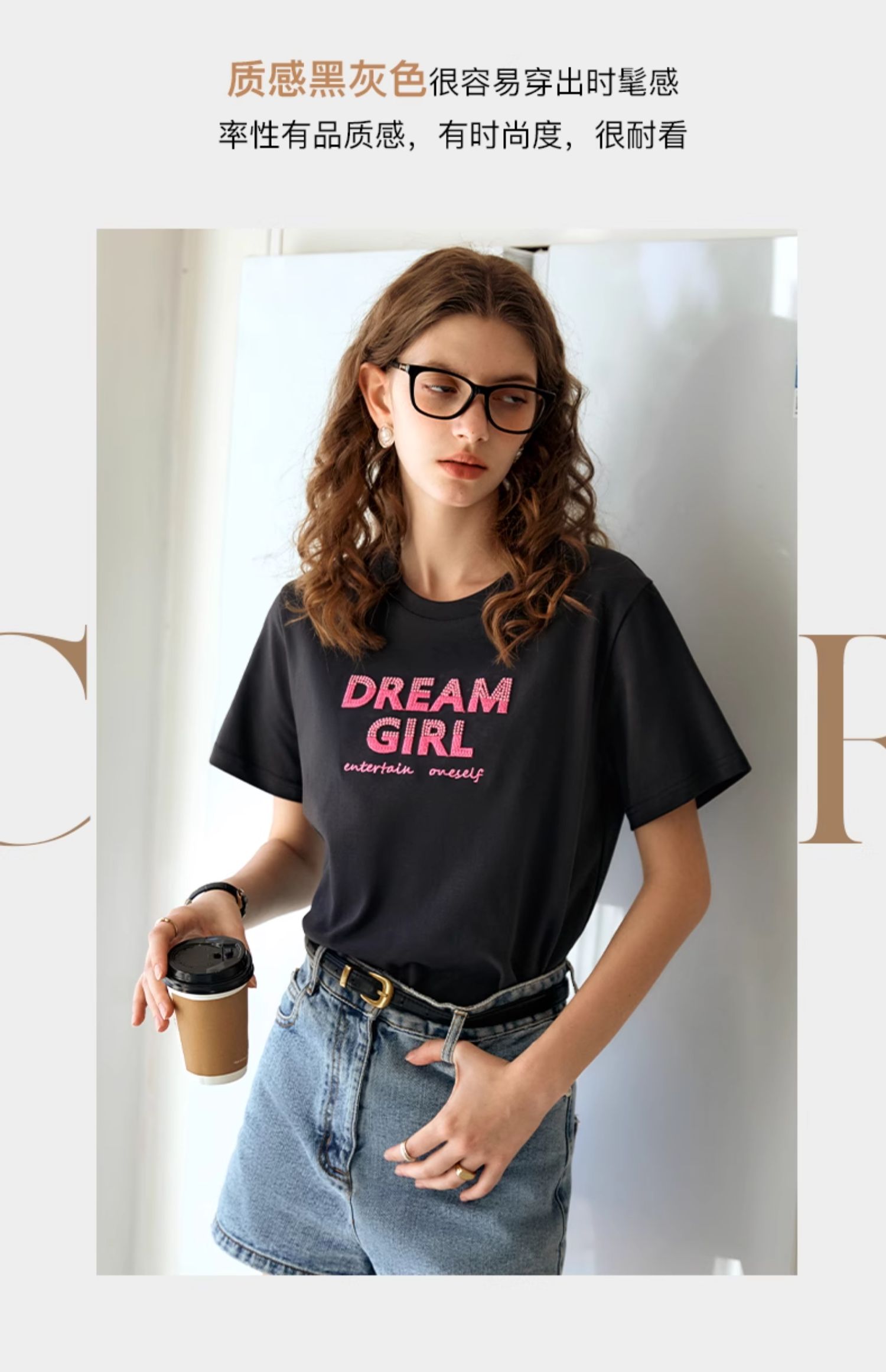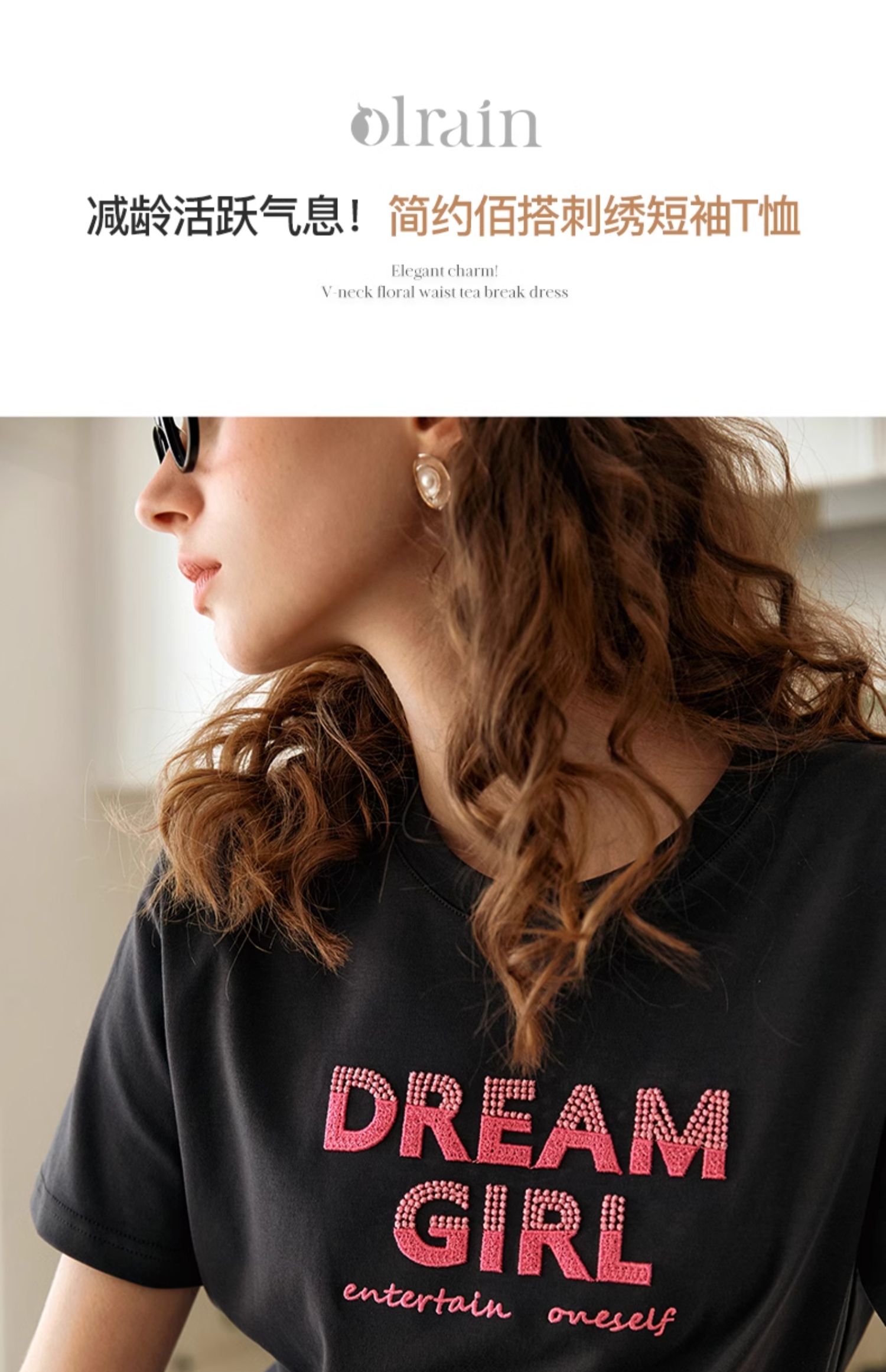 OLrain欧芮儿黑灰色T恤女夏季2024年新款美式复古百搭印花短袖