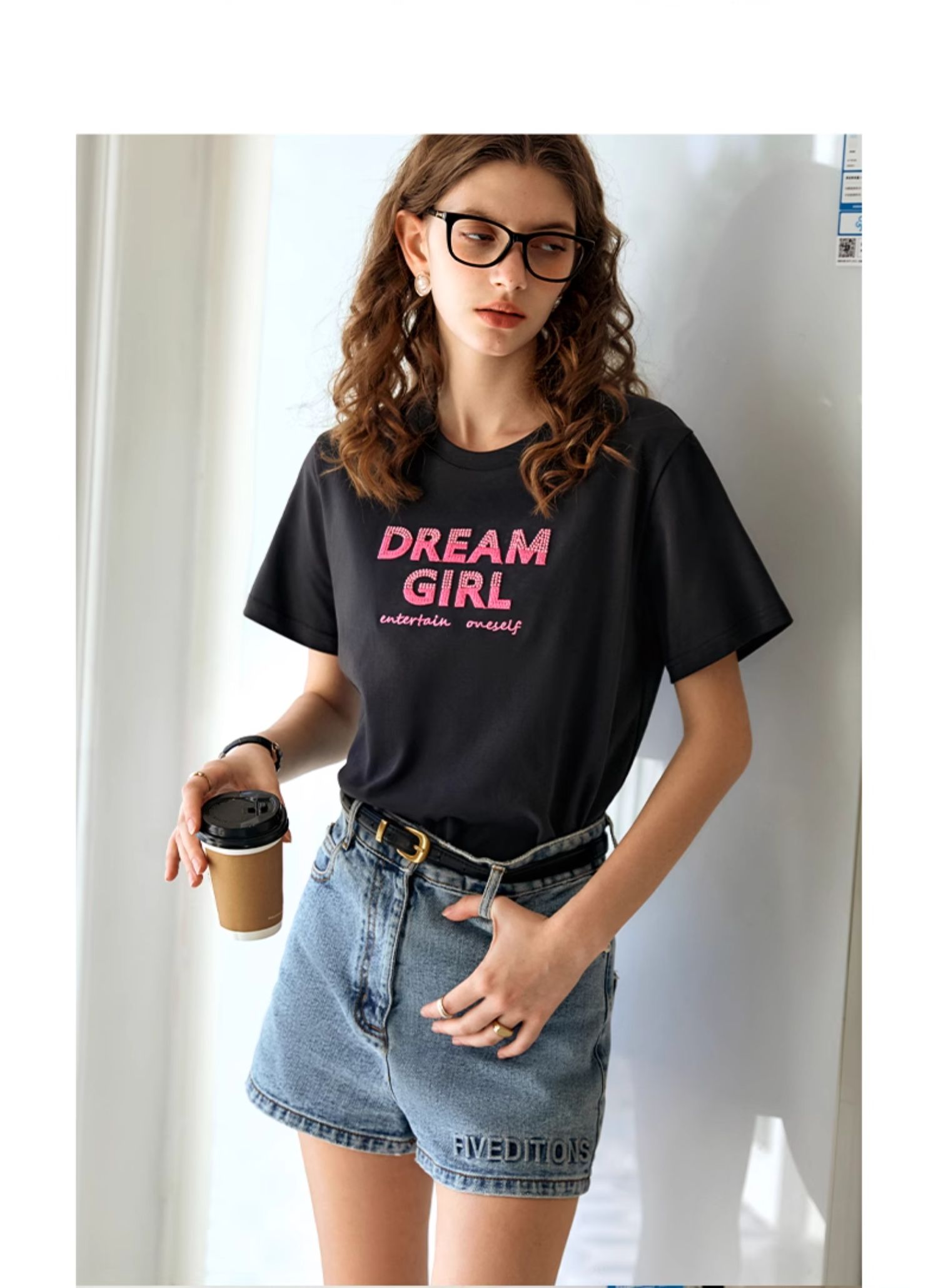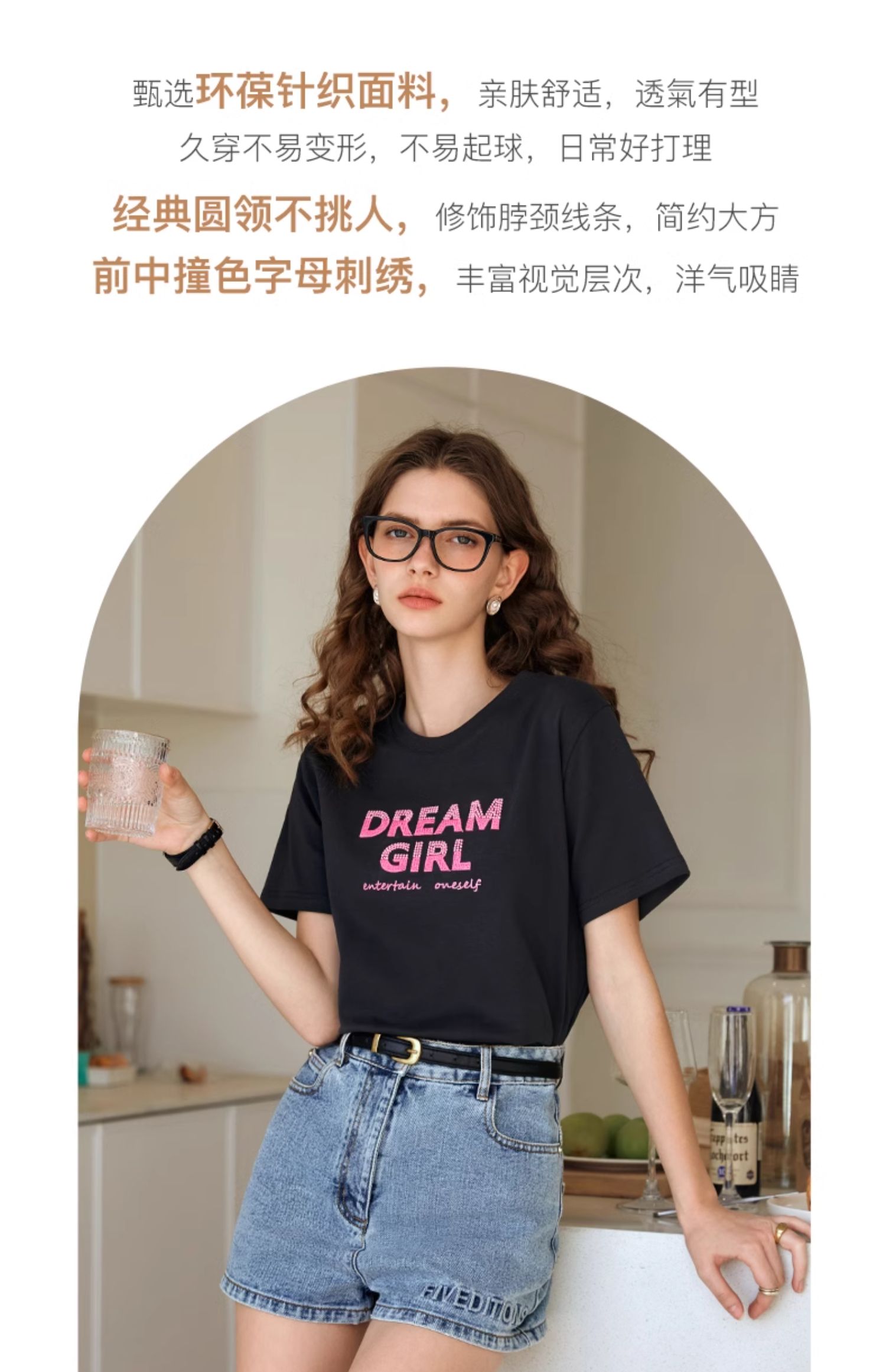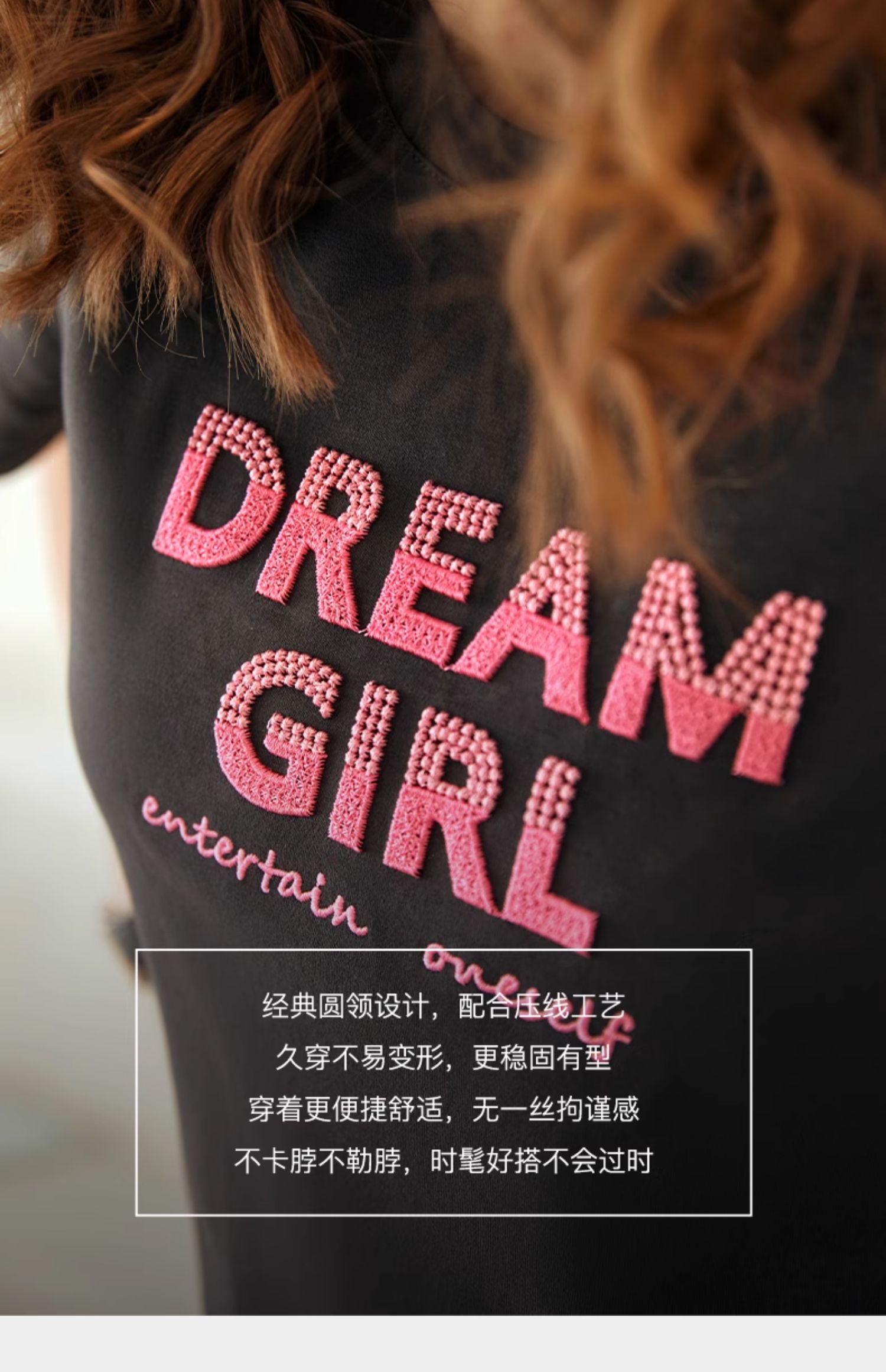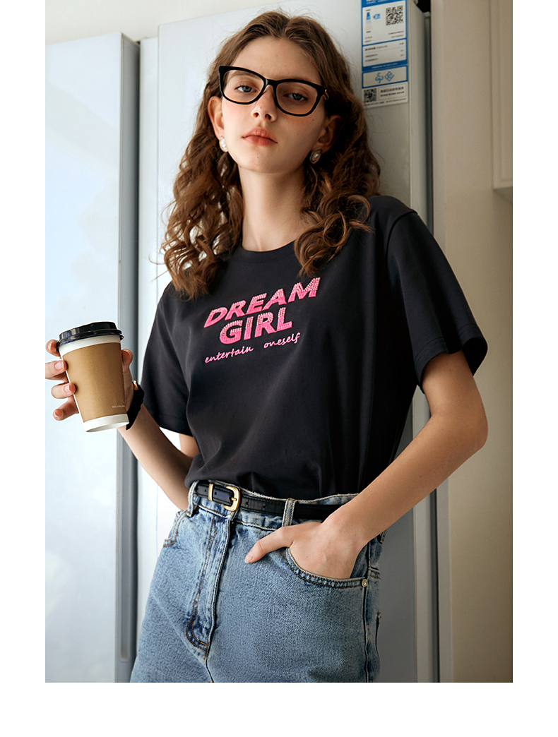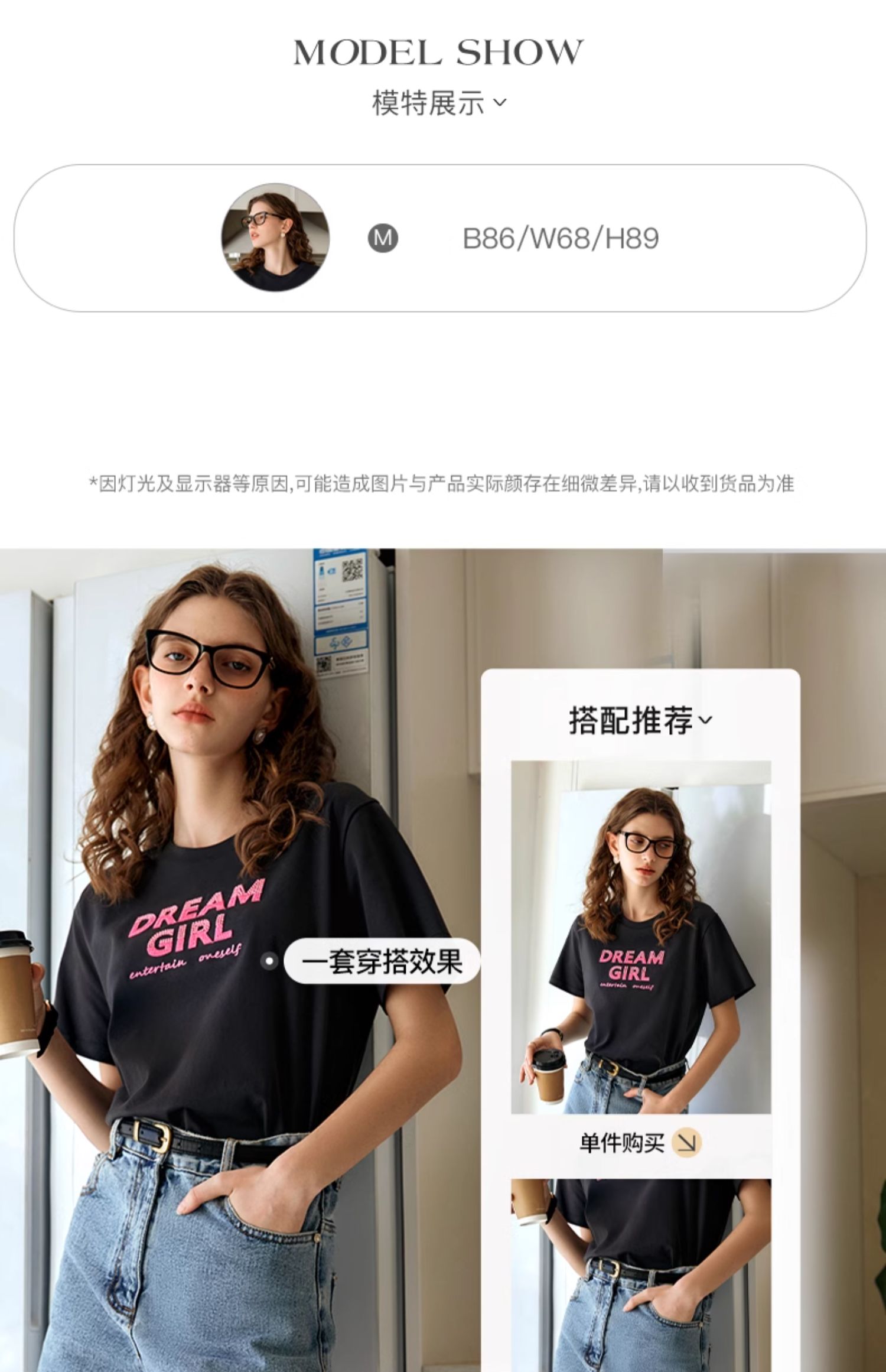 OLrain欧芮儿黑灰色T恤女夏季2024年新款美式复古百搭印花短袖