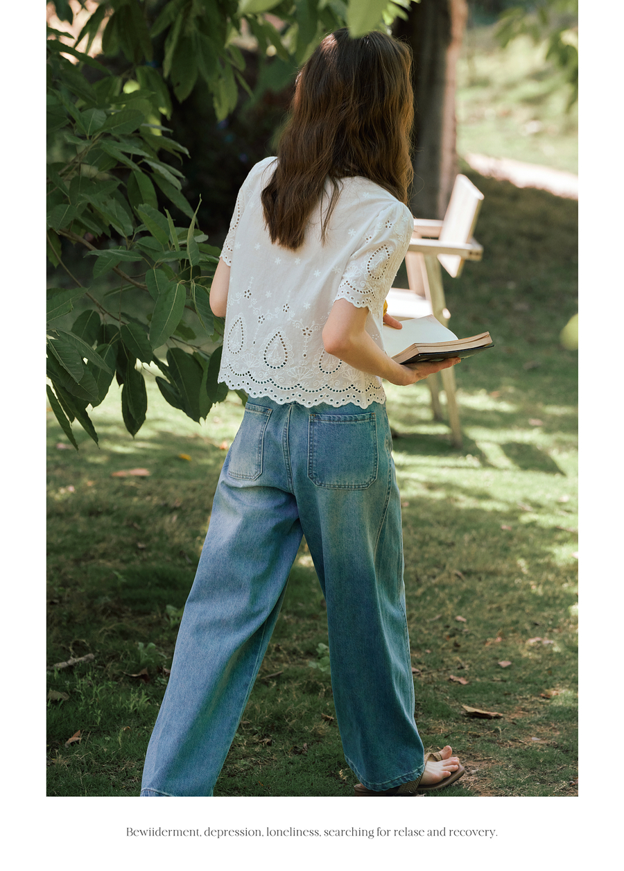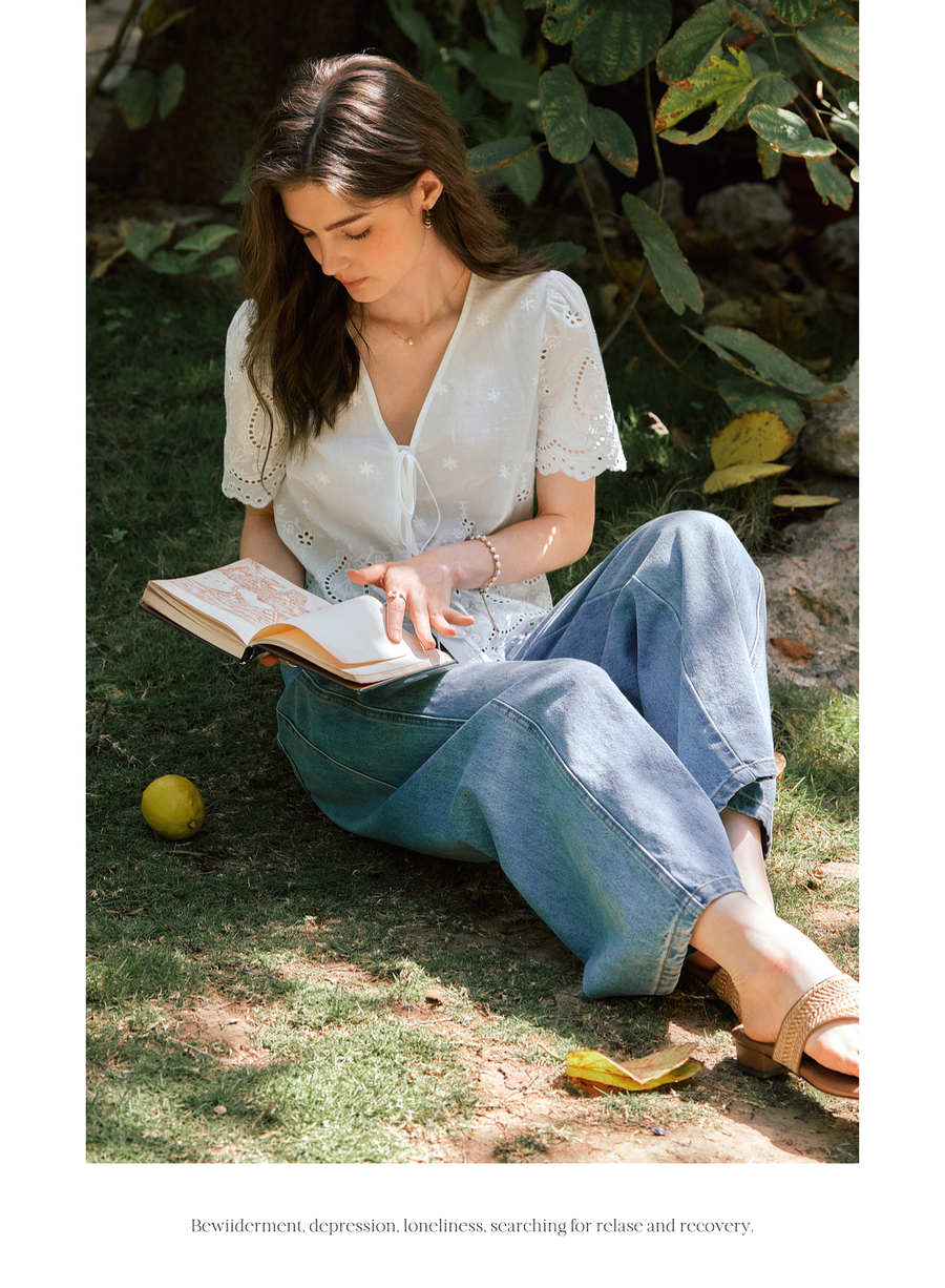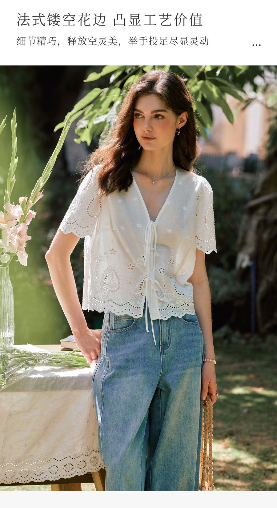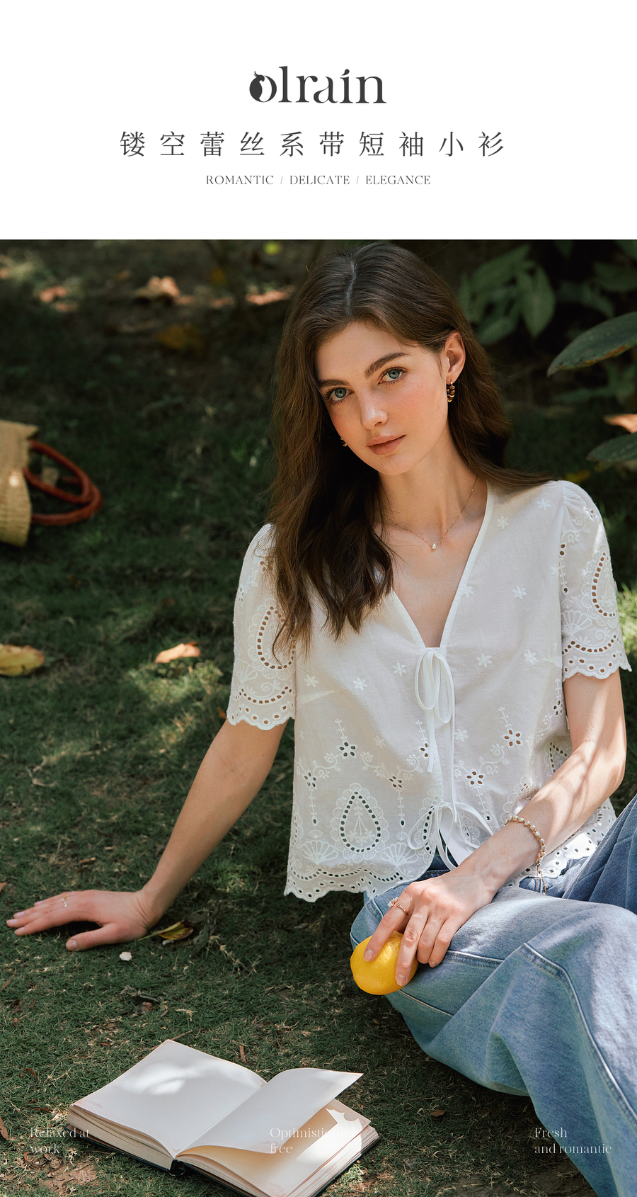 OLrain欧芮儿镂空蕾丝系带短袖小衫女夏季2025新款小个子雪纺衫