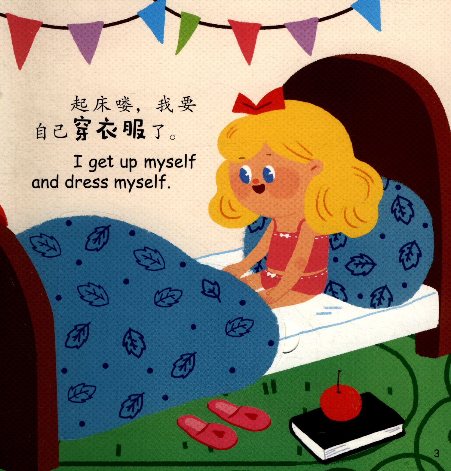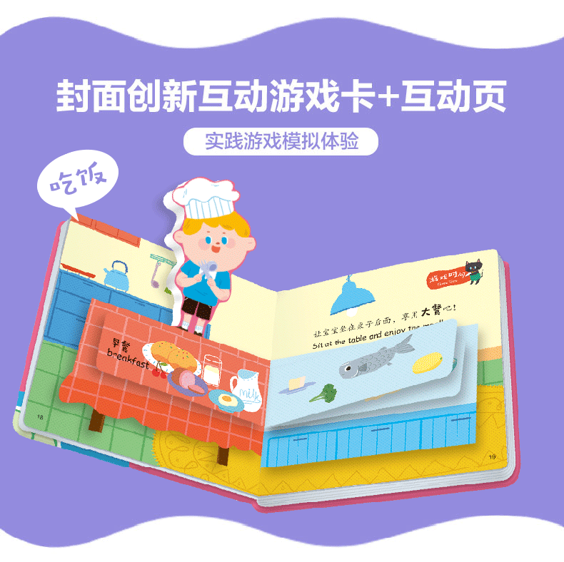 小朋友1秒就被封面里可以取出的小配件吸引,拿着在游戏里玩了好一会儿,内页画面非常可爱,跟着主角学做各种事情,掌握穿衣服、拉粑粑等等日常生活的规则,画面中标注了很多地道的英语双语,翻页内容也十分丰富,制作真是很用心。——如云麻麻